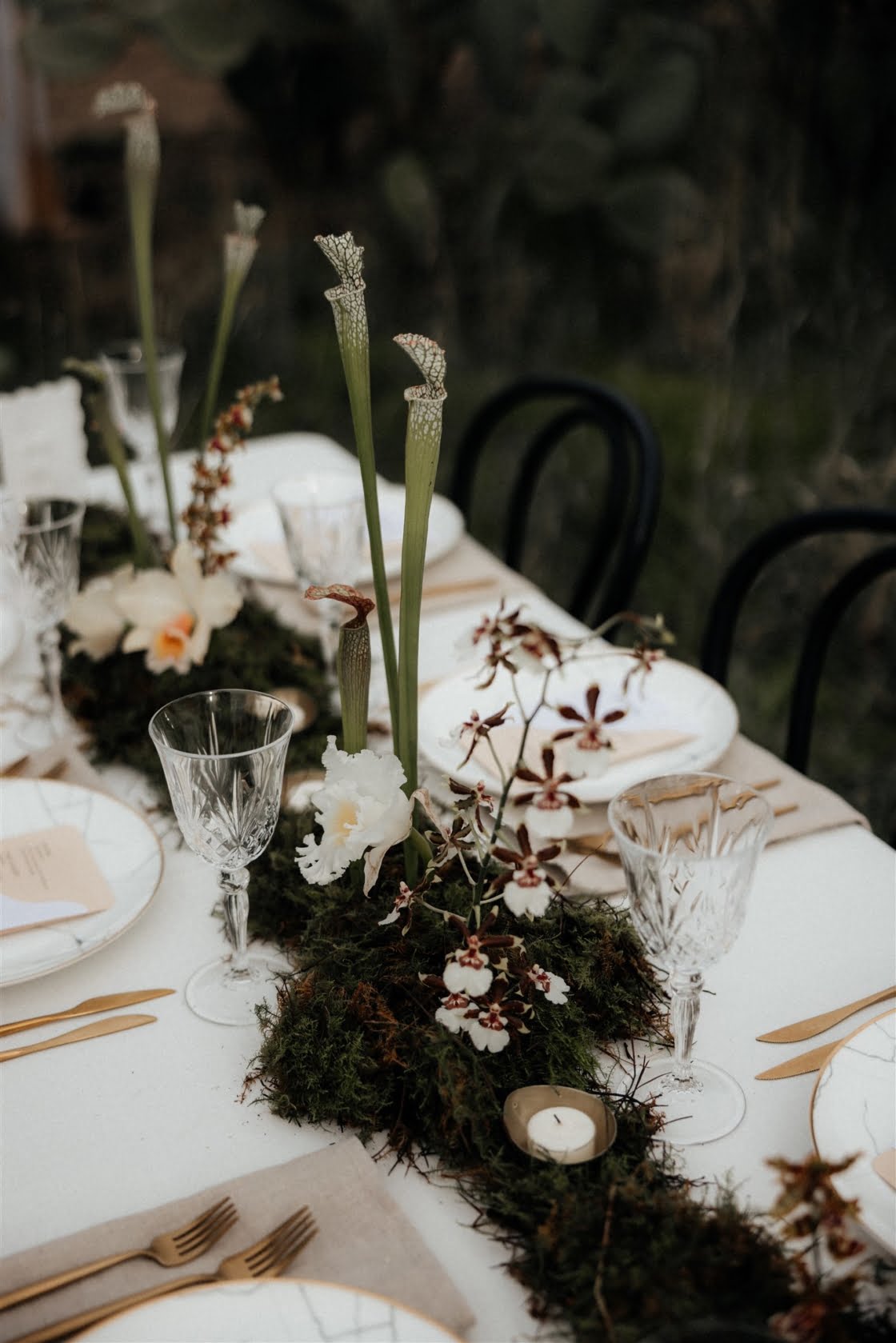 It was Ben’s family property in Central Victoria that formed the founding concept behind this shoot. “Our flower selection was made up using exotic botanicals, including the tall and carnivorous ‘Sarracenia’ plants and epiphytic Orchid blooms to line the table centre, giving the effect they were growing out of a creeping moss base,” he shares.