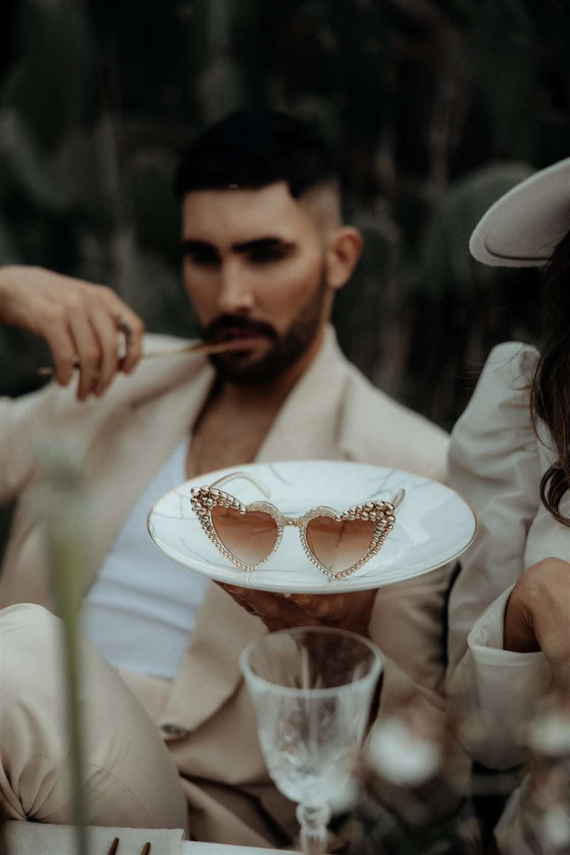 We love when couples go all out with their wedding accessories and to say we’re feeling these custom shades is an understatement. These hand-beaded luxe frames were a fab pick for the earthy palette of the shoot. Plus, they’re heart-shaped and sparkly. Love.