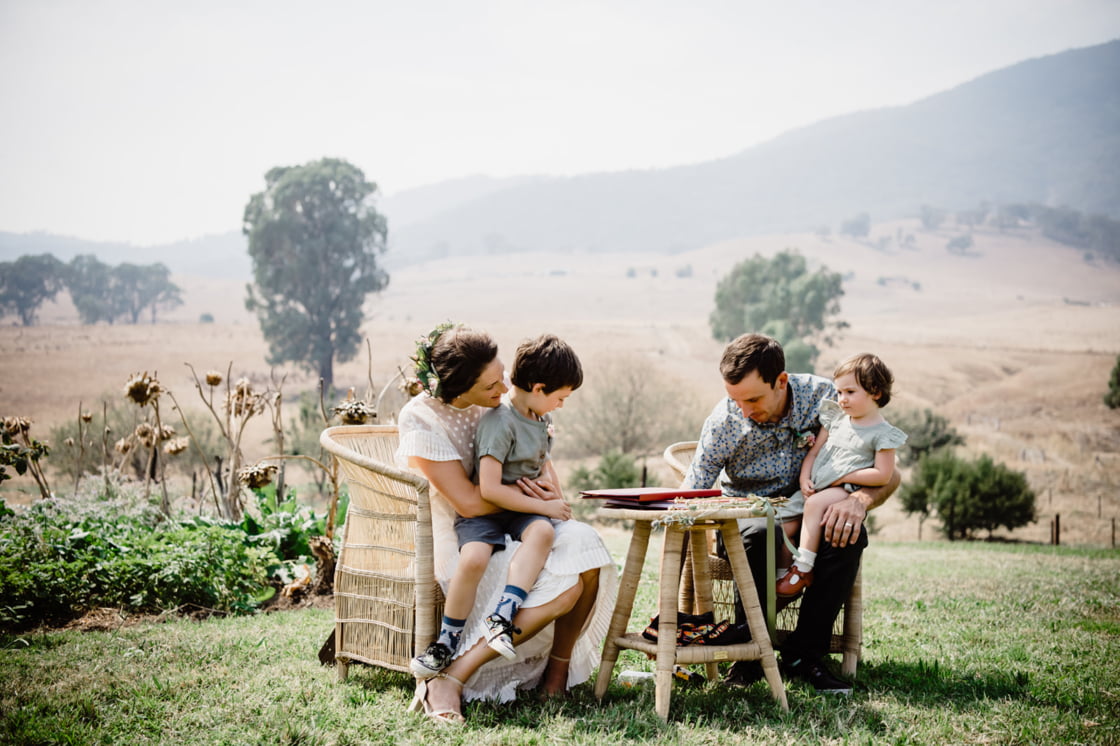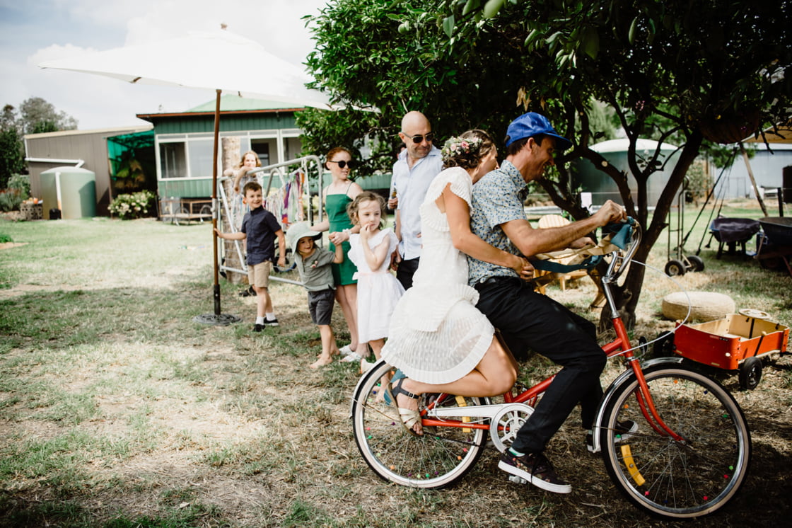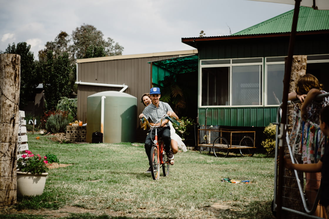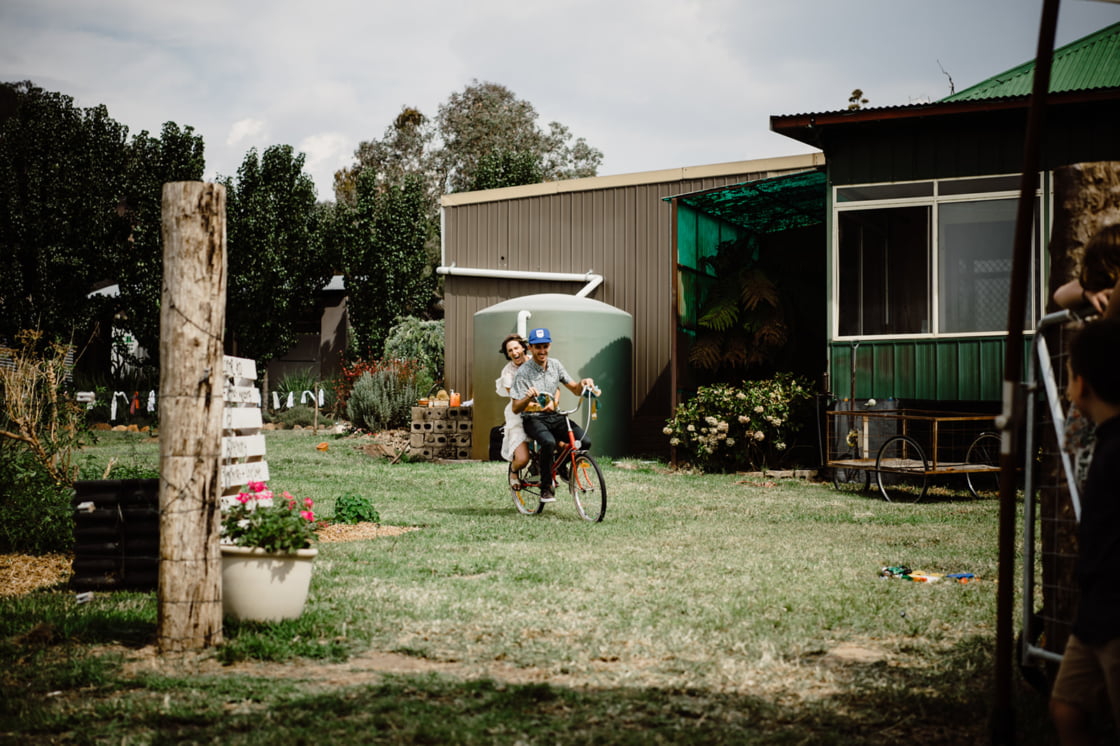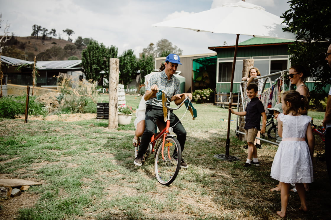 STANDOUT VENDORS “Most importantly Tamsin and Matt, we completely put them on the spot asking to have a wedding at their place and they were up for the challenge. From extra watering, planting, weeding, mowing to putting in new gate and fences and allowing us to build a bike track, they were so accommodating and we cannot thank them enough for their generosity. Rachel Emily, our photographer, was amazing in taking the documentary style photos completely incognito at our request. She was gentle and nurturing, and her contact leading up to the wedding and after the wedding was reassuring and made us feel really special. Selena from Flowers Naturally, a good friend, usually exclusively does funeral arrangements, however, couldn’t say no to our wedding. I gave her some very loose direction and ideas, nothing definitive and she was able to take that and create the most gorgeous arrangements, including Maeve’s flower necklace (which she wouldn’t wear haha). Farrah and Andrea of Pinchos of course! We had a pizza wedding and they took care of every single thing from getting the wood-fired pizza oven in, to our own special antipasto plate post-ceremony knowing that we’d be famished.”