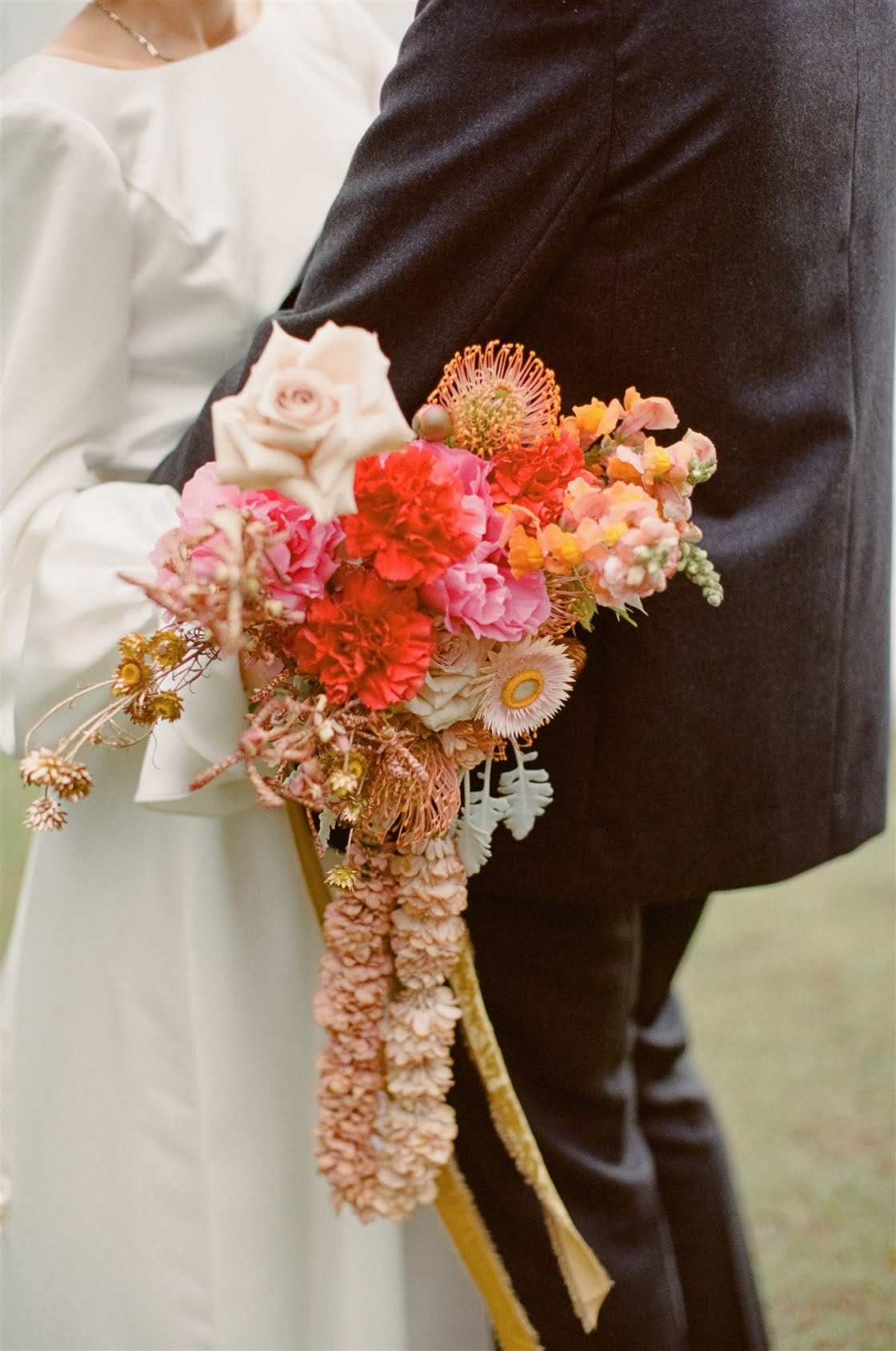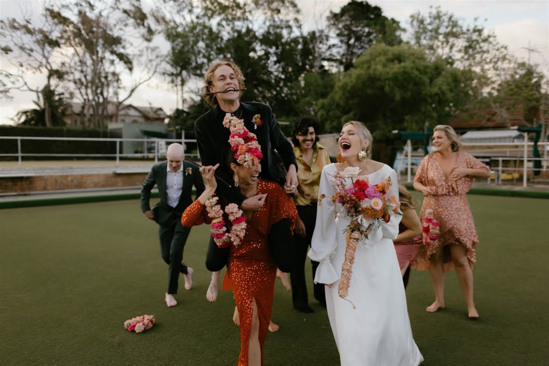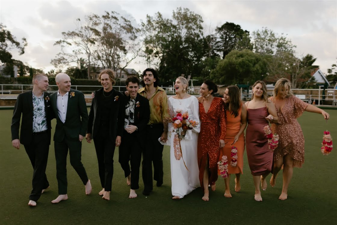 CONTRIBUTING VENDORS Photographer Oliver Smith Photo Cinematographer Joyride Stylist & Florist The Marmalade Sky Ceremony & Reception South Cronulla Bowling Club Catering Balinese Spice Magic Cake Topper Communicake It Light, Sound & Hire Items The Marmalade Sky Entertainment Victor Valdes Celebrant Andrea Calodolce Rings Diann Darling Jewellers (bride), Laura Armstrong Jewellery (groom) THE BRIDE Dress Collezione Santina Couture Veil Karen Willis Holmes Shoes Zomp Accessories Molten Store (earrings), Reliquia Collective (letter pendants on gown) Hair The Neighbourhood Salon Makeup Jenny Bird Makeup Bridesmaid dresses ASOS, Bec + Bridge Forever New Bridesmaid gifts Mecca Cosmetica THE GROOM Suit Acne Studios Shirt Collezione Santina Couture (custom-made from heirloom silk batik fabric) Shoes R.M. Williams Groomsmen suits Acne Studios, Joe Black, M.J. Bale Groomsmen gifts SVORD Knives