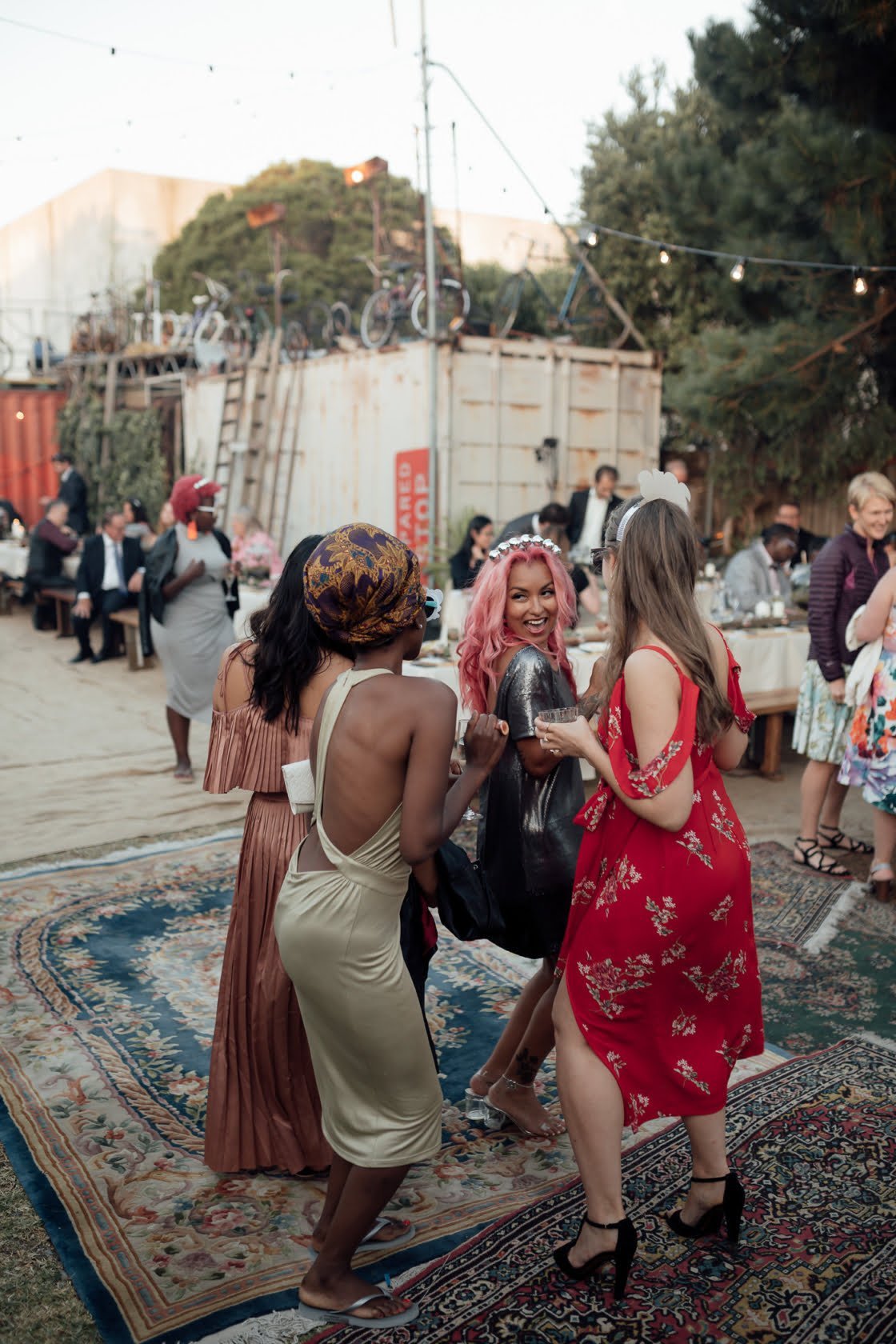DIY “Our entire wedding was one massive DIY project. Almost everything was found or made on what became affectionately known as ‘The Block’. Niko, friends and family literally built roof decks on top of shipping containers, levelled and paved dirt for our ‘dining room’, strung lights, laid fabrics, affixed old rusty bicycles to fences, painted signs, built a stage for the band, found or fashioned tables and desks… An entryway was made out of metal rods and covered with carloads of greenery. An entire wall was pieced together out of old doors. The bar was created from a 1950’s washing machine, a claw foot bathtub, and a table saw frame with a leftover piece of plywood stuck to the top. One of the groomsmen spent six full days building the long benches we used at the ceremony and reception.”