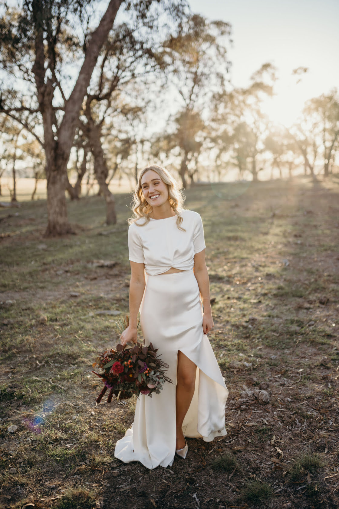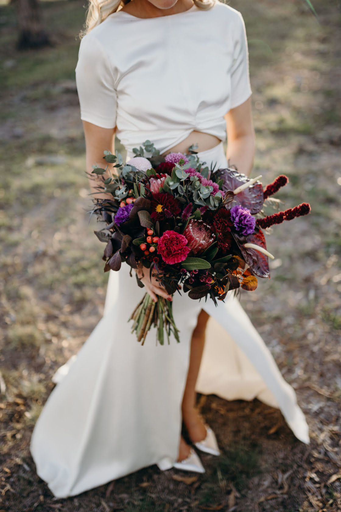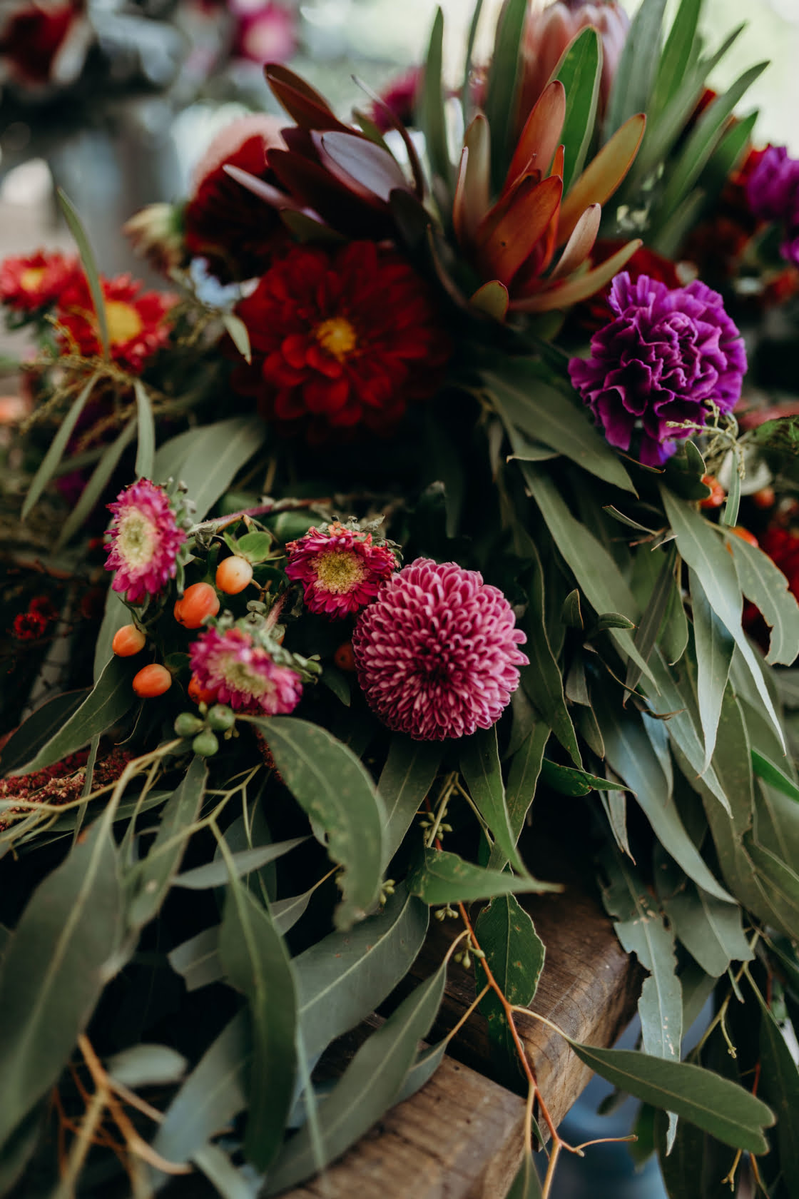 FAVOURITE DETAILS “Our flowers were a highlight. My sister Mel (with the help of our good friend and neighbour, Leanne) spent two days before the wedding making the bouquets, boutonnieres, table flowers, and decoration for the bridal table. Mel ordered some flowers in from the local florist but also spent quite a lot of time “foraging” on the farm for greenery to add. We also found material on the farm to use as vases. We basically wanted rusty steel pipes with that lovely deep orange colour that we could cut to length and use for table vases. I was so happy with how the bouquets turned out, they were just beautiful and the native flowers we included really worked with the deeper colours I was after.”