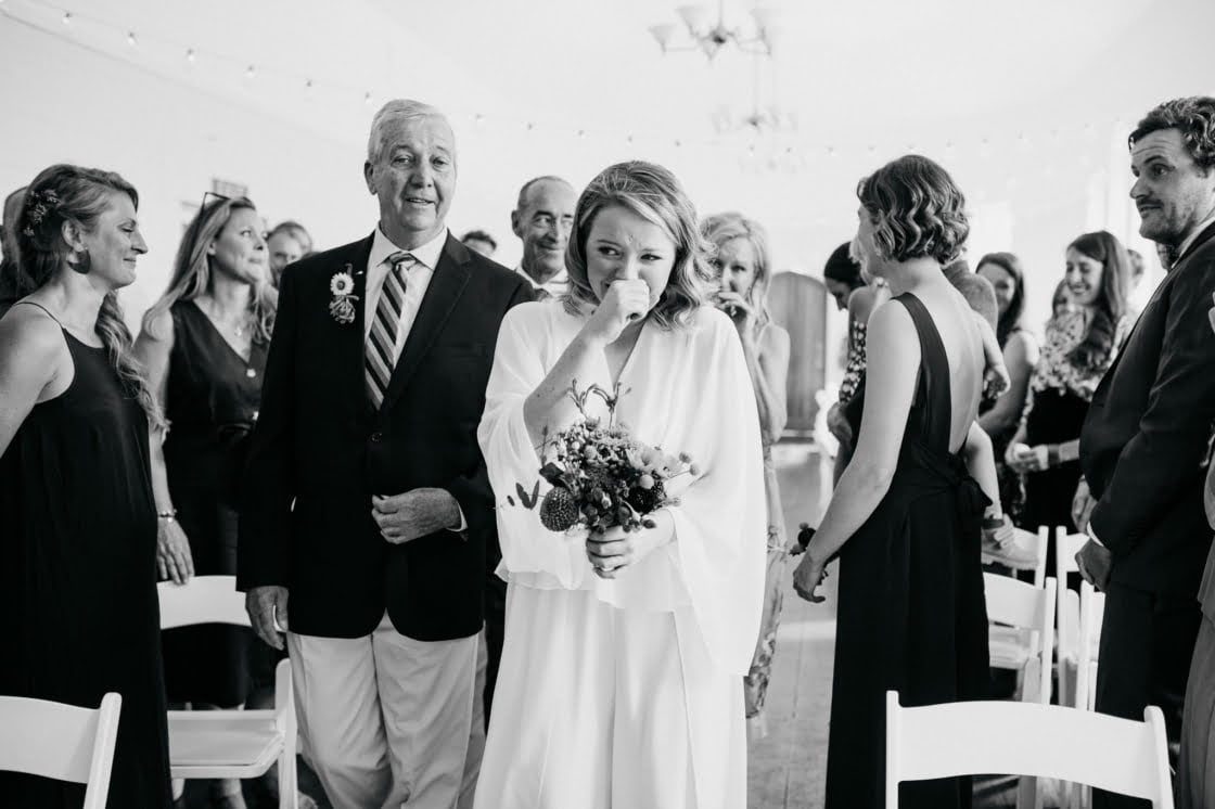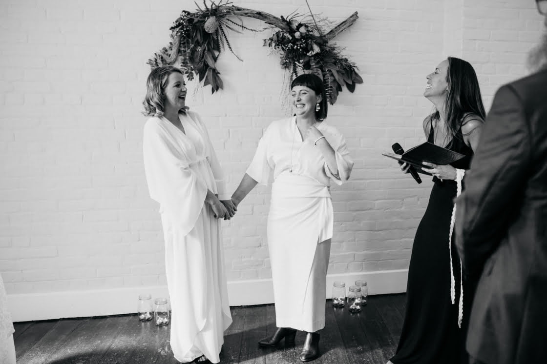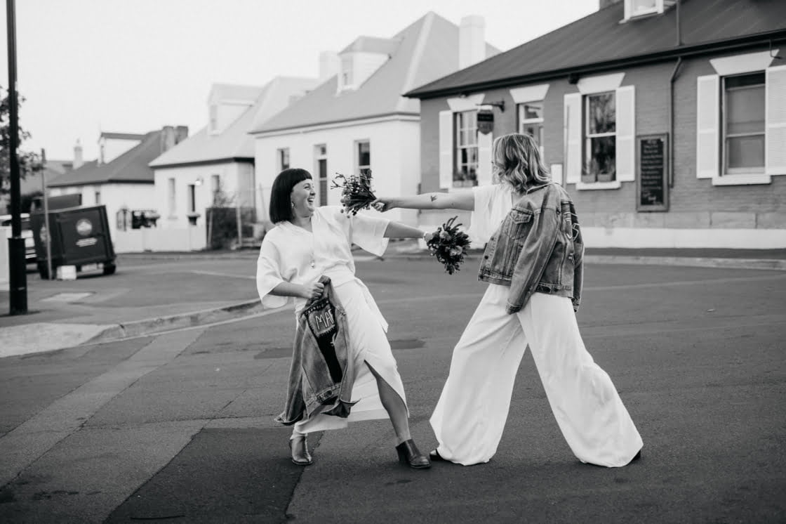 STANDOUT VENDORS “Our Photographer, Nina Hamilton – her pictures are just beyond. They are so professional and beautiful, and she really captured who we are as a couple. Merren Wilkinson (of Cinta Celebrate Love) was gorgeous. She has this glowing energy and was so personable and warm in her manner. Lisa Kingston Flowers was incredible. At Lisa’s encouragement, we went down early to Salamanca markets on the Saturday and picked our flowers from Lisa’s stall. She has amazing posies (two of which became our bride bouquets), and bunches of dahlia’s and eucalyptus greenery.”