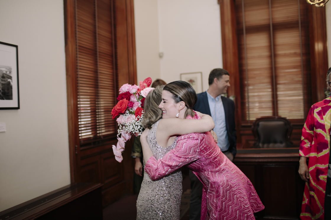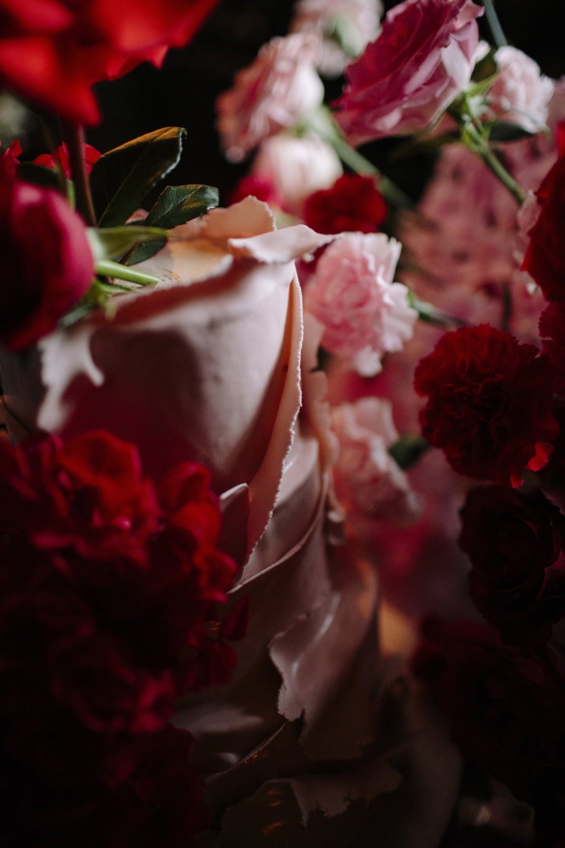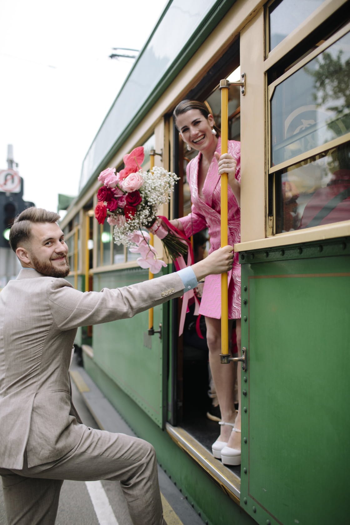FAVOURITE DETAILS… “The cake from Torte by Mirjana was next-level. Guests still tell us it was the best wedding cake they’ve ever had. It looked sensational and tasted amazing. Ross, from Bloom Boy blew our minds when it came to flowers. Our first inkling of how incredible they would be was my bouquet and Mark’s boutonniere, but walking into the Everleigh was another experience completely. The installation was so joyful and perfectly complimented all of the other elements. Ross embraced our red and pink colour clashing theme wholeheartedly and made the day so magical. The “Mark loves Coco” hand-painted, mirror signage from Mikey Ting was a huge highlight of the day and was commented on by all of our guests.”