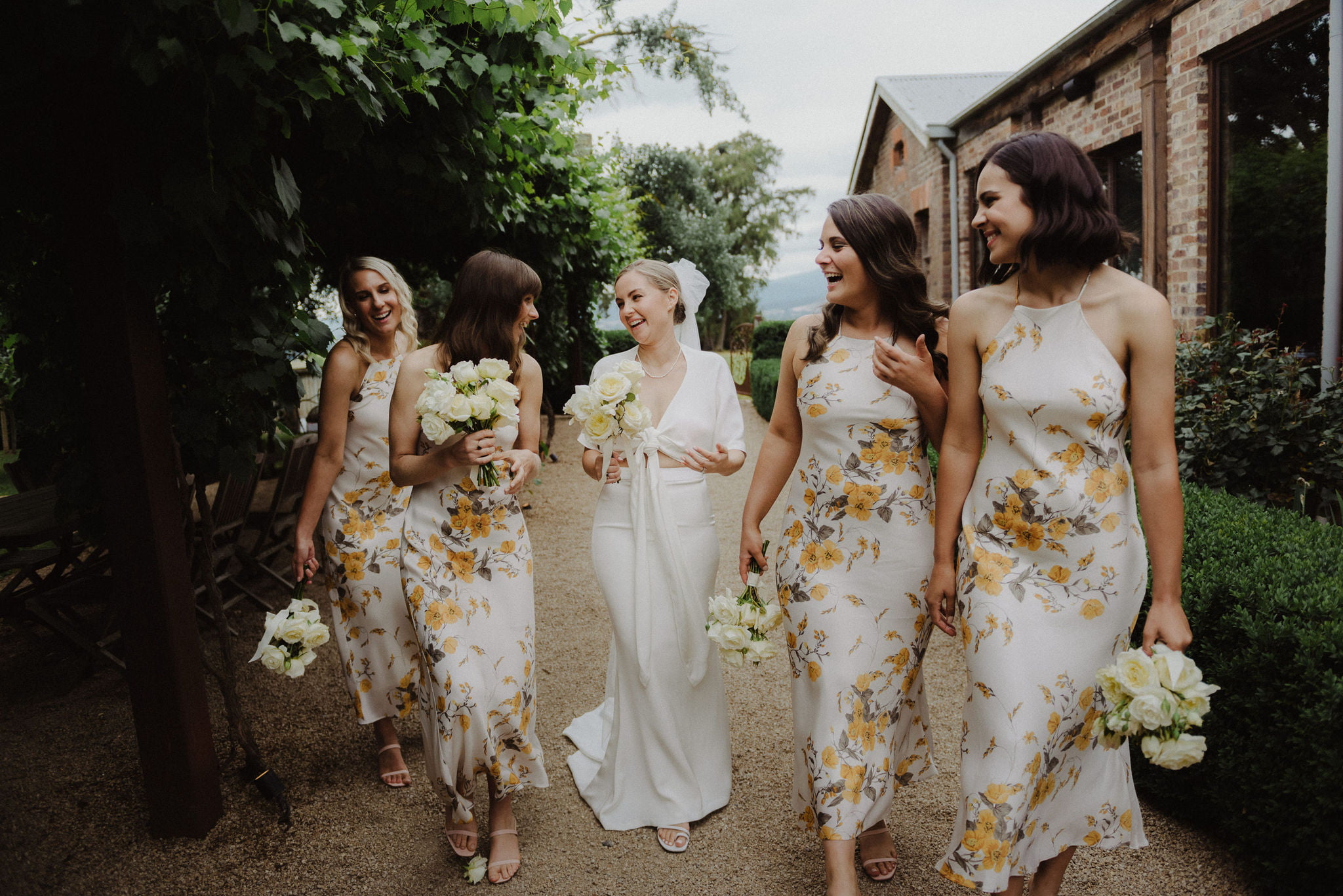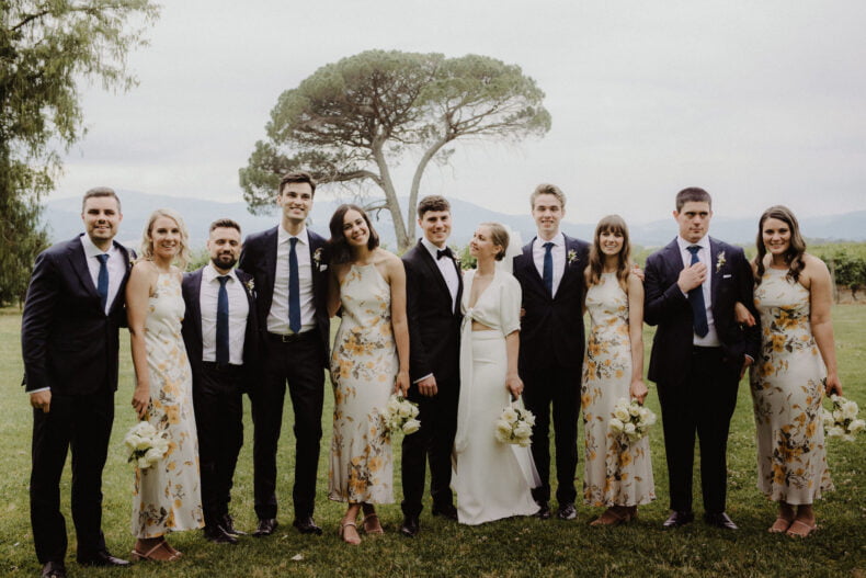 CONTRIBUTING VENDORS Photographer & cinematographer She Takes Pictures He Makes Films Florist Flos Botanical Studio Stationery Paper / Paper Ceremony & reception venue Stones of the Yarra Valley Cake Bakes By Jean Wedding favours Tree Project Entertainment & sound hire Melbourne Entertainment Co Celebrant Kate Morgan Rings Temelli Jewellery THE BRIDE Bridal gown designer & veil Lola Varma Flower crown Flos Botanical Studio Getting Ready PJs Country Road Shoes Jacquemus Hair Tonic Agency Makeup Livia Malazzo Bridesmaid dresses Bec + Bridge Bridesmaid shoes Windsor Smith Bridesmaid earrings Witchery Flower girl dress Zara THE GROOM Suit & groomsmen suits M.J. Bale Shirt Abelard via David Jones Bow tie Hardy Amies via David Jones Cufflinks Hugo Boss Shoes Loake 1880 Watch Skagen Barber Razorsmiths