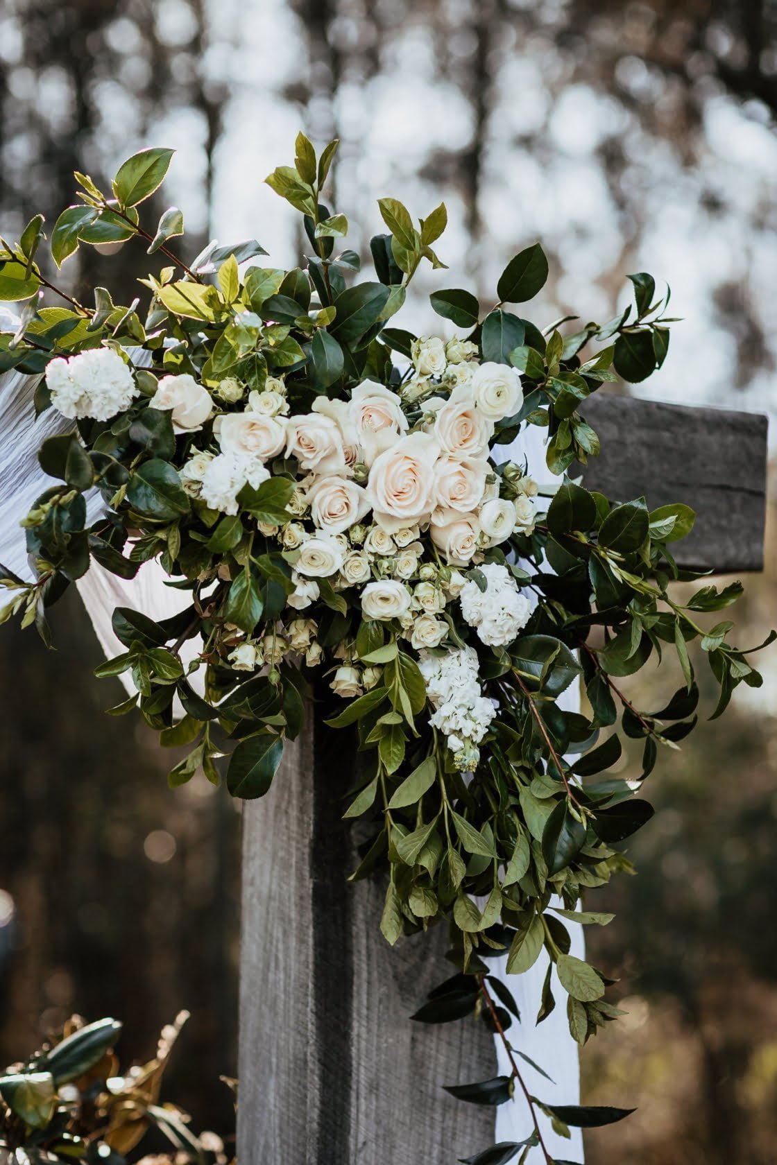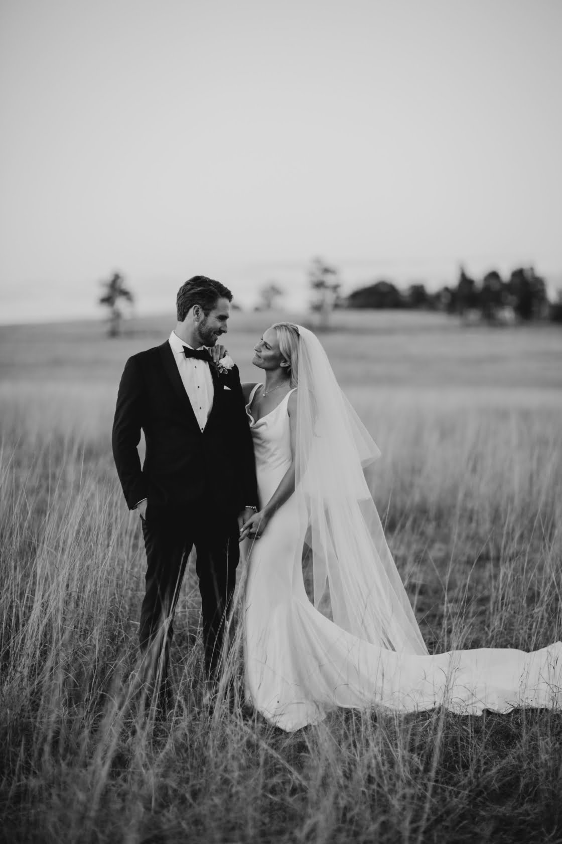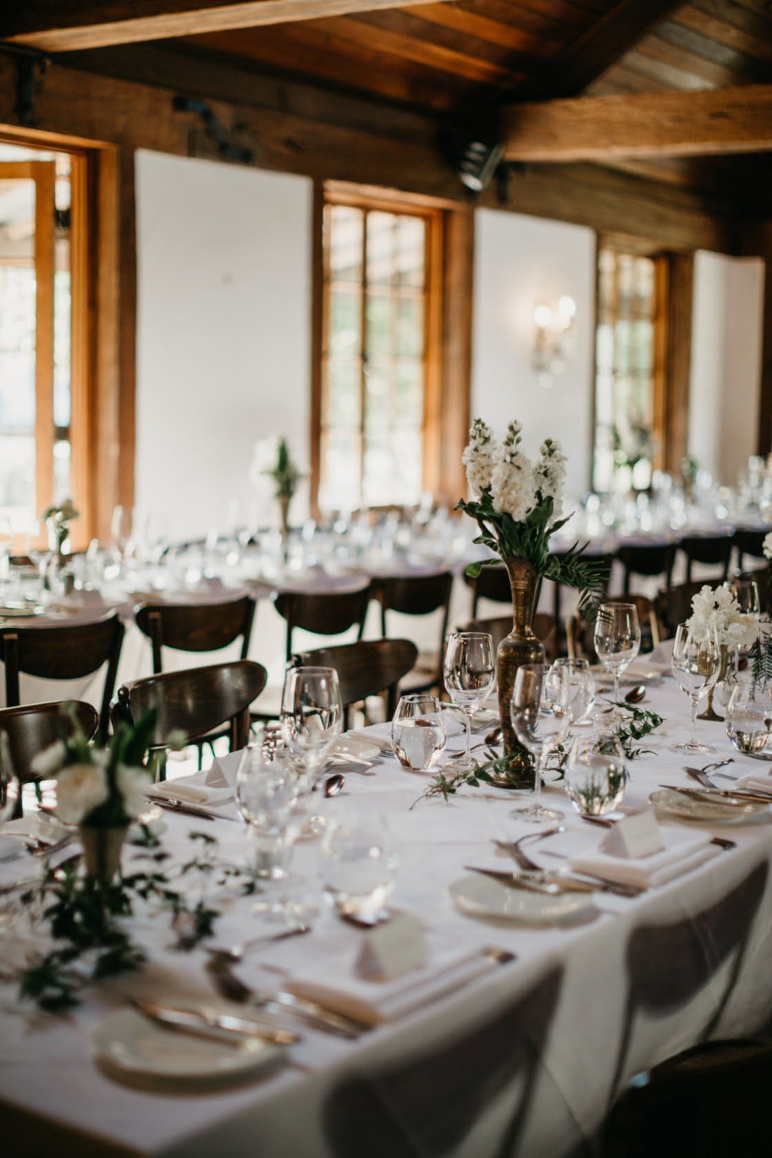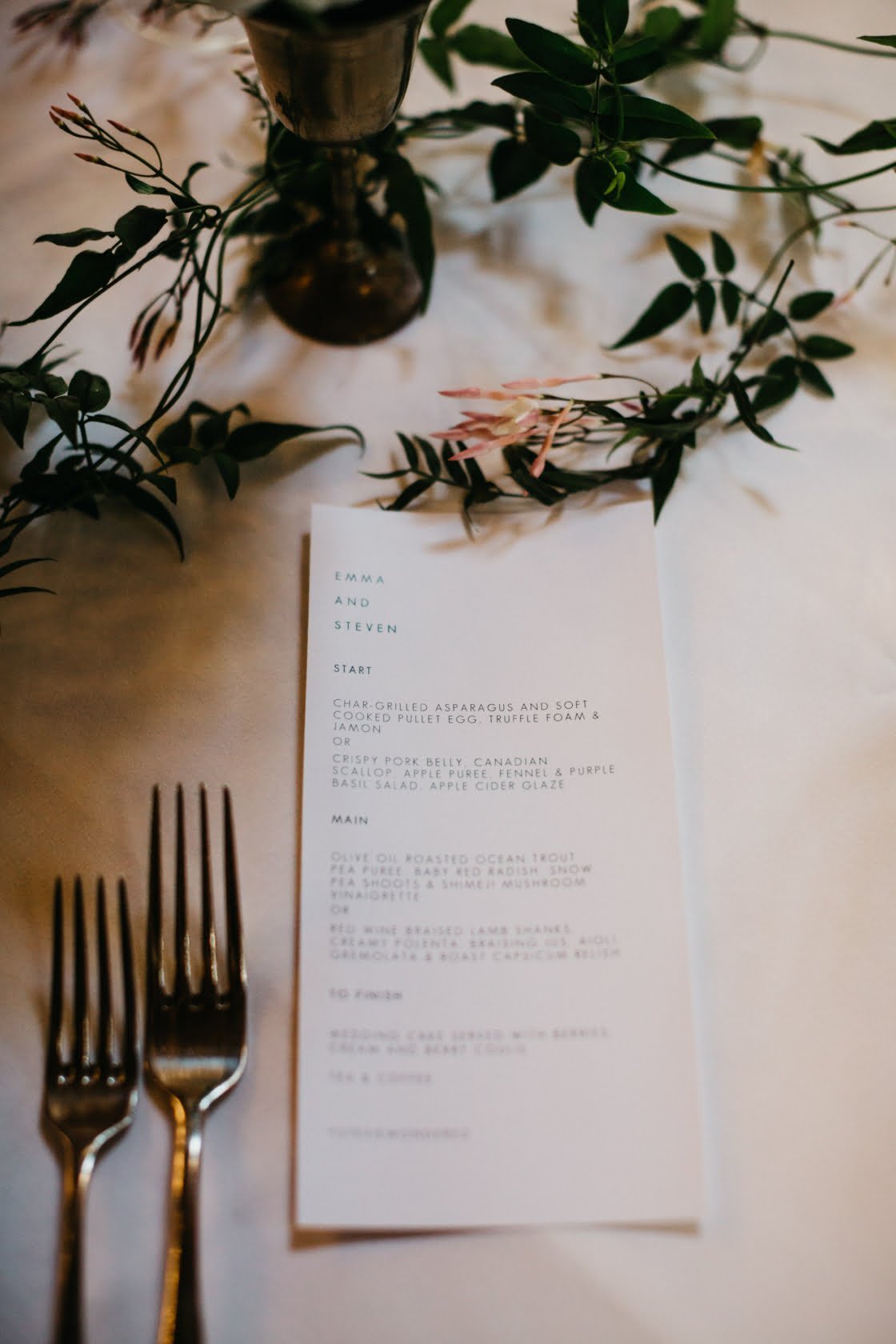 FAVOURITE DETAILS “We were so pleased with our florals, our florist, Jade McIntosh Flowers, really understood our desire for natural, simple and elegant blooms and for it to not be too fussy or constructed. I loved that she found some jasmine vines in the surrounding gardens and used them to trail from the flower arrangements on the tables.”