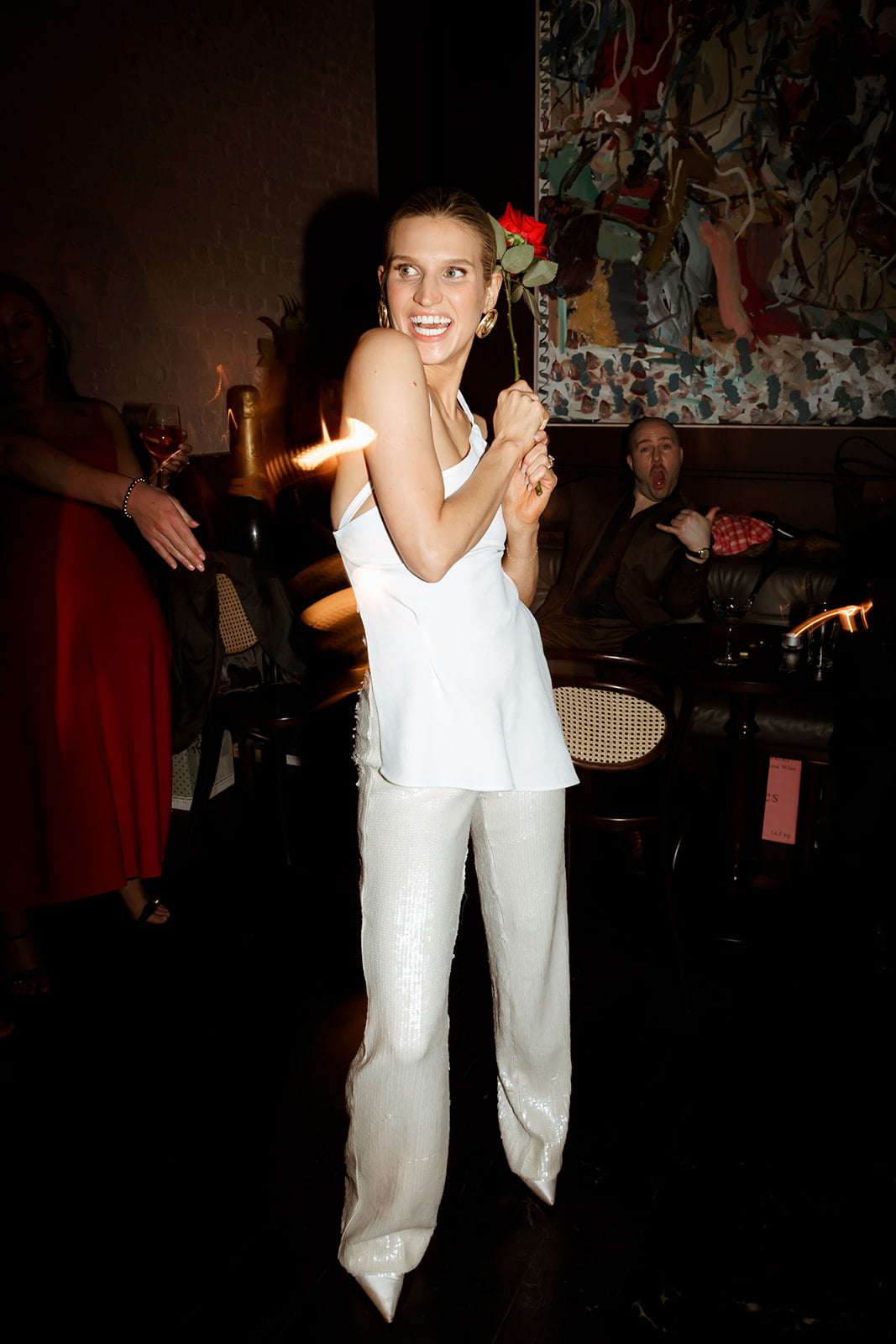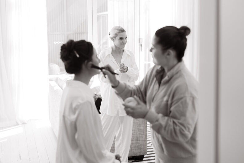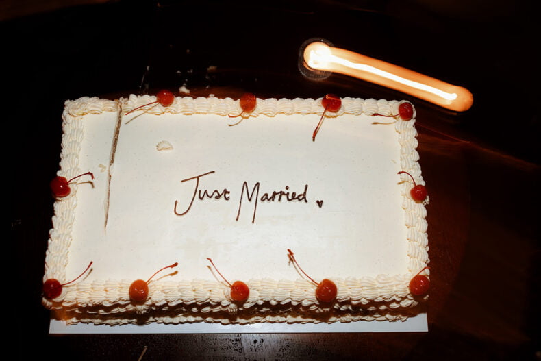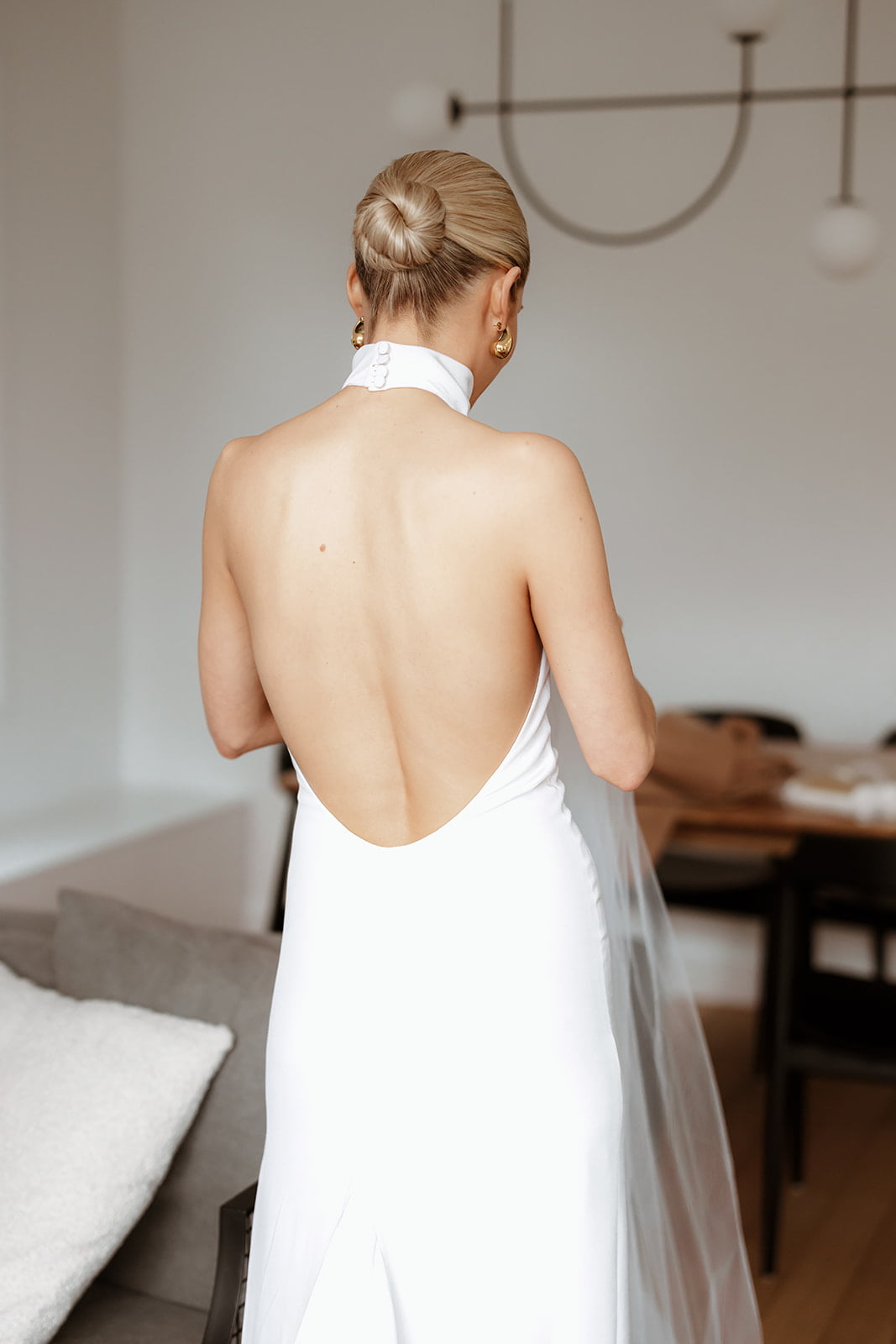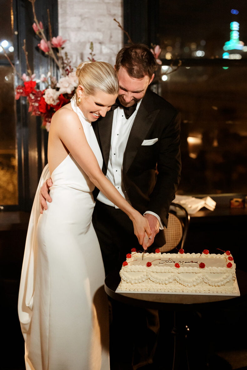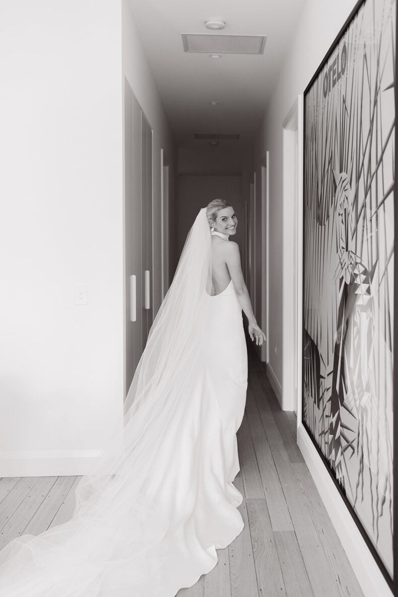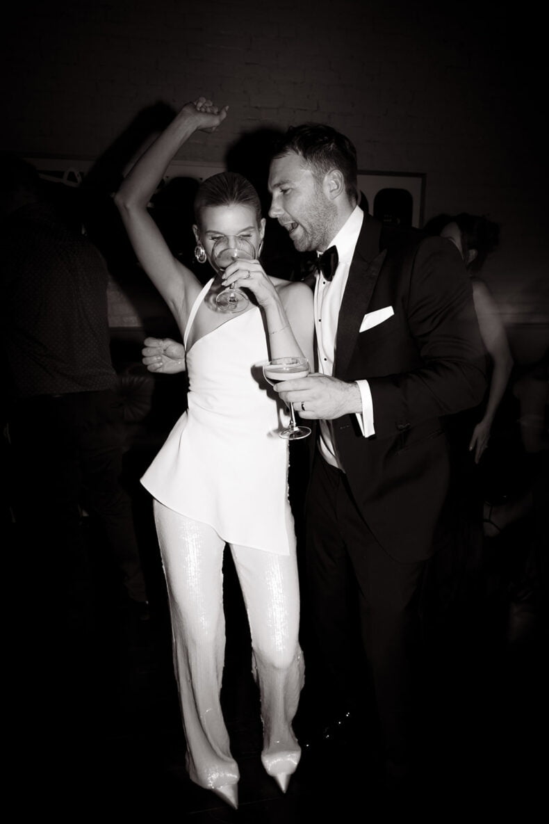 THE DRESS “It was created and designed by my most talented friend and colleague Jacqui – a creative pattern maker by trade. With a few reference photos and a strong idea of what I was after, Jac and I decided on a fabric and then made quick work of finalising the pattern in 3D avatar before starting production. The dress then took shape very quickly, making a few tweaks and changes along the way. The experience of creating the dress was one of the most stress-free parts of the planning process. I loved how collaborative the whole experience was and as it was not created through a traditional bridal boutique, we did not have to worry about leadtimes. We even decided to make a sequinned pair of pants the week of the wedding!”