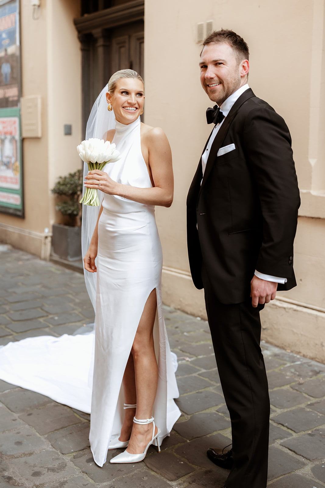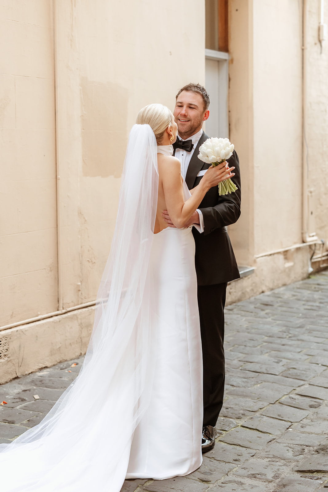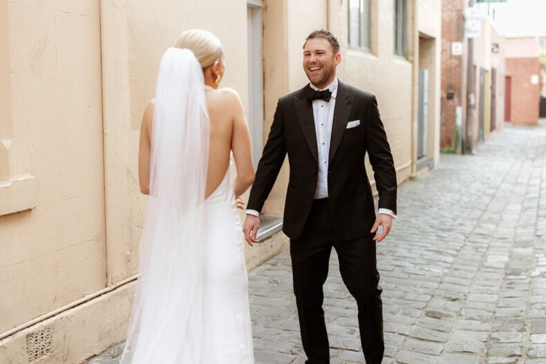 MEMORABLE MOMENT “It is a testament to our photographer Nikki that the first look photos would be our favourite part of the day. Nikki lead us around the lanes of Fitzroy with music playing through a speaker clipped to her belt, alongside the three cameras used to photograph us.”