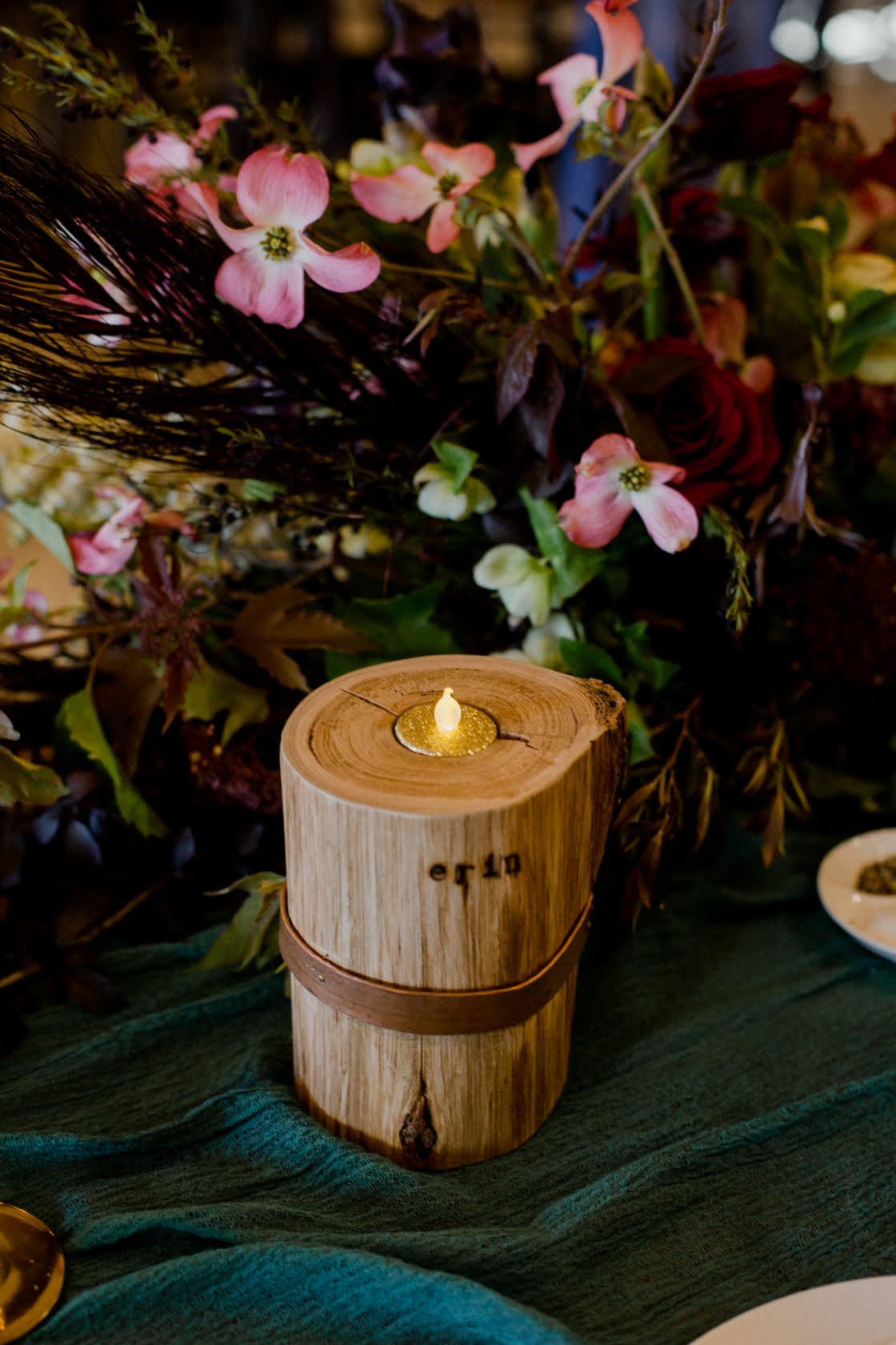 FAVE DETAILS “My favorite thing easily were the wedding favours / table place holders that my dad made. They were tea light candle holders made with fallen tree branches, and both parents wood burned each guests’ name into them. They were so special and I’ve seen them on mantle pieces and entryways in friends’ homes since the wedding.”