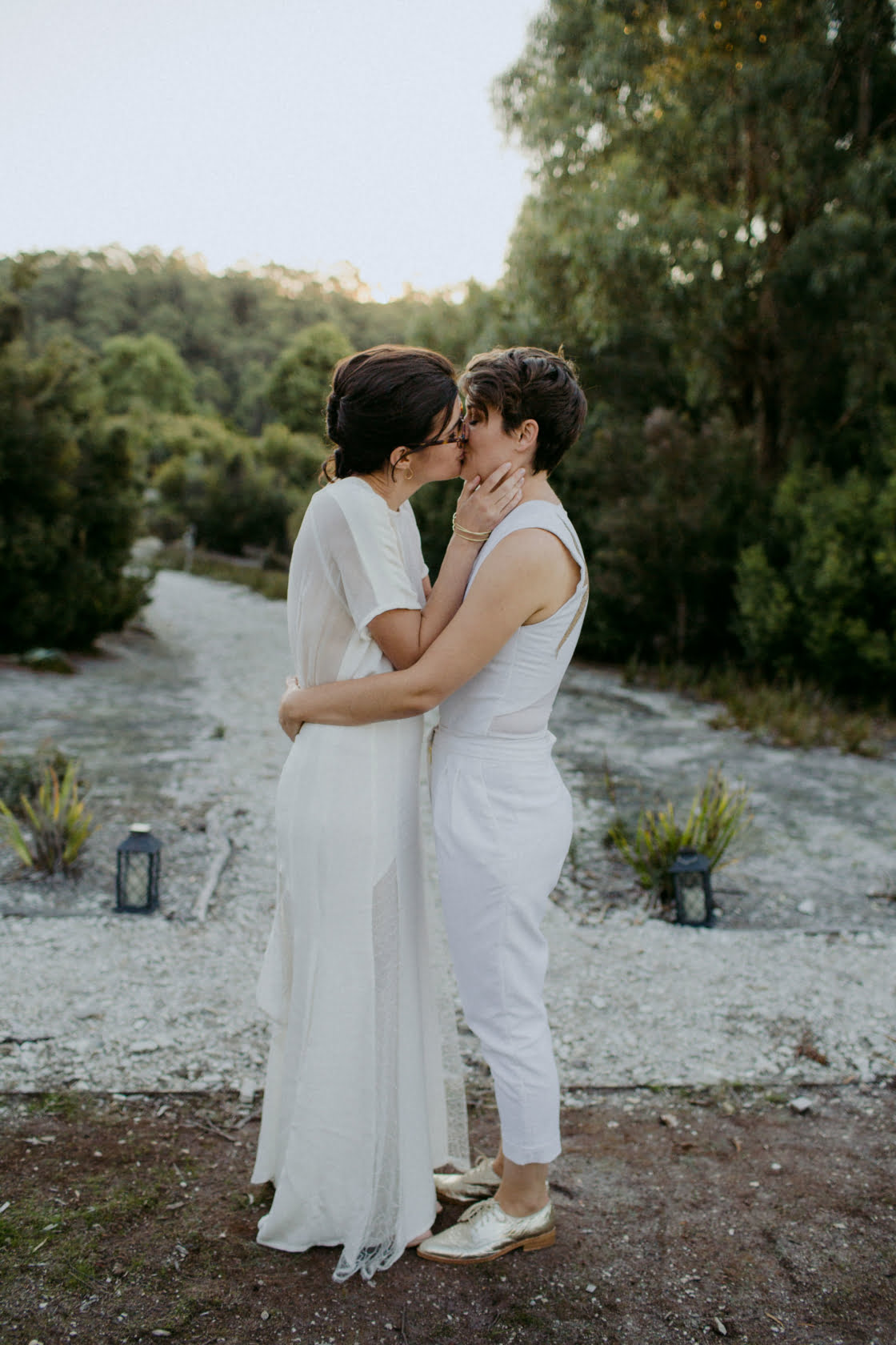 Lovely ladies Erin and Loretta were engaged for two and a half years whilst waiting for the Australian Government to “get their act together” and pass marriage equality so you best believe the pair made up for lost time by organising one heck of a wedfest weekend, yurt and all, to celebrate their long-awaited nuptials. They also had their one-year-old daughter ride down the aisle on a cart that they coined the ‘YAS wagon’ and danced into the reception wearing paper mâché heads of themselves… Intrigued? Of course you are. Scroll down for all the details, their great advice and pics by Amanda Alessi Photography…