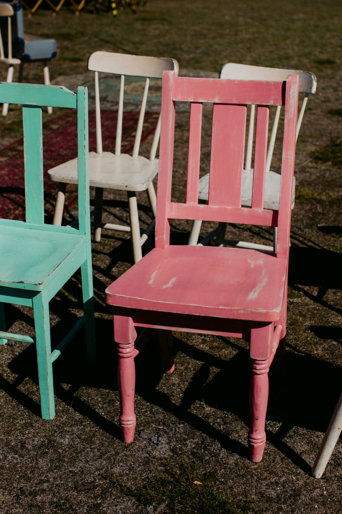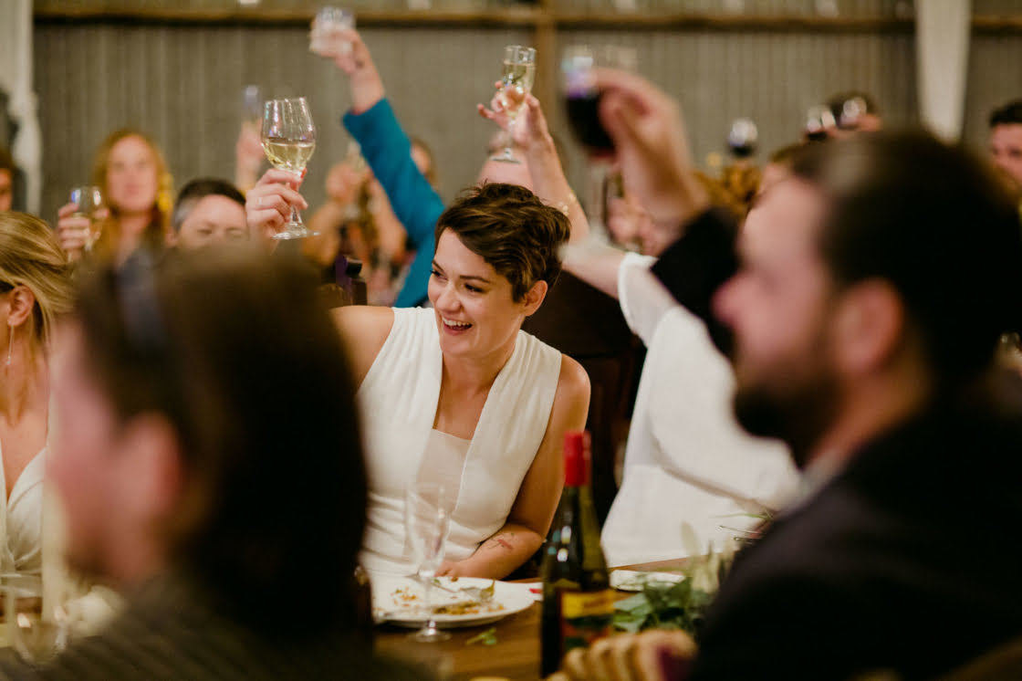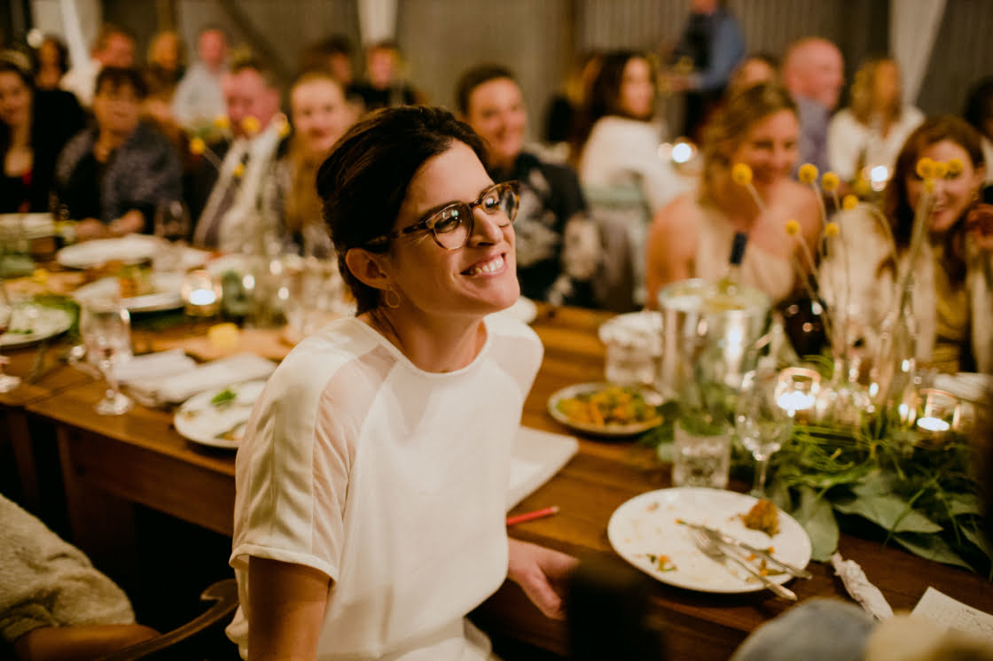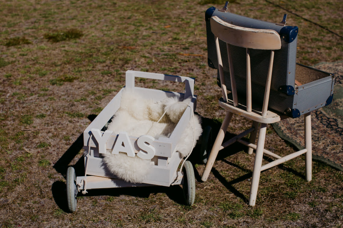 FAVE DETAILS “One of my bridesmaids, Kirby Burgess, surprised us and the rest of the bridal party on the set-up day with overalls that she had designed and made. The girls all arrived on the morning of the set-up wearing them and ready to be put to work. The cake by two of our bridesmaids was an absolute hit. The favours – instead of sending everyone home with bag of nuts or engraved candle, we gave everyone a bingo card and made them compete for a grand prize hamper filled with locally sourced produce. Our close friend who MC’d did an incredible job with hilarious bingo calls throughout the night. Etta’s cart AKA the ‘Yas Wagon’ – our daughter was one when we got married, and in the lead up we were pretty sure she wouldn’t be walking yet (or at least not down an aisle with any sort of reliability). So I made a cart for her to ride down, with the word ‘YAS’ on the front.”