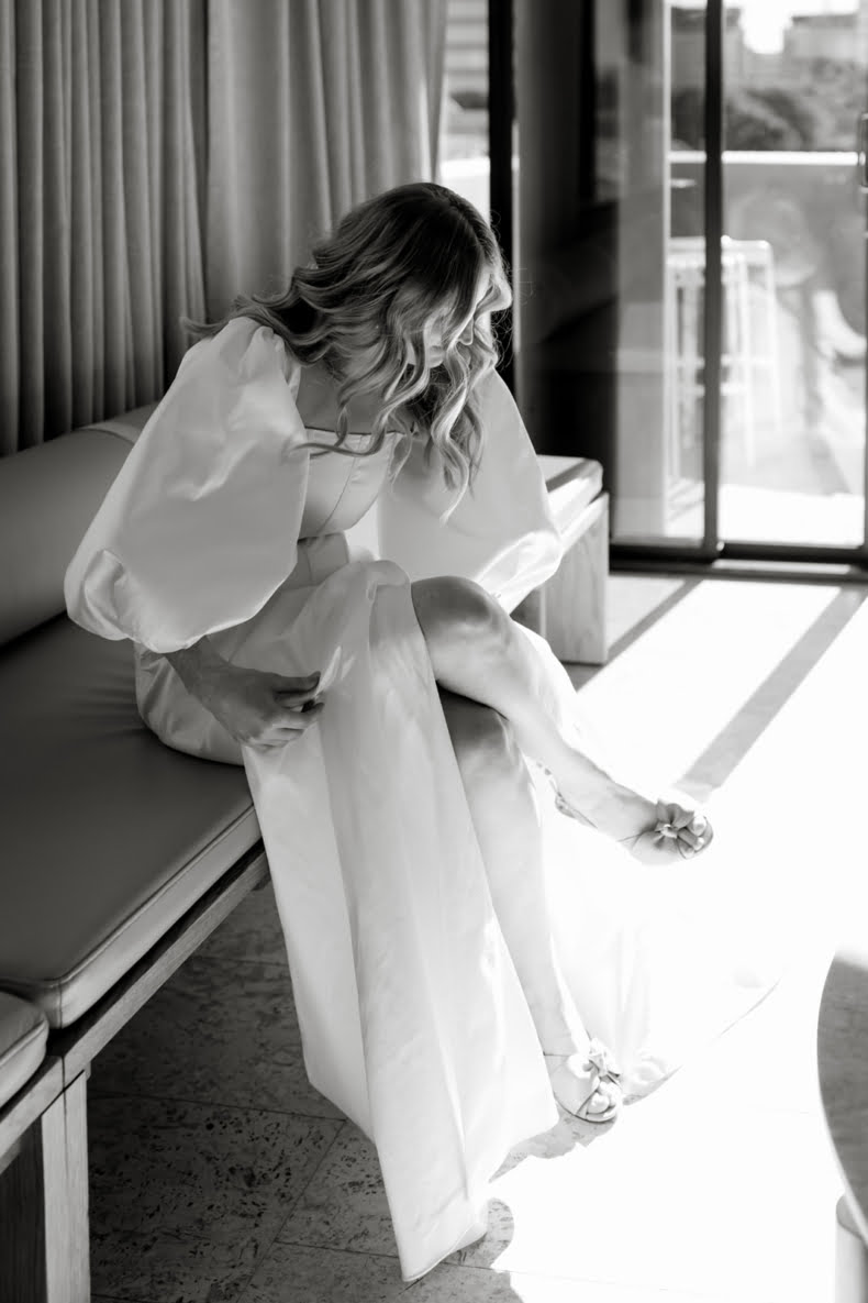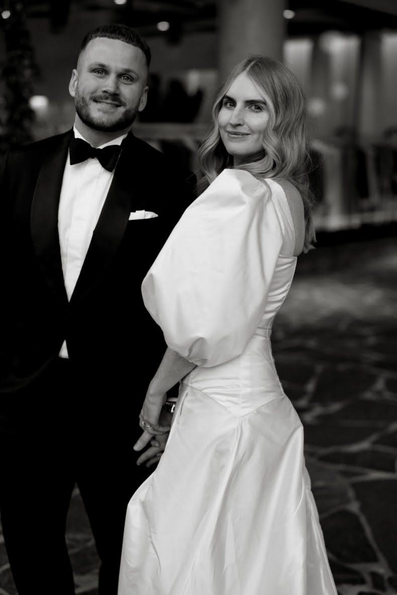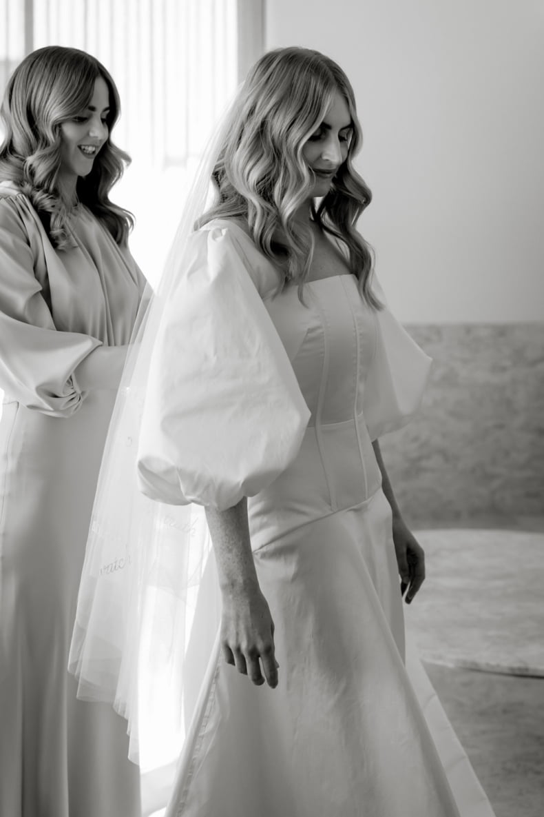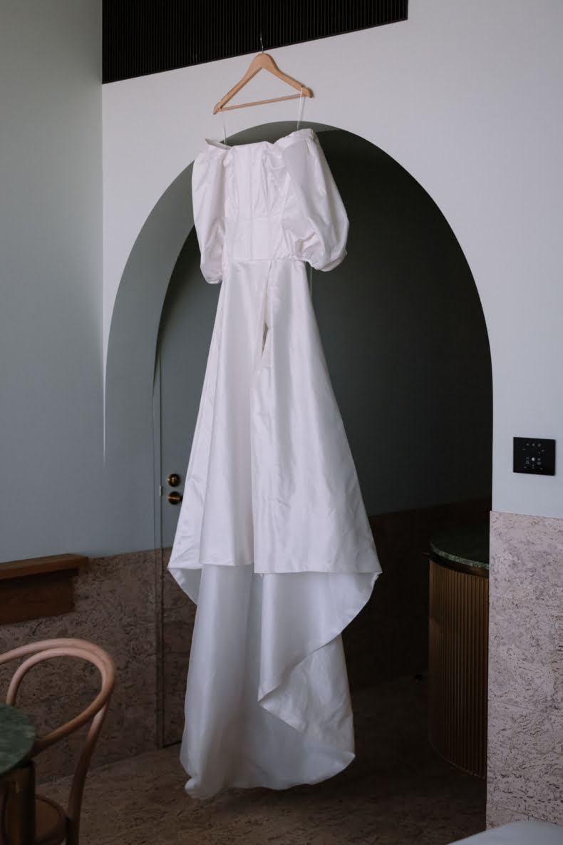 THE DRESS “The dress! Oh, the dress. What a journey it was. My initial vibe leading up to the wedding was to purchase something online that was understated and to pair it with an epic veil. I had a Net-A-Porter package arriving every week, but nothing felt right. Eventually, I landed on this beautiful Vanessa Cocchiaro jumpsuit that I was intending on pairing with a Harriette Gordon veil. Ten weeks out from the wedding I went into Bloom bridal boutique to try on the veil and ended up trying on the Harriette Gordon Lantern gown, and I was sold. The jumpsuit was a mere memory. Thanks to some very quick work from Sam at Bloom and the team at Harriette Gordon, my dress was ready to go the week before the wedding. It all fell into place and the dress couldn’t have been better. The complete opposite of my original relaxed vibe (who was I kidding with that?!).