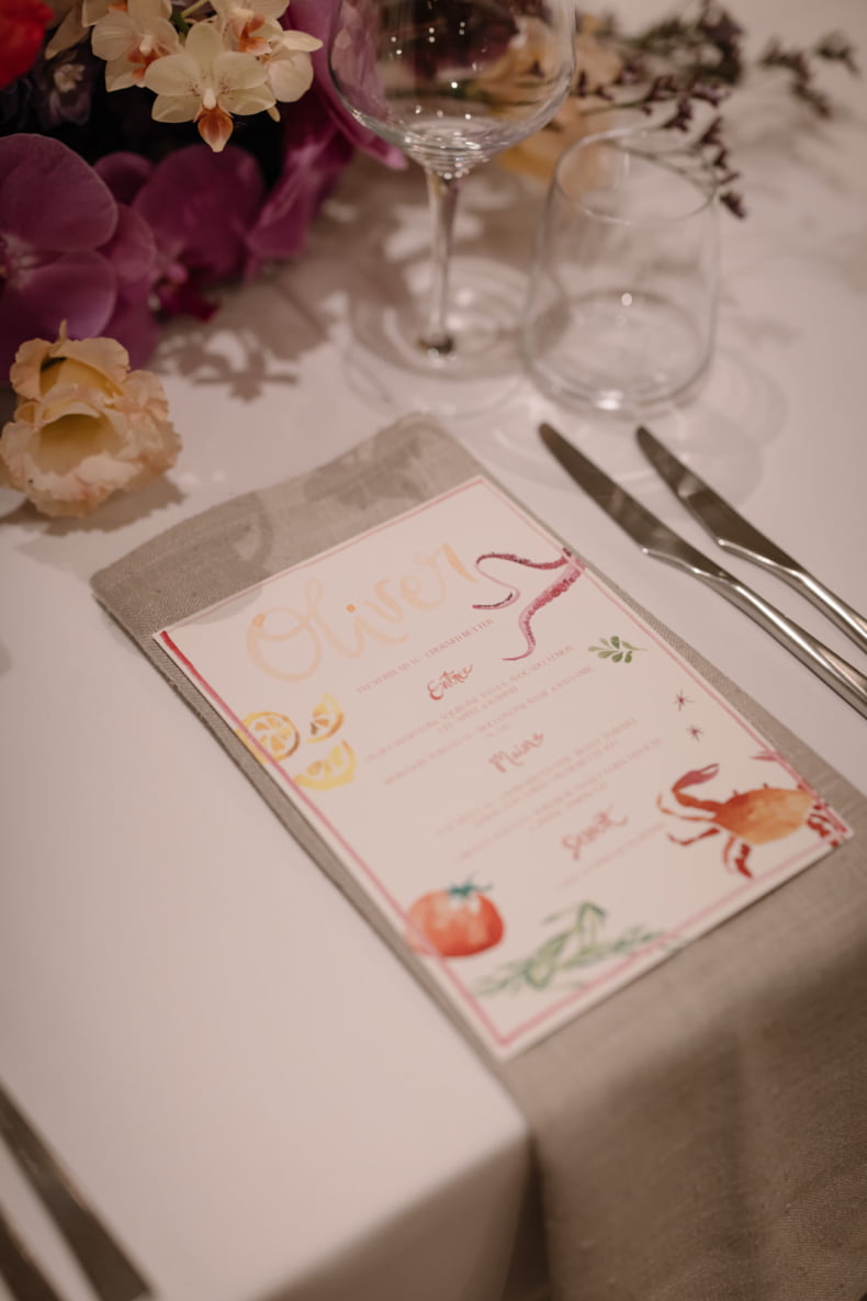 FAVE DETAILS “The stationery was so beautiful, Vanessa Nguyen did such a great job, it tied in so perfectly with the flowers by Mrs Gibbons Flowers. It was bright and fun and I felt like I hadn’t seen anything like it previously. Vanessa hand-painted all the names on the place cards as well. It felt classy without being ostentatious.”