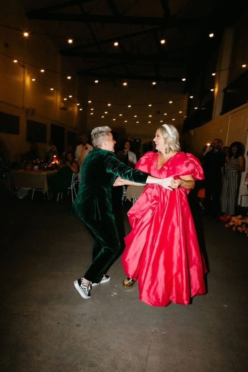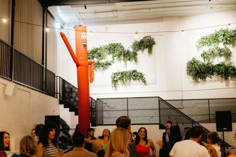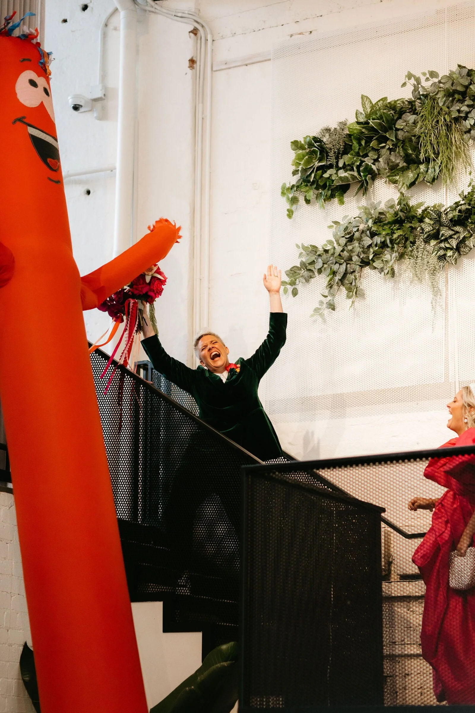 LITTLE LOL “I have a real penchant for tubey men… you know the big inflatable guys that flail around outside used-car saleyards? Elle had managed to hire one for the day as a surprise (her wedding present to me), and the wedding coordinator set it off just as we were walking down the staircase into the reception — IT WAS MEGA! For me personally, this was something I’ll never forget, as it was so unique and considerate, and absolutely hilarious! Our photographer Miranda managed to snap an absolute banger of a photo, of when I saw it for the first time! The tubey man was an absolute hit and everyone loved it on the dancefloor later on in the evening.”