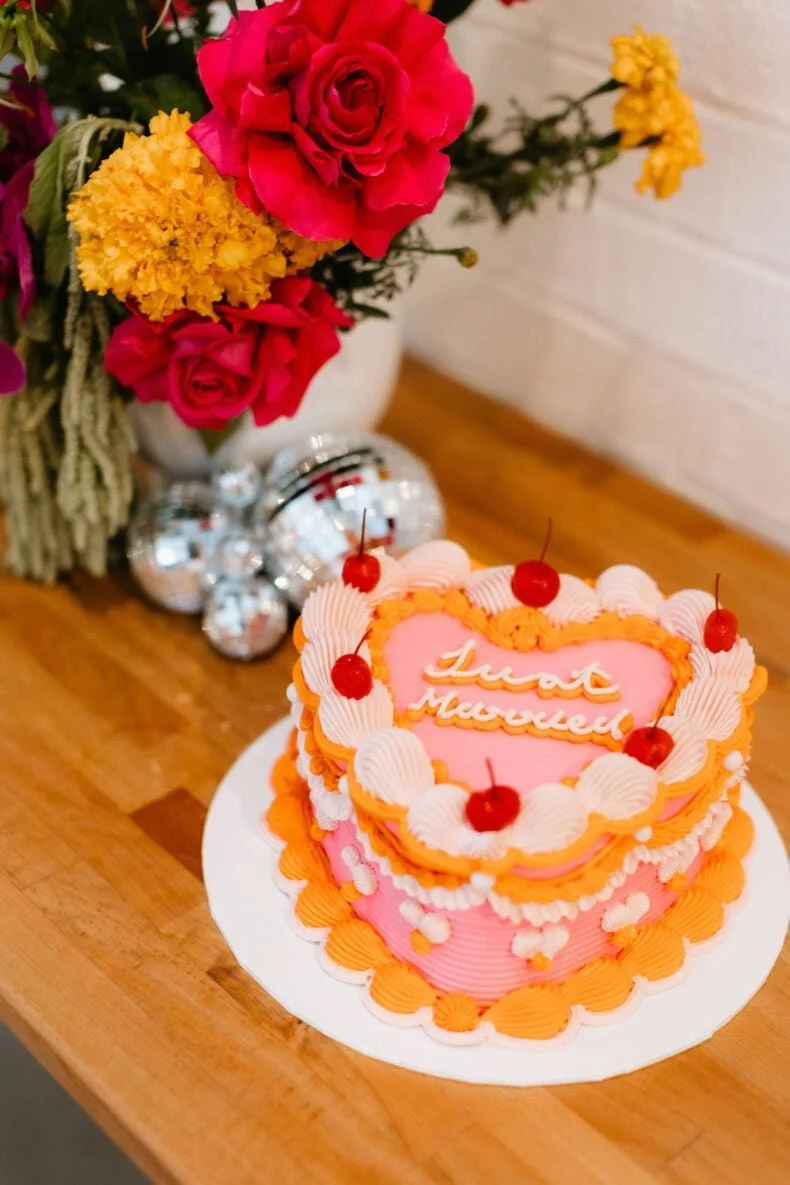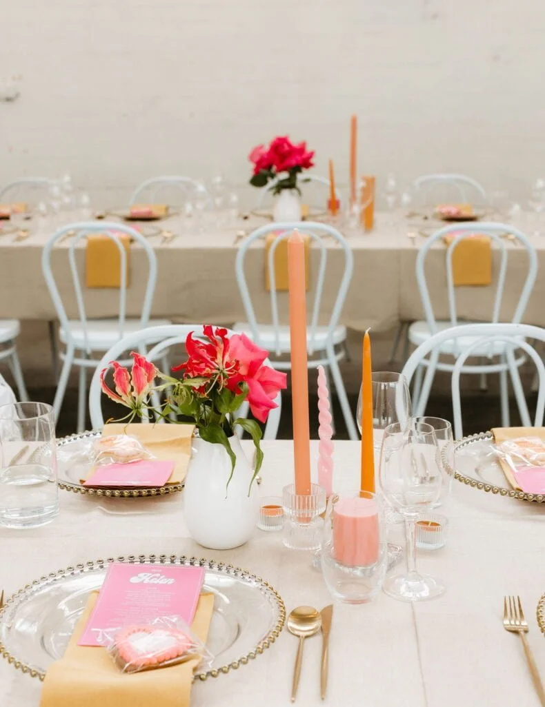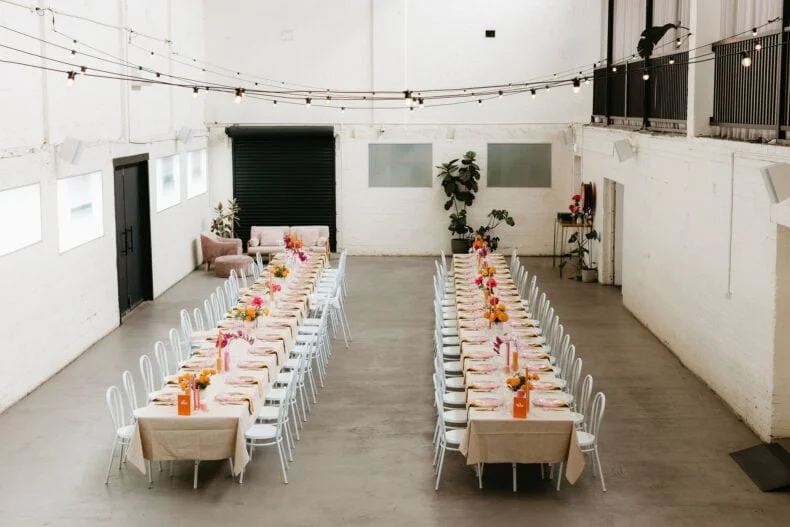 FAVE DEETS “I’m obviously biased, but I have to say that Elle’s styling, inclusive of florals, really made the whole day beautifully fun. We opted for bright pinks and oranges, and had multiple disco balls placed around on tables between the flowers. In addition, we had the wonderful crew from Bangin Hangins come and set a fabulously bright aerial above the cocktail space, which made for an awesome detail in the awesome photos.”