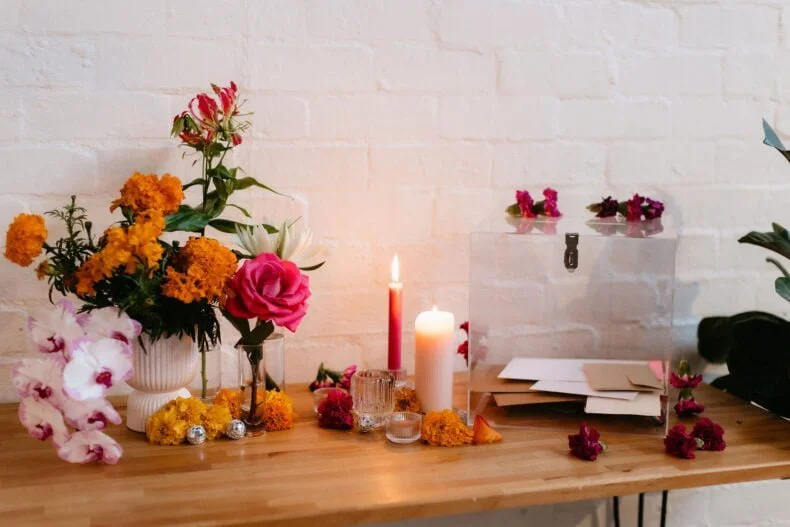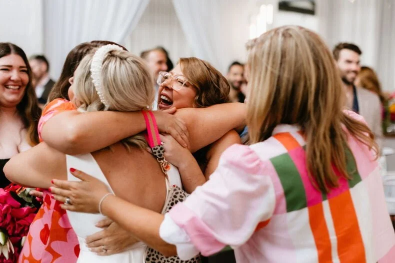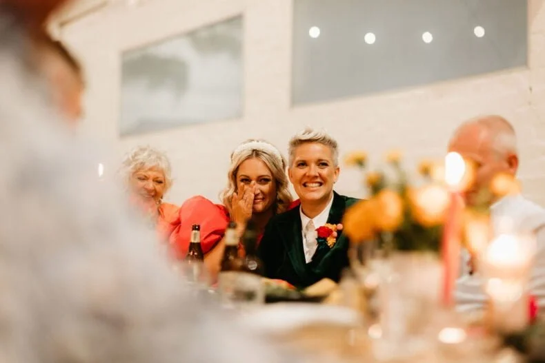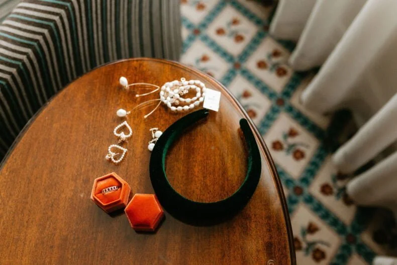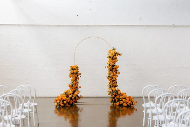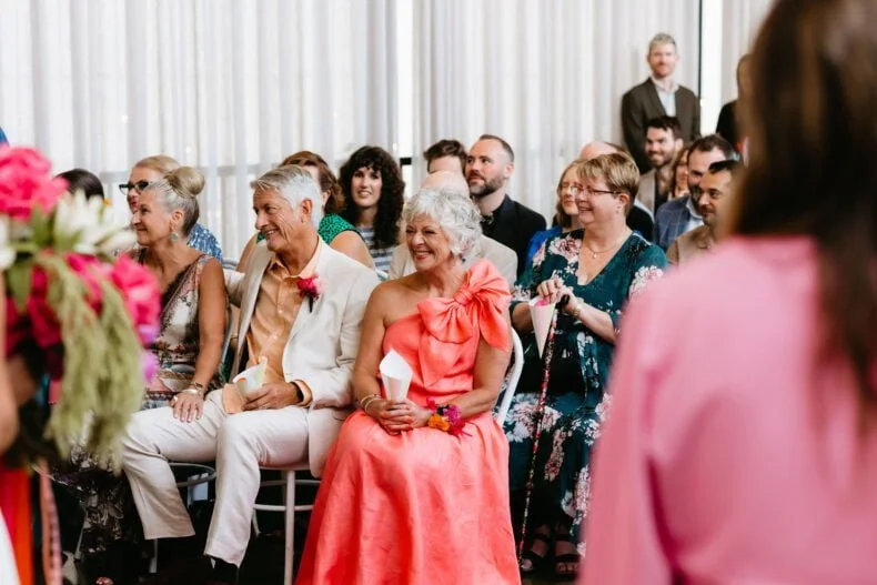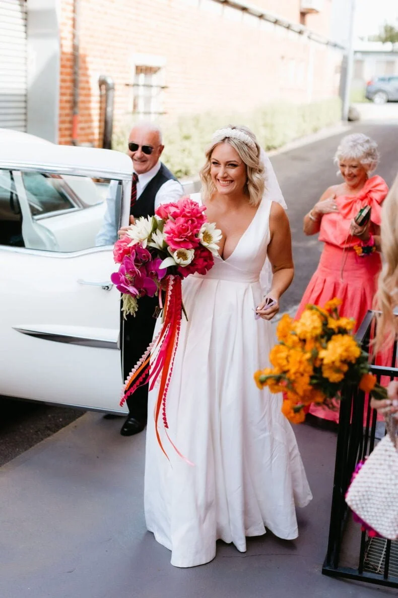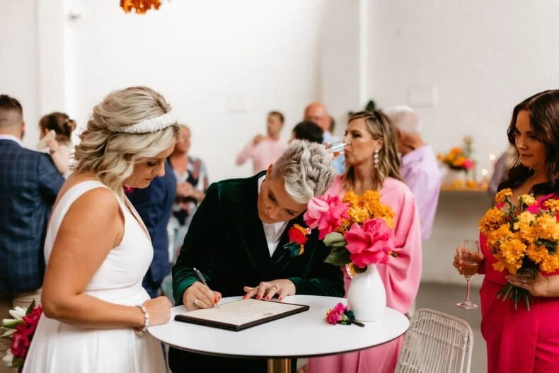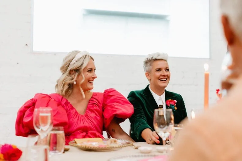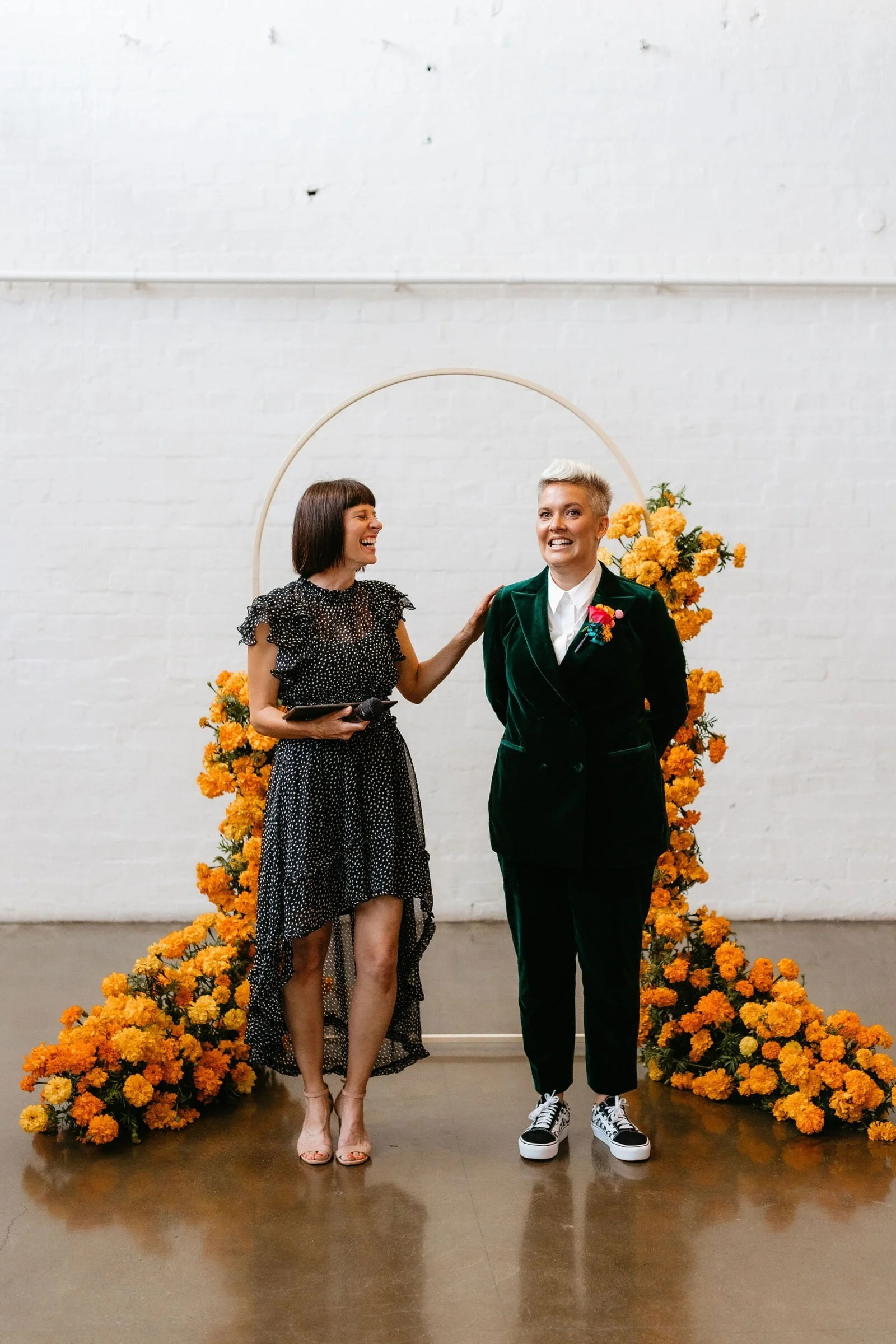 THE OUTFITS “Despite having three years to find the perfect dress, Elle left it right to the last minute and eventually opted for a couple of beautiful dresses (which was way more stressful for her mum and bridesmaids than her haha). She found them through Aje and ASOS, which she purchased about three weeks before the wedding. Knowing our guests would have high expectations for the flowers, it was definitely those that she was spending time dreaming of, rather than her outfit. I, on the other hand, had a beautiful green velvet suit made by the awesome team at Oscar Hunt. I had multiple consults with the team, and they were so excited to make such a vibrant suit for me. I cannot recommend them more highly — the craftmanship and hospitality displayed was absolute top tier.”