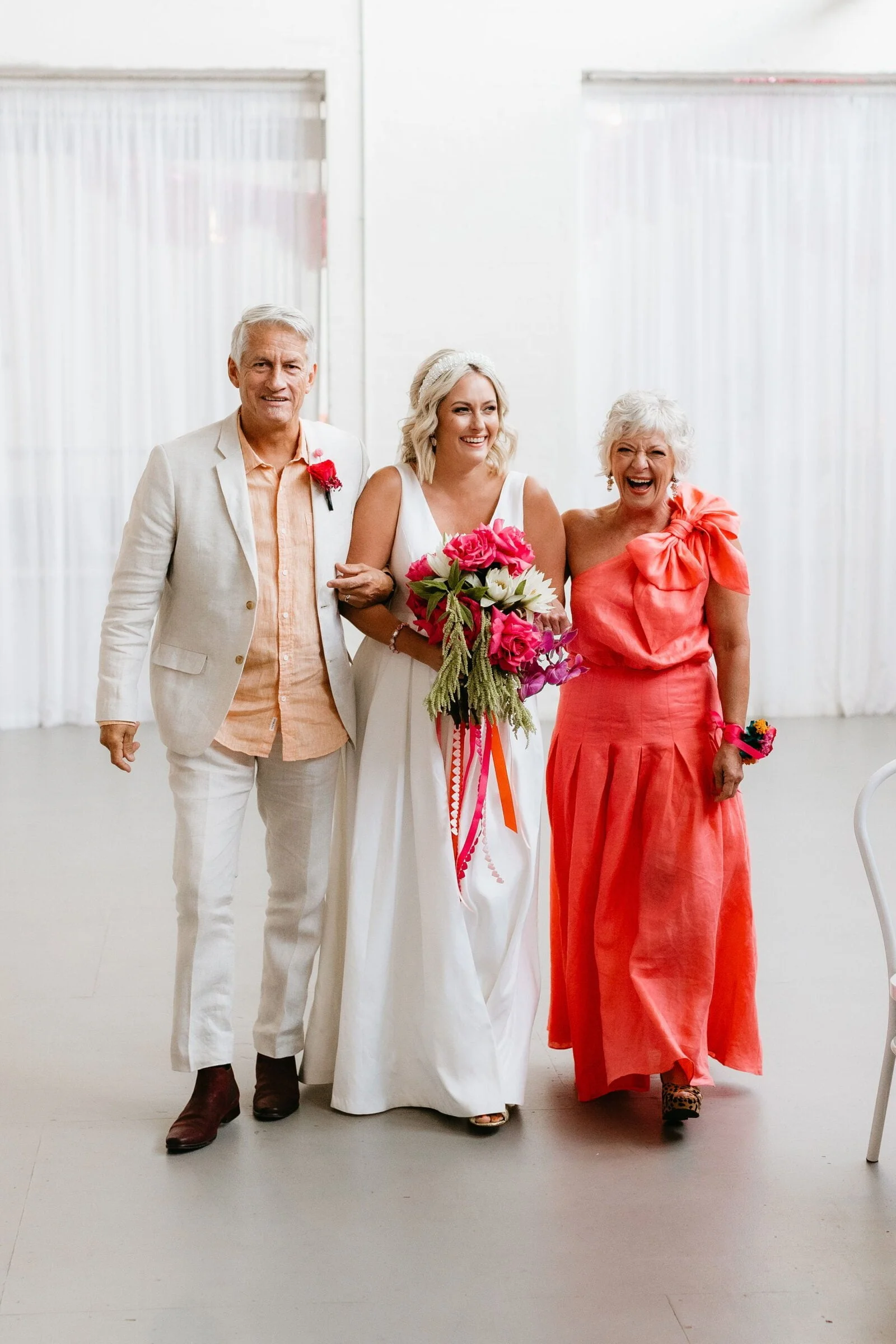 CONTRIBUTING VENDORS Photographer Miranda Stokkel Event Planner & Signage The Goodsmiths Stylist & florist Love Alfalfa Ceremony & reception venue The Wool Mill Catering Refresh Hospitality Cake Mali Bakes Wedding favours Sweet Mickie Hire items Pearl Creative Styling Entertainment The White Tree Celebrant Celebrate with Hailey Rings Millie Savage, Empires Diamond Australia Transport Chevy Red Hire Installation Bangin Hangins THE BRIDE (ELLE) ASOS, Aje Veil Mother Shoes Pink Inc, Topshop via ASOS Makeup Steph Sin Bridesmaid dresses Forever New Bridesmaid gifts Kirstin Ash via Reflections Silver Jewellery THE BRIDE (HELEN) Suit Oscar Hunt Shoes Vans Hair Drunken Barber Makeup Makeup HQ