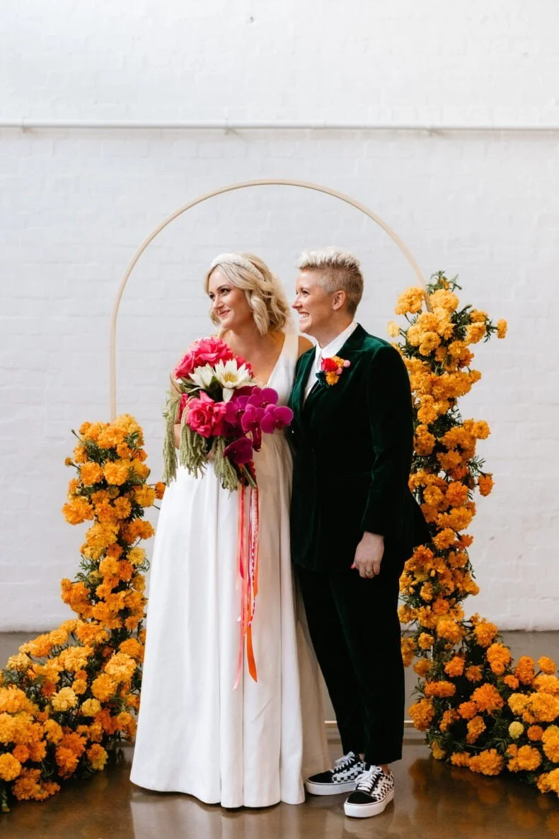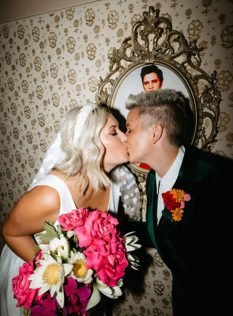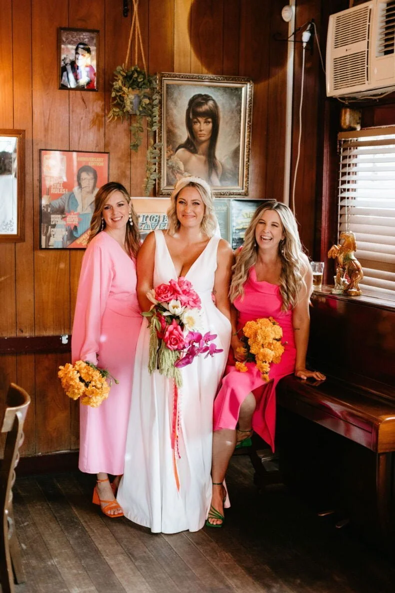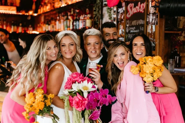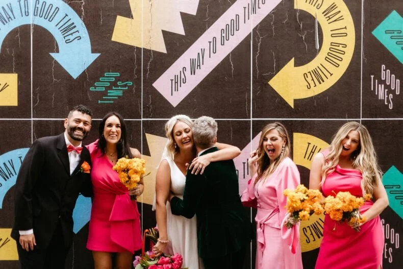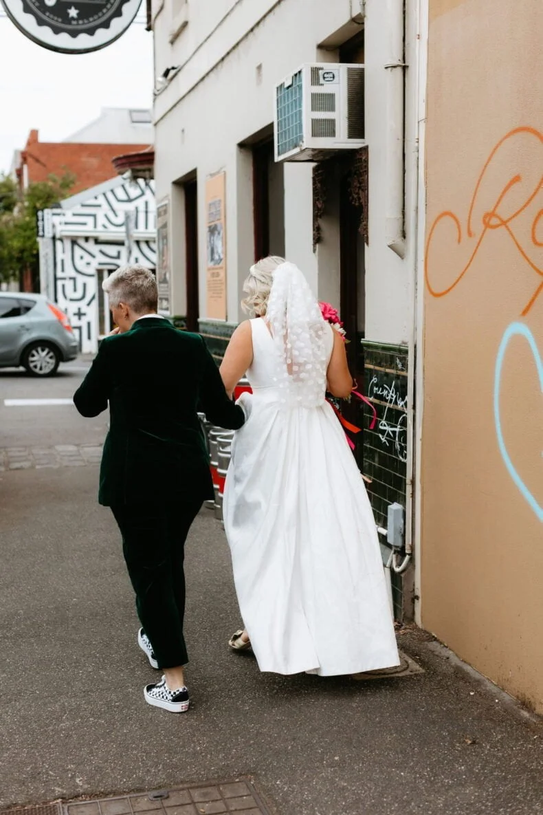 Helen and Elle first officially met at cool Collingwood dive bar The Gem, where Elle was pulling pints. Over a decade later, after a proposal in Paris, they headed back to the place where it began with their bridal party and rockstar photographer Miranda Stokkel in tow. “To return to the bar for wedding photos with our besties was really special,” Helen tells us. “We were lucky they were quiet and kindly let us have full-reign of the place to go wild for some killer photos.”