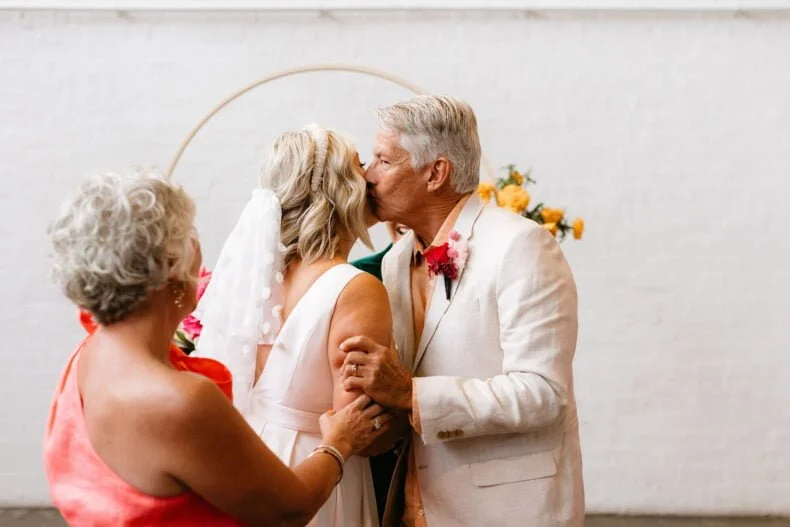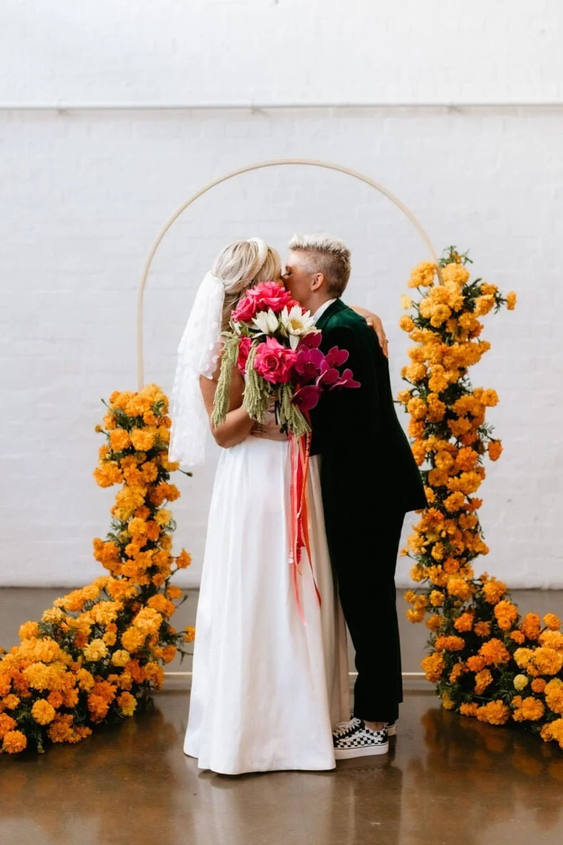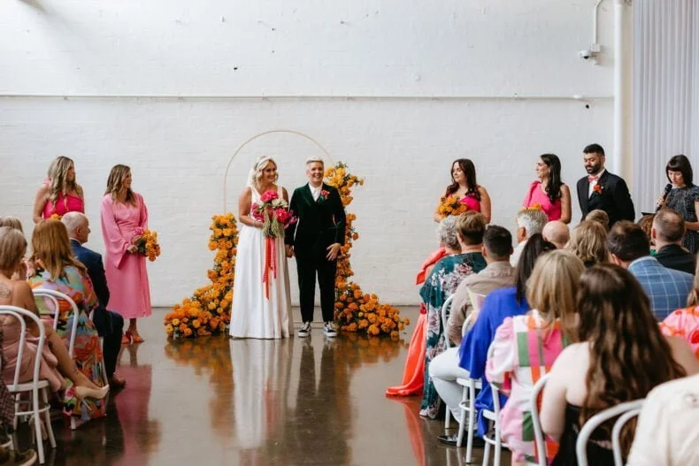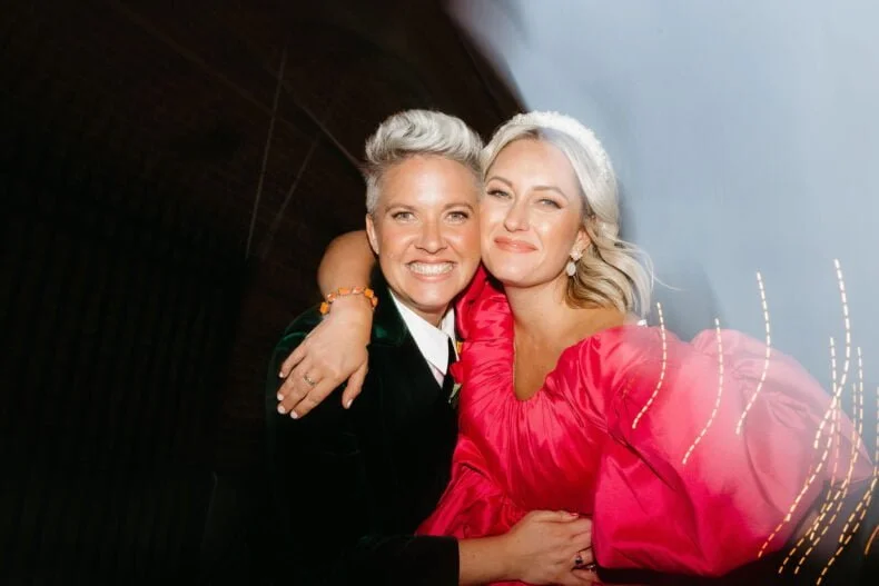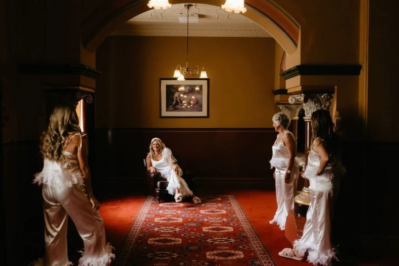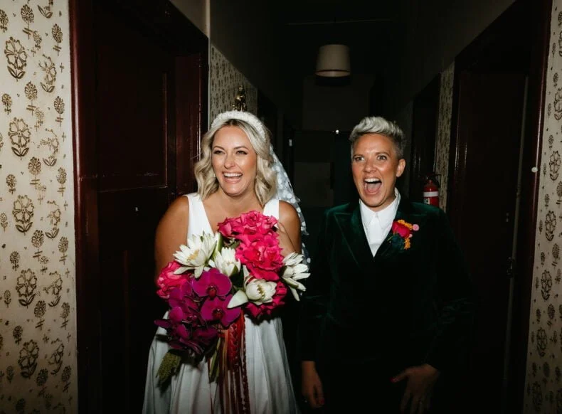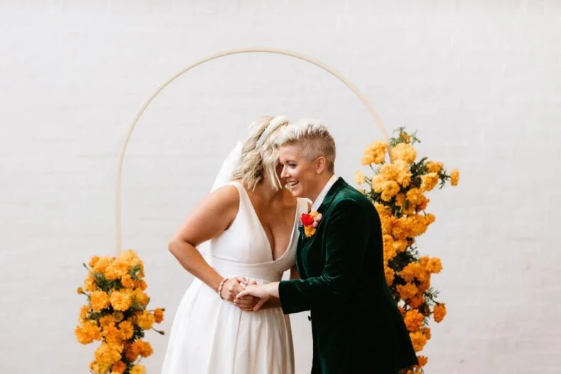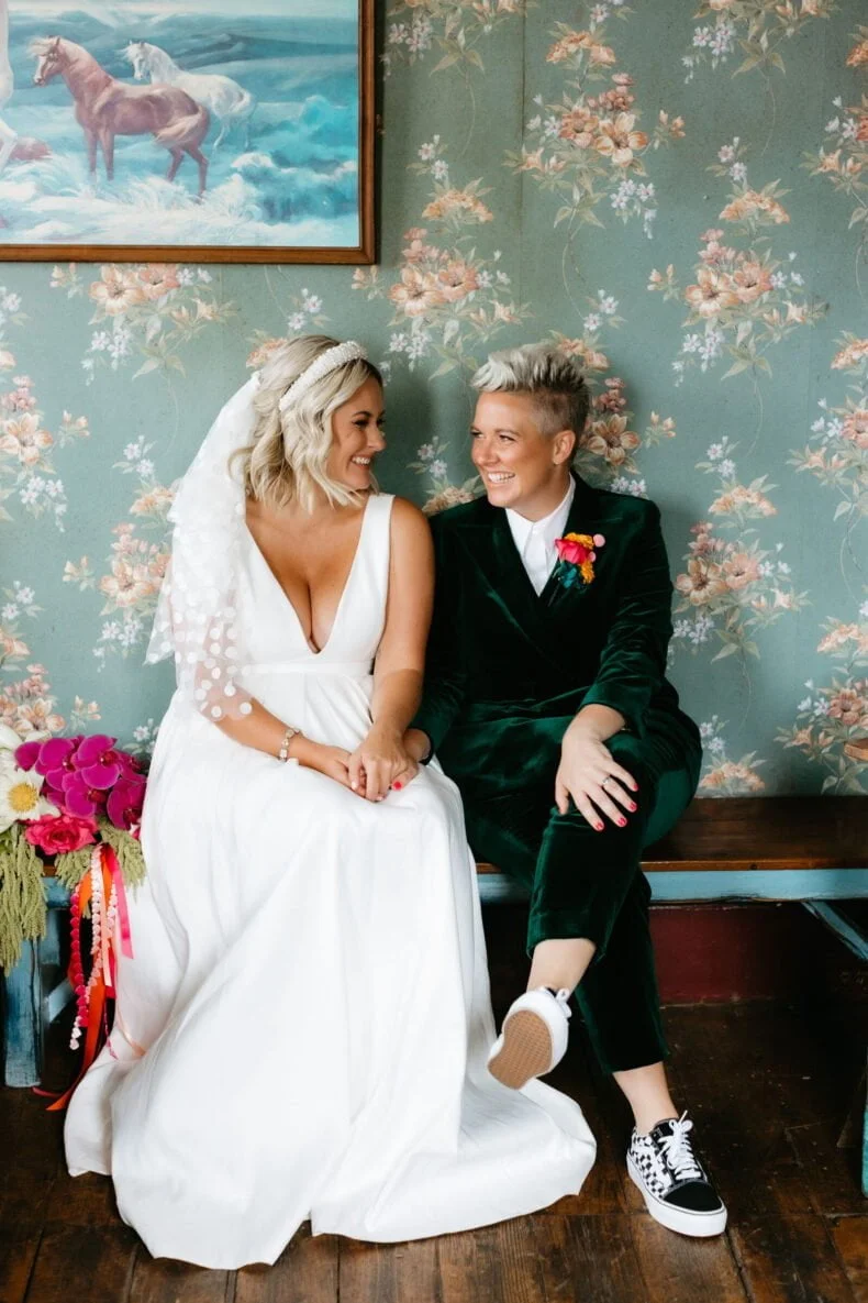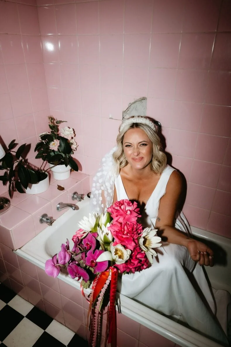Helen and Elle first officially met at cool Collingwood dive bar The Gem, where Elle was pulling pints. Over a decade later, after a proposal in Paris, they headed back to the place where it began with their bridal party and rockstar photographer Miranda Stokkel in tow. “To return to the bar for wedding photos with our besties was really special,” Helen tells us. “We were lucky they were quiet and kindly let us have full-reign of the place to go wild for some killer photos.”
