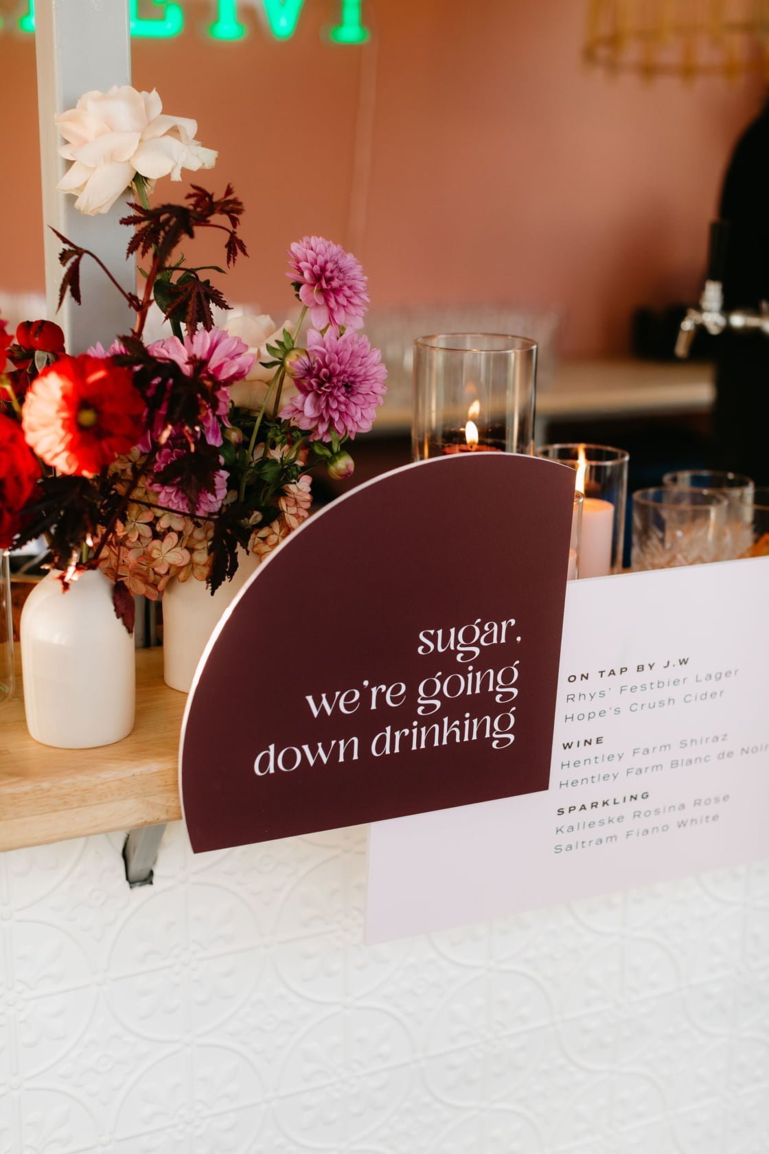 FAVE DETAILS “We wanted to ensure that everything had a touch of our personality and so for the signage we included a twist on some of our favourite bands or song names. For the bar sign we had “Sugar, we’re going down drinking”, which was a play on Fall Out Boy’s Sugar, We’re Goin Down. A little bit of emo nostalgia to reflect the memories we had at gigs or festivals together as teens.”