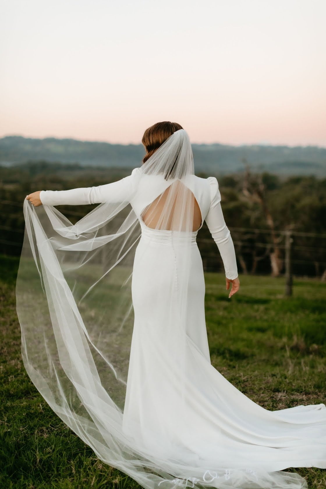 CONTRIBUTING VENDORS Photographer Miranda Stokkel Event Planner & Stylist Whole Lotta Love Creative Florist Wild Flos Stationery & Signage Laura Elizabeth Design Ceremony & Reception Cranleigh Park (private property) Catering Happy Camper Pizza Cake Mad About Cakes Other desserts Gelato by Bianco Latte via Happy Camper Pizza Hire Items Elderberry Event Hire, Paddock Dreams (toilets) Marquee Elderberry Event Hire Guest book Plain Ink Diary Celebrant Erin Davey Rings Larsen Jewellery Accommodation Magnolias on Mernda (pre-ceremony location) THE BRIDE Gown Pronovias Bridal Boutique Raffaele Ciuca Veil Madame Tulle Hairpiece ELEMENT OF M, Reliquia Collective Shoes Charlotte Mills Earrings The Traveller Series Hair Nicole Kene Makeup Stephanie Jane Bridesmaid dresses Aje, ASOS Bridesmate jacket M.J. Bale Bridesmaid shoes Bared Footwear, Merchant Bridesmaid gifts The Ugg Shop THE GROOM Suit & Shirt Oscar Hunt Tie/Bow tie Bowtie & Arrow Shoes R.M. Williams Barber Hardware LA Barbers Groomsmen suits M.J. Bale (shirts), Tommy Hilfiger (pants), Bowtie & Arrow (bowties, suspenders)