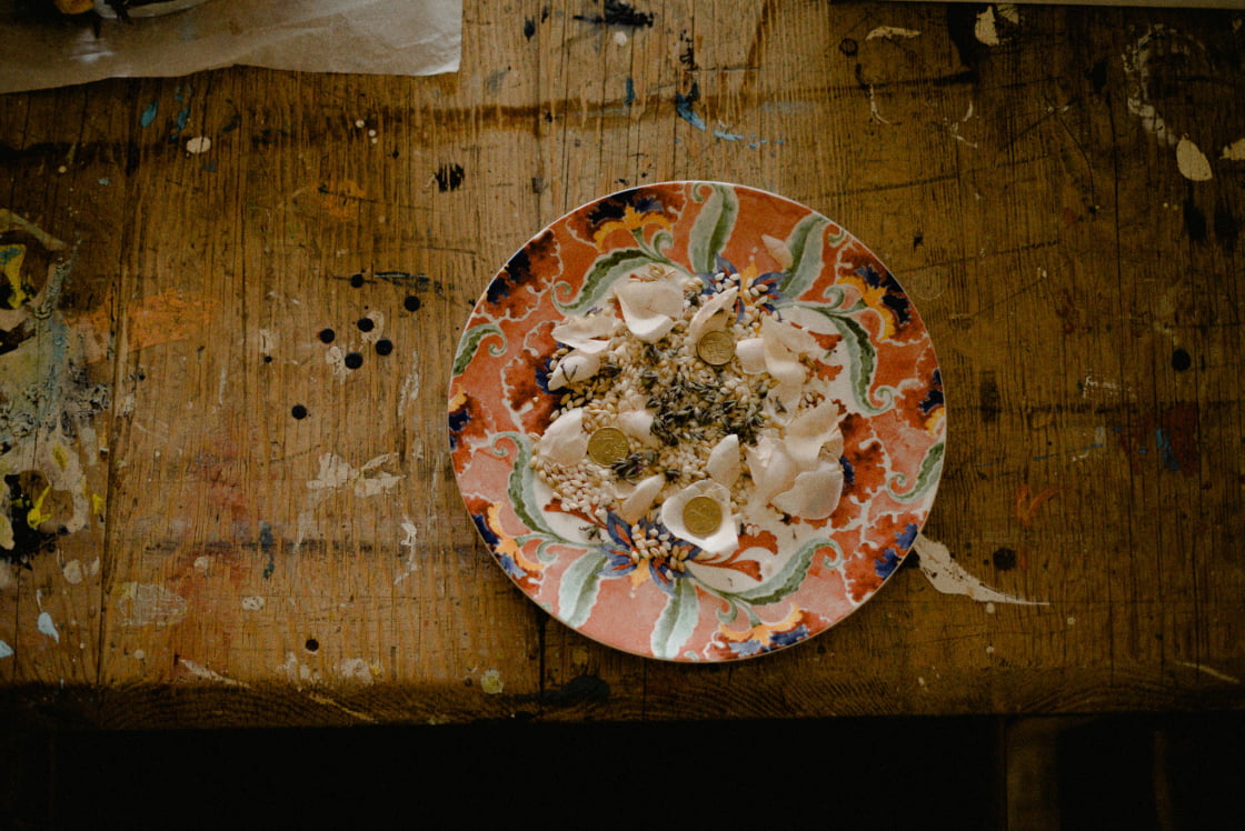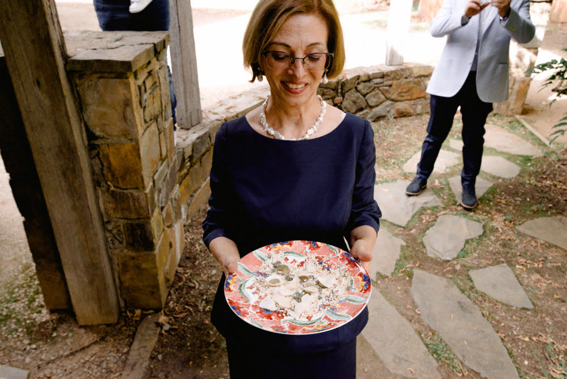 TALK ABOUT TRADITION “We had a Sardinian tradition at the wedding, my mother brought a plate from home and filled it with wheat, rice, flowers, and coins. She then asked my ancestors to walk beside me during my special day and to stay next to me, always. She then smashed the plate at our feet. The plate needs to break to bring good luck to the marriage.”