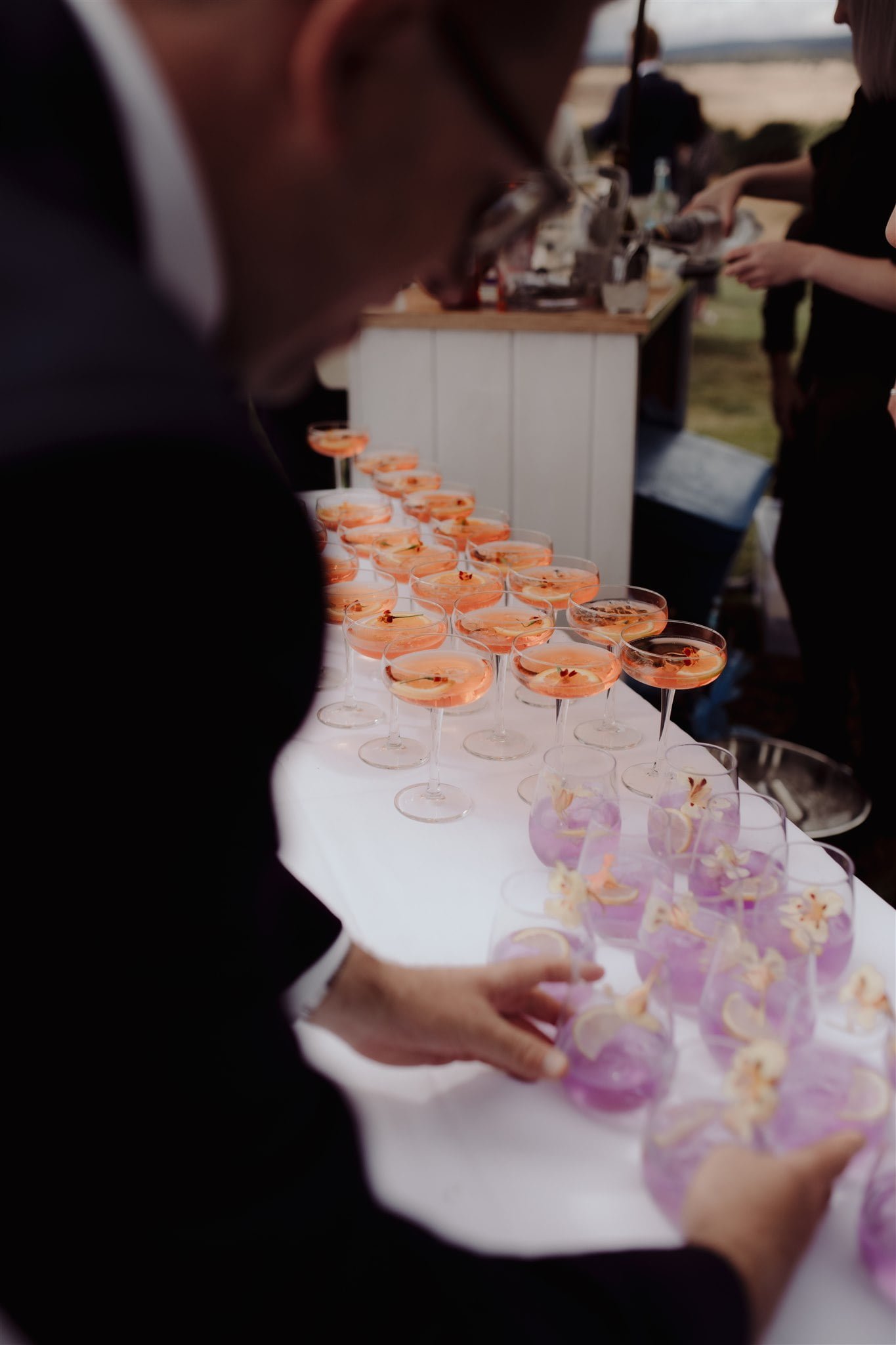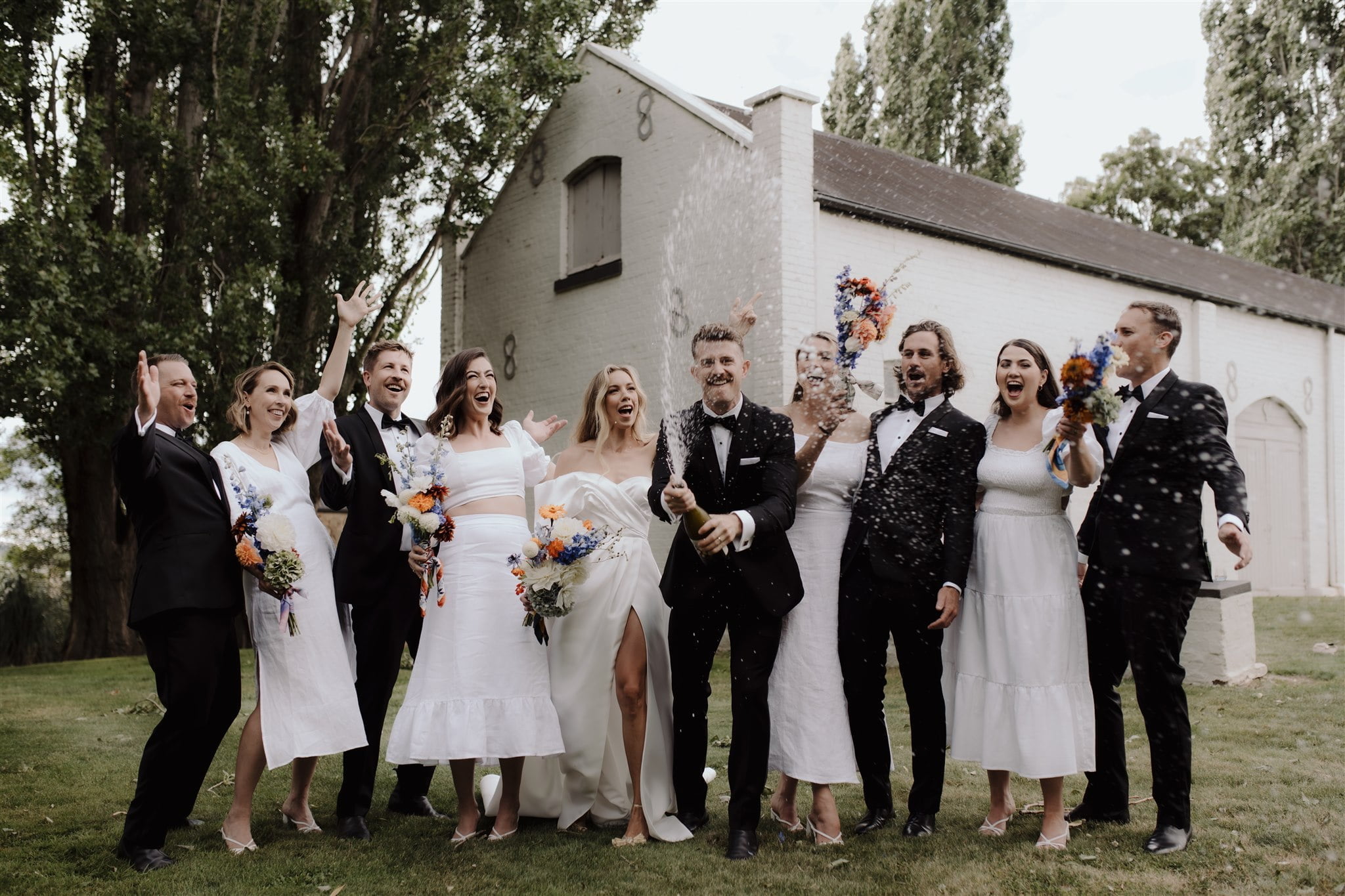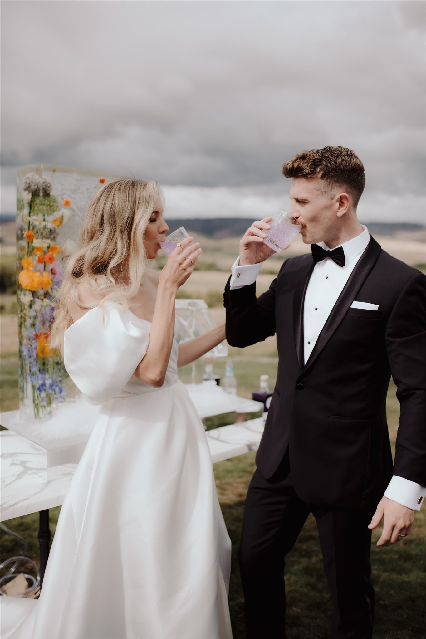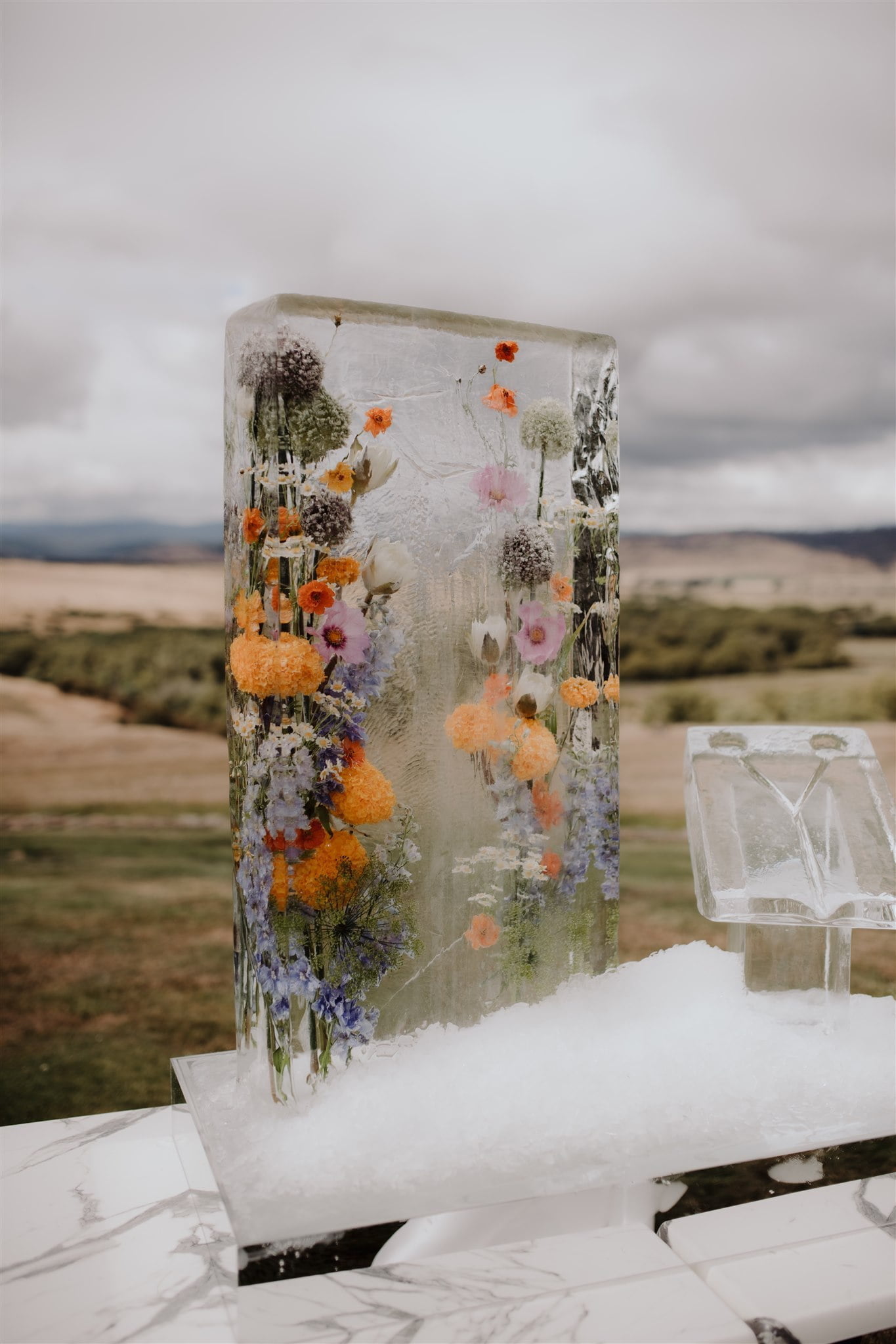 FAVE DEETS “The flowers – with a predominantly white colour palette, the bright bursts of colour from the flowers really stood out to give the ceremony space and dining tables some character. The ice sculpture by Antarctic Ice: Vetty commissioned a flower-infused ice sculpture that doubled as a piece of art and an ice-luge for pouring drinks. Straight after the ceremony, and with the sun starting to shine through the clouds, our guests poured themselves gin and tonics and mingled on the lawn.”