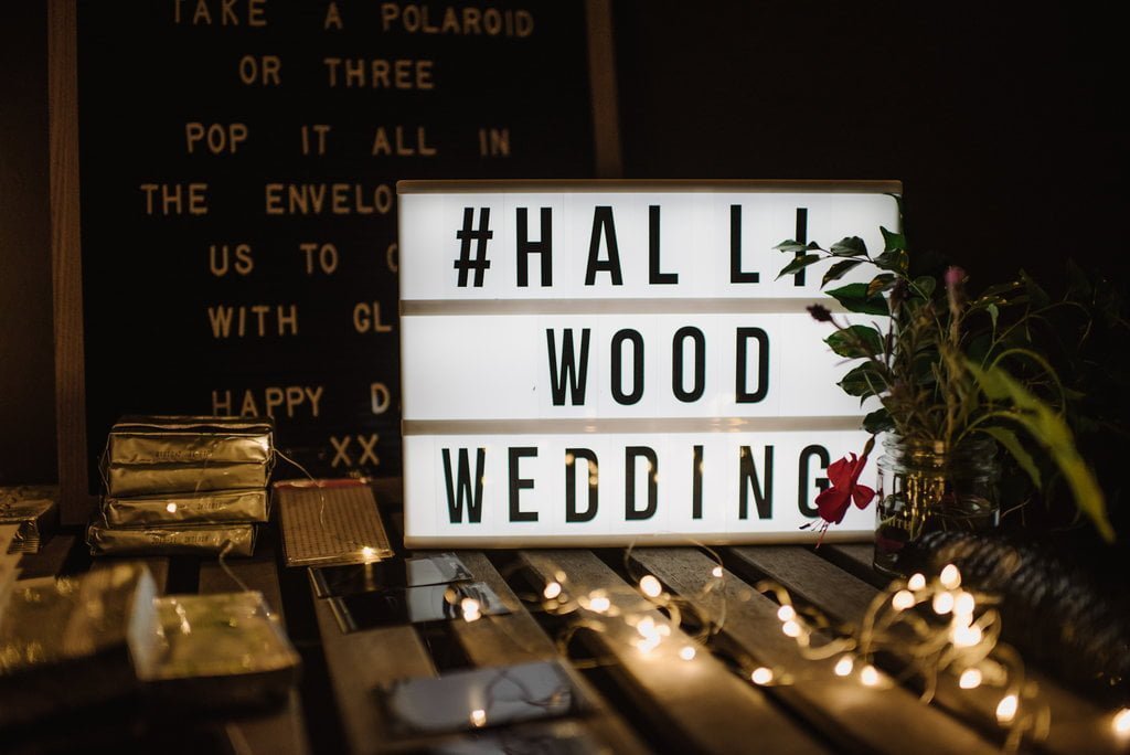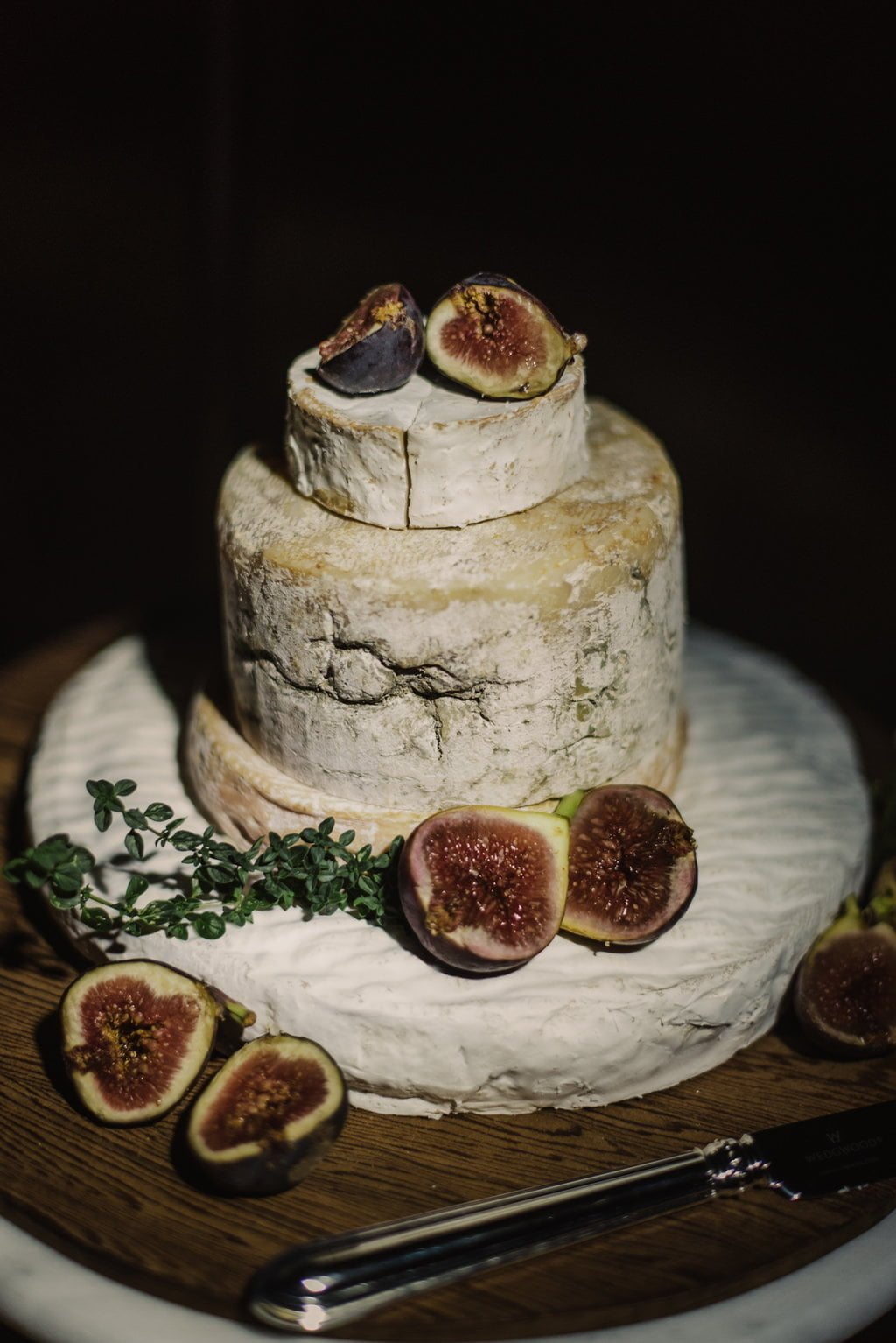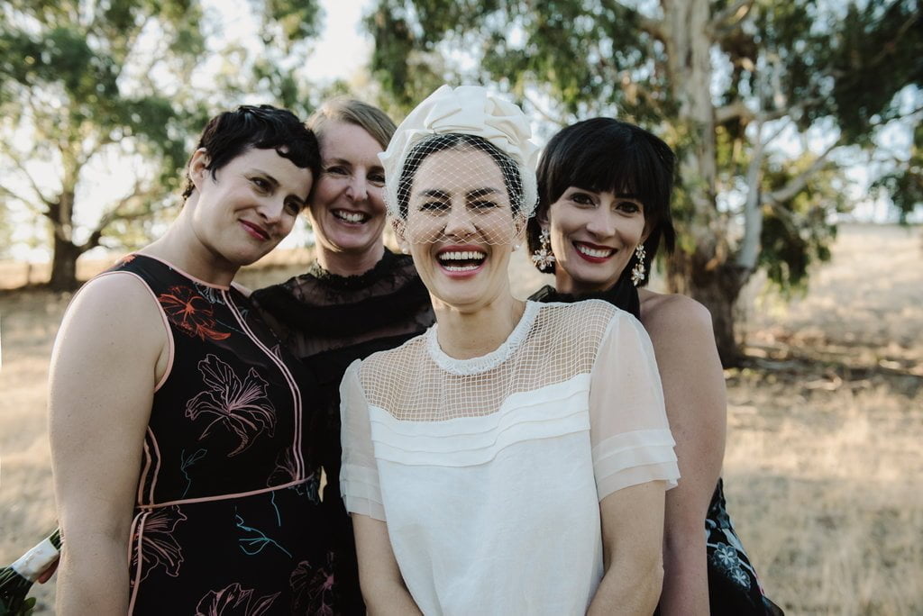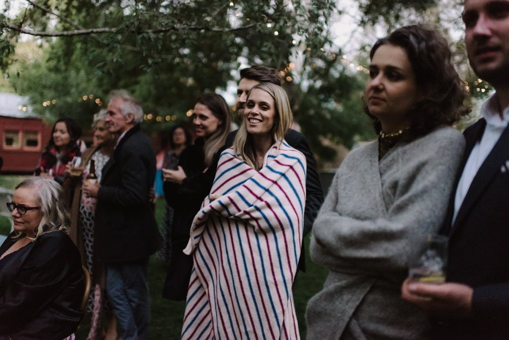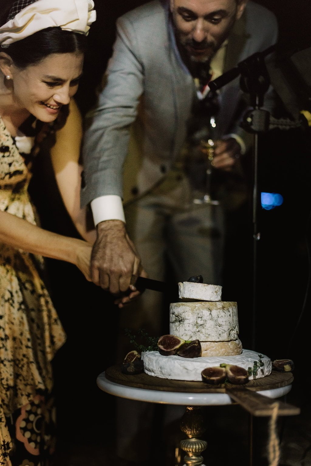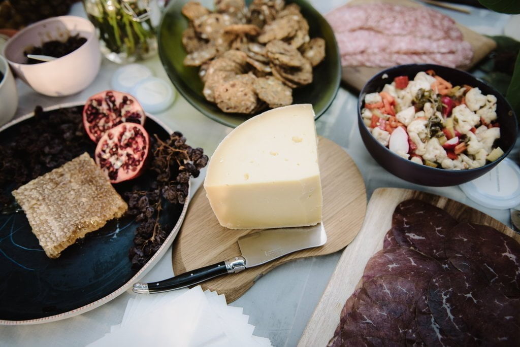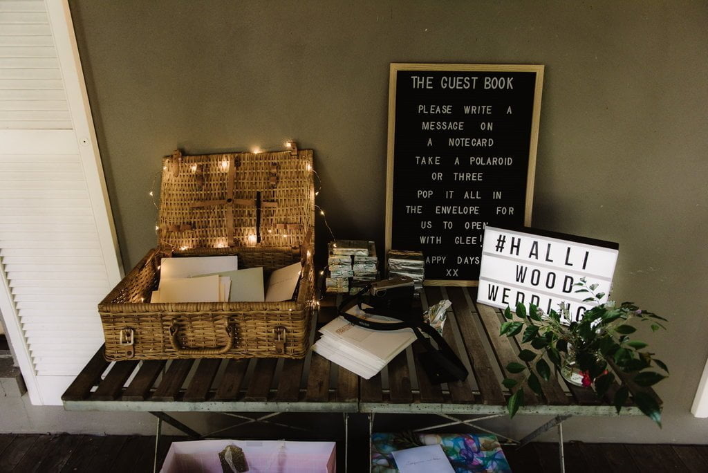 DIY “We sourced a simple letterpress invite from Minted. and then I created envelope liners to give it more pizazz. We got a return address stamp from Woodruff & Co, wax and an ‘H’ wax seal. Set-up and styling were all done on the morning of- I had researched images of outdoor weddings for inspiration (Instagram, Hello May, Pinterest) and knew what would suit the garden. Adam and I love all things cheese and charcuterie. In the lead-up, we ordered our favourites from our local butcher, Meatsmith, and gathered all our plates and cheese knives/boards for it all to go on. At the house, we found plum, walnut and almond trees for decoration. For the guest book, we wanted the classic ‘take a Polaroid’ thing, but didn’t want to have to have people sticking and writing in a book. Instead, I found letterpress notecards from Bespoke Letterpress and had everyone write on a card and put the polaroids and card in an envelope.”