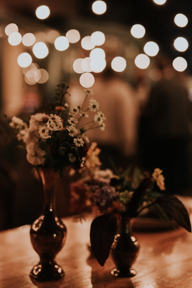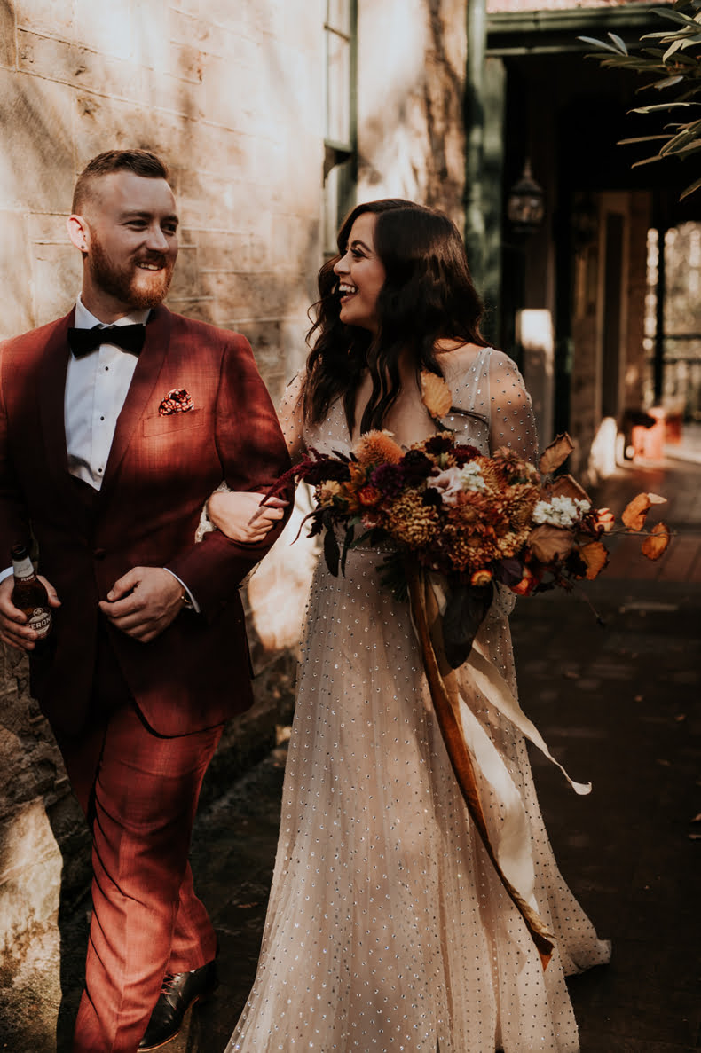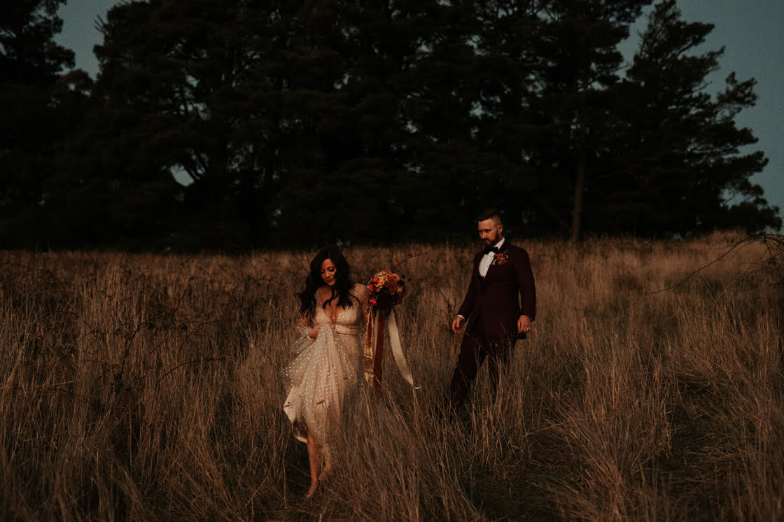 THE THEME “When we got engaged, Alex said he wanted autumn, Adelaide Hills, pizza, red wine, fire and hot doughnuts. How could I argue with that?! I love bold colours, brass and velvet, and vintage furniture. However, I also wanted to keep it simple so the trees and lighting would shine. When chatting to Dainty Posy we jokingly decided our theme was ‘Old Velvet armchair’ – i.e. comfy, warm and timeless. The only decorations we had were gorgeous vintage brass vases and red velvet lounges from Minty Mary Pea.”