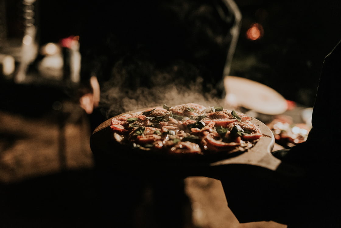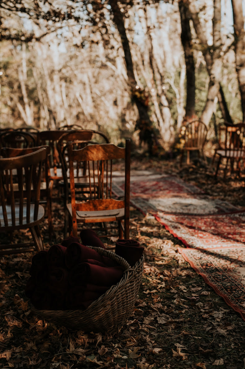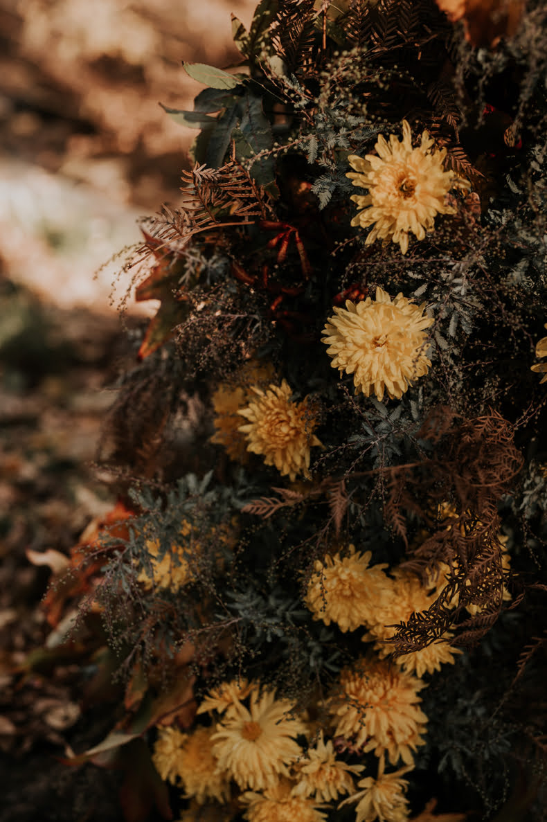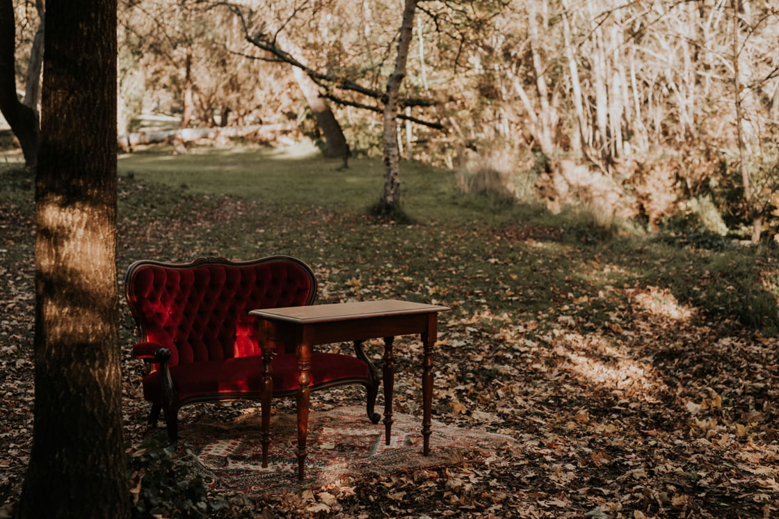 THE THEME “When we got engaged, Alex said he wanted autumn, Adelaide Hills, pizza, red wine, fire and hot doughnuts. How could I argue with that?! I love bold colours, brass and velvet, and vintage furniture. However, I also wanted to keep it simple so the trees and lighting would shine. When chatting to Dainty Posy we jokingly decided our theme was ‘Old Velvet armchair’ – i.e. comfy, warm and timeless. The only decorations we had were gorgeous vintage brass vases and red velvet lounges from Minty Mary Pea.”