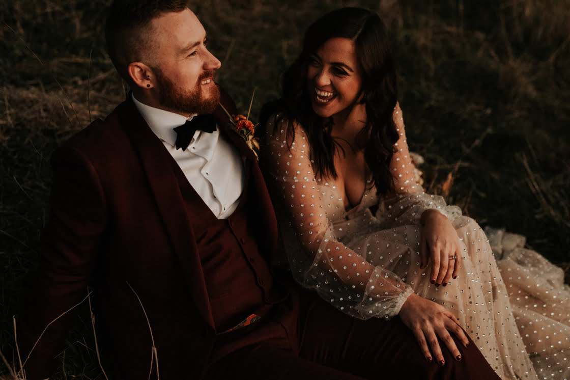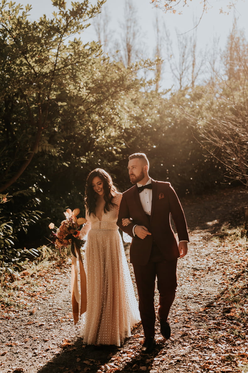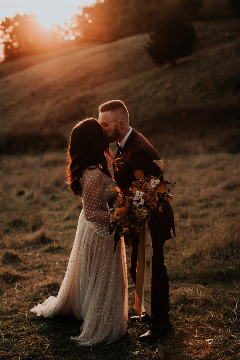 If warm doughnuts by a roaring outdoor fire sounds like a good time; if shades of gold and burnt orange are your vibe; and if ‘autumnal dream’ pretty much sums up your ideal wedding theme, well, we have the big day to satisfy your peepers! With moody snaps shot by our friends at Lilac in Hand, Kate and Alex’s May 2021 wedding is a literal winter wonderland to behold – complete with fire pits, people. “We adore camping and there is nothing better on a freezing night than huddling up around a fire,” gushes the bride. “Our wedding date was picked around the fire restrictions!”