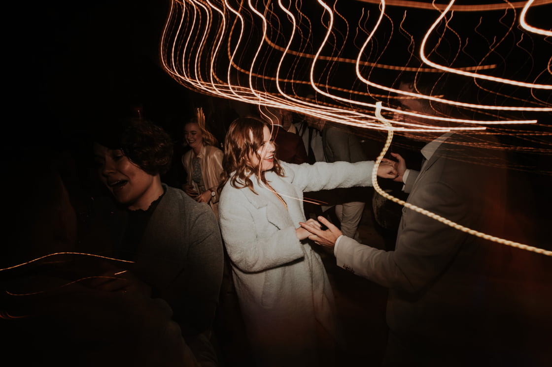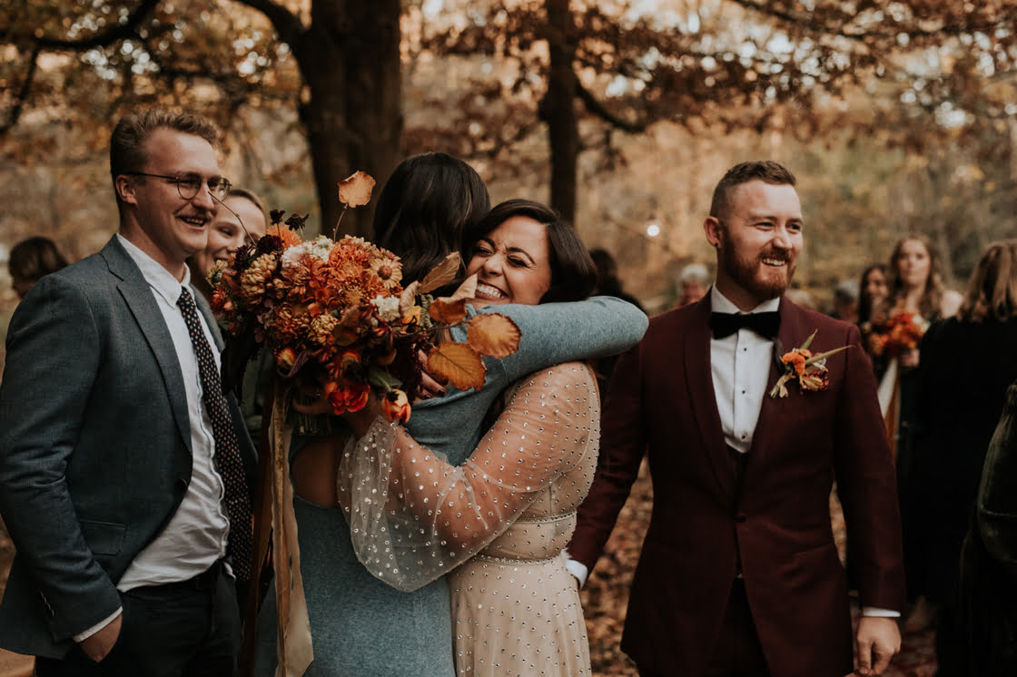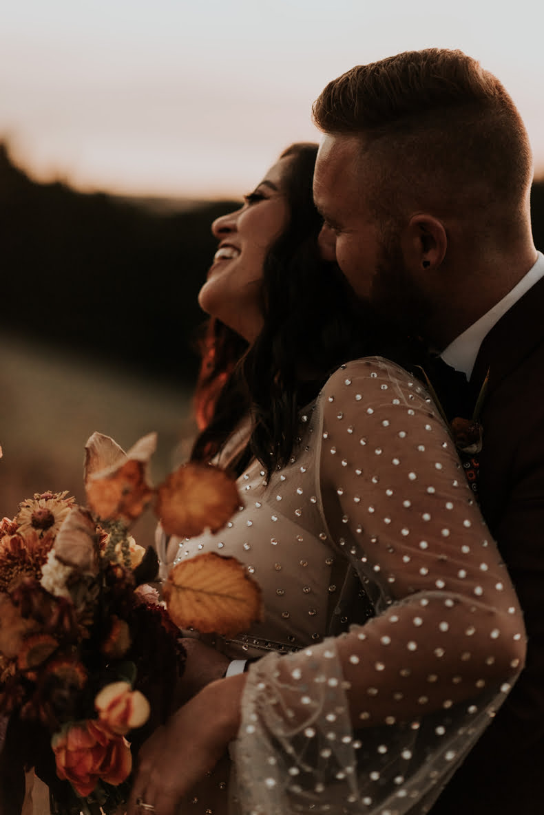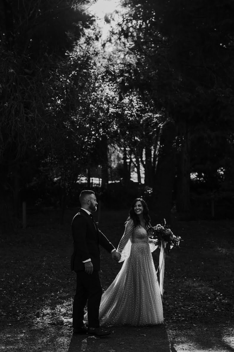 If warm doughnuts by a roaring outdoor fire sounds like a good time; if shades of gold and burnt orange are your vibe; and if ‘autumnal dream’ pretty much sums up your ideal wedding theme, well, we have the big day to satisfy your peepers! With moody snaps shot by our friends at Lilac in Hand, Kate and Alex’s May 2021 wedding is a literal winter wonderland to behold – complete with fire pits, people. “We adore camping and there is nothing better on a freezing night than huddling up around a fire,” gushes the bride. “Our wedding date was picked around the fire restrictions!”