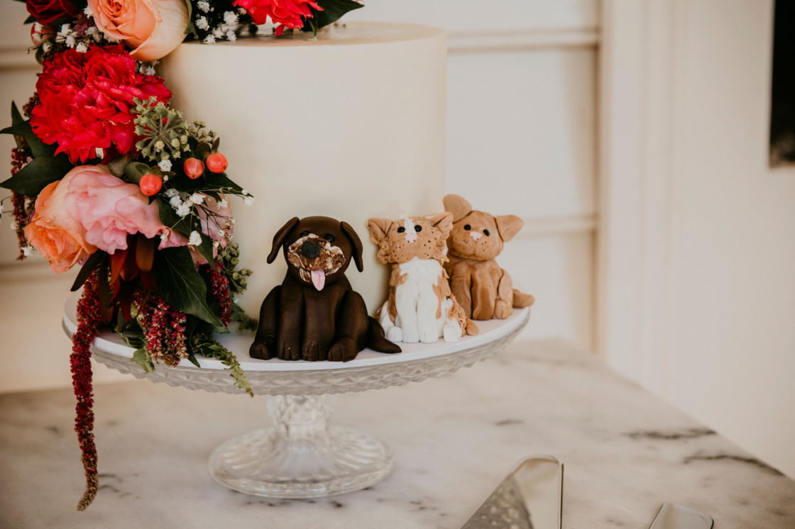 FAVOURITE DETAILS “We love our fur babies – Hudson (labrador), Watson (ginger and white cat), Oliver (ginger cat) – but unfortunately they couldn’t be trusted to behave on the day so they couldn’t come along and be our groomsmen. The next best thing to having them there was having them on our cake so we had them immortalised in fondant by Creating Monkies. We wanted our cake to be something pretty special and it was all that and more with fondant Hudson, Watson and Oliver watching over the day. It was also the yummiest cake we’ve ever tasted – salted caramel mud with vanilla buttercream. Shaz from Blackbird Cakes cakes knows her stuff. Who says you can’t have a cake for a wedding of six people? It means you can have cake for breakfast for weeks afterwards, too!”