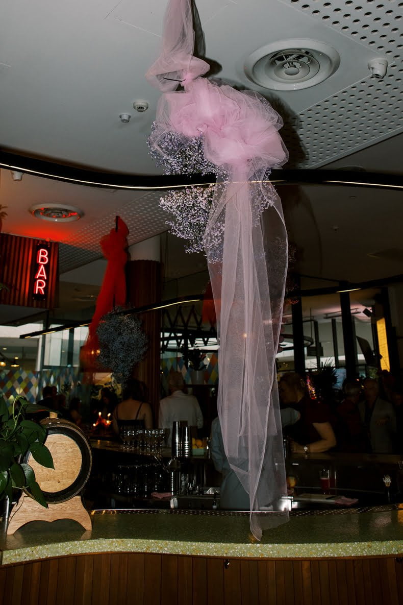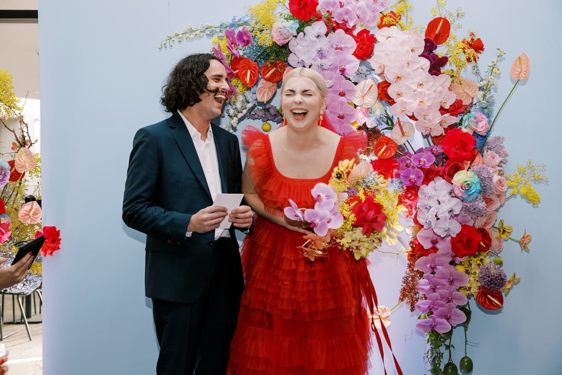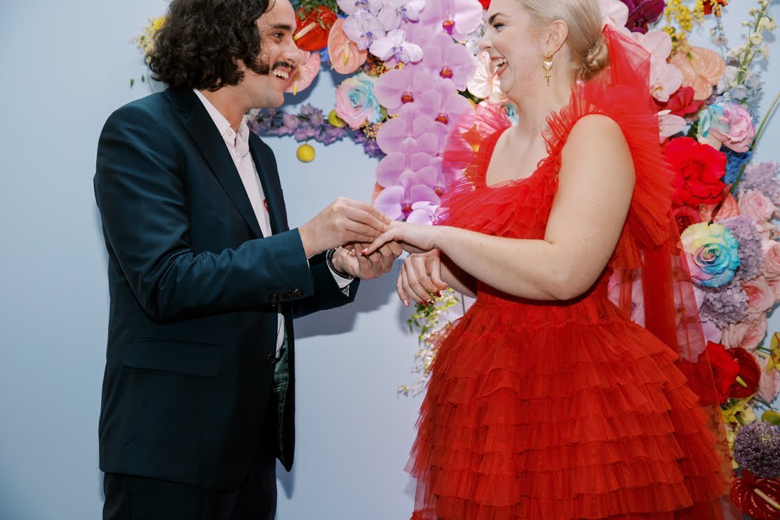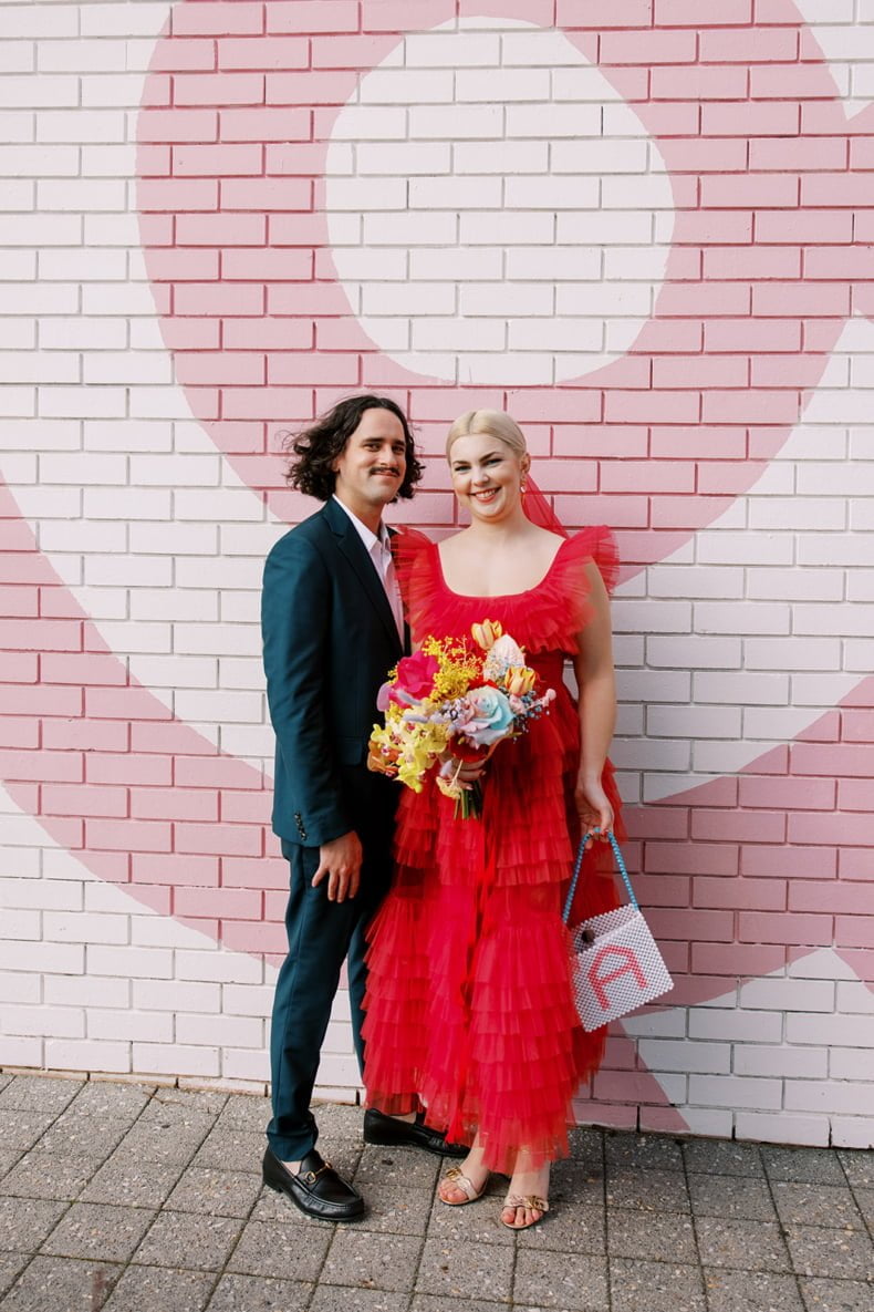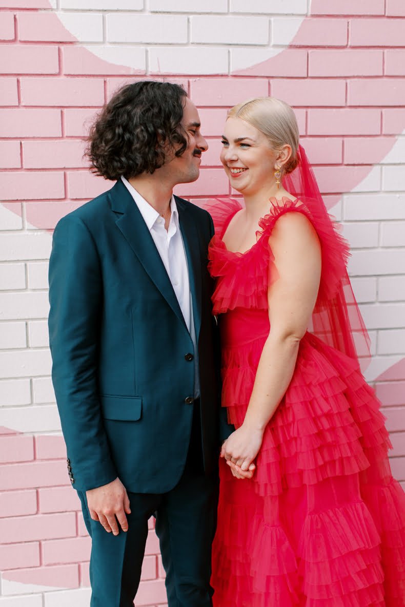 THE DRESS “Molly Goddard is one of my favourite designers – and I thought a big tulle dress would be very on-theme. I was originally chatting to the MG team about a custom white wedding dress but the timing just wasn’t going to work. I saw the pinky-red dress online and there was one left in my size so I thought it was destiny. When I got in touch with Molly Goddard to let them know we wouldn’t be needing a custom dress and I had bought one of their colourful dresses online, they asked if I knew they did custom veils in different colours and that they could have one made and sent to Australia in time. It was perfect!”