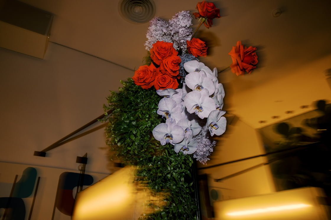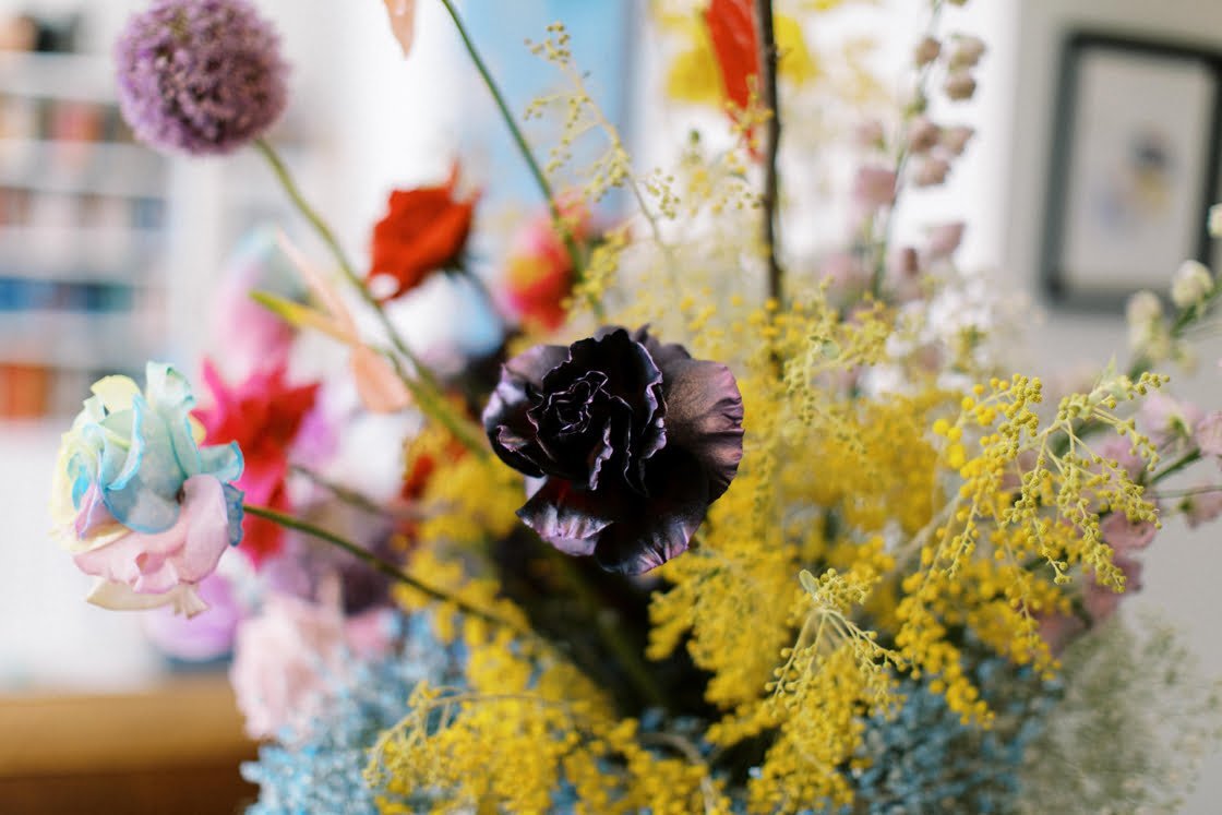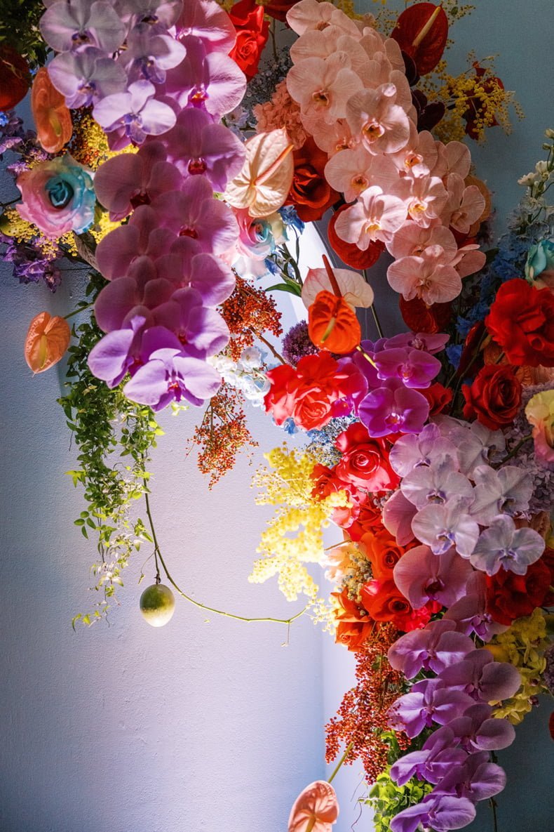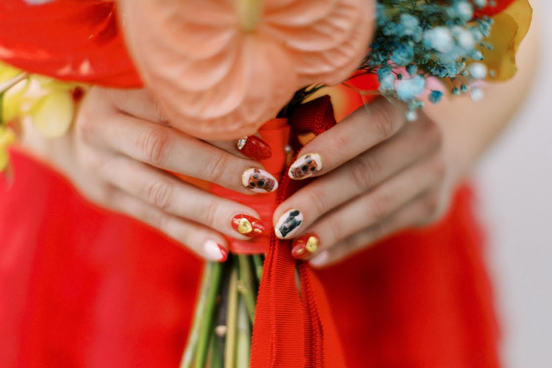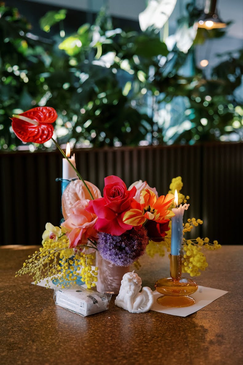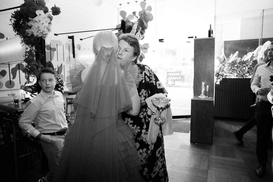 THE DRESS “Molly Goddard is one of my favourite designers – and I thought a big tulle dress would be very on-theme. I was originally chatting to the MG team about a custom white wedding dress but the timing just wasn’t going to work. I saw the pinky-red dress online and there was one left in my size so I thought it was destiny. When I got in touch with Molly Goddard to let them know we wouldn’t be needing a custom dress and I had bought one of their colourful dresses online, they asked if I knew they did custom veils in different colours and that they could have one made and sent to Australia in time. It was perfect!”