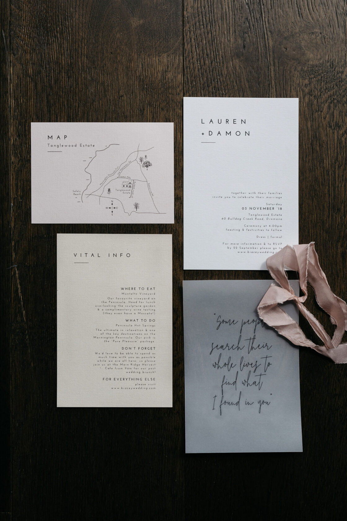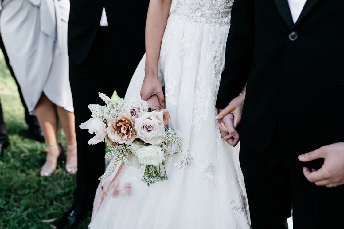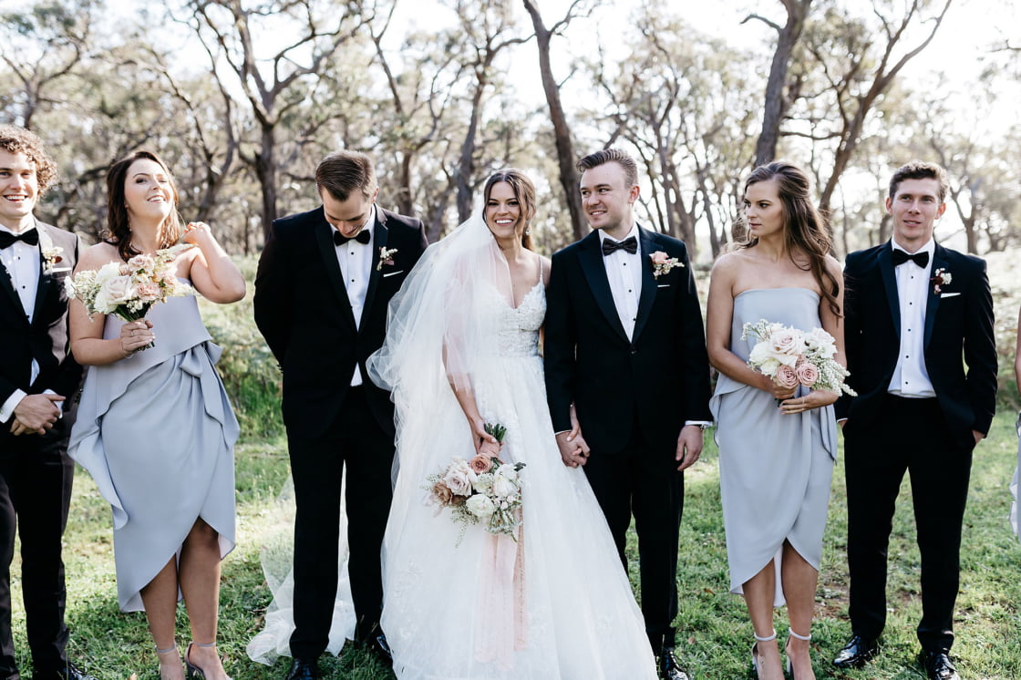 CONTRIBUTING VENDORS Photographer Ali Bailey Cinematographer Nathan Kaso Event Planner Laura Willis of Wanderlust Creative Florist Botanica Fresh Flowers Stationery Sparklers & Confetti, White Ink Design Co Venue Tanglewood Estate Catering Provider Cake Provider Hire Items Claire and Clay Entertainment The White Tree Band Celebrant Kate Morgan Rings Denzil Price Jewellery (Friend) Transport Silver Wings Chauffeured Limousines BRIDE Dress Enzoani via White Lily Couture Robes Sleeping With The Enemy Veil White Lily Couture Shoes Nina Shoes Earrings & Bracelet Samantha Wills Hair & Makeup Megan Harrison BRIDESMAIDS Dress Esther Luxe Shoes Billini GROOM Suit Mr A Taylor Tie Michael Innis Menswear Cufflinks OTAA Shoes Aquila Watch Breitling Barber Mr Snippets