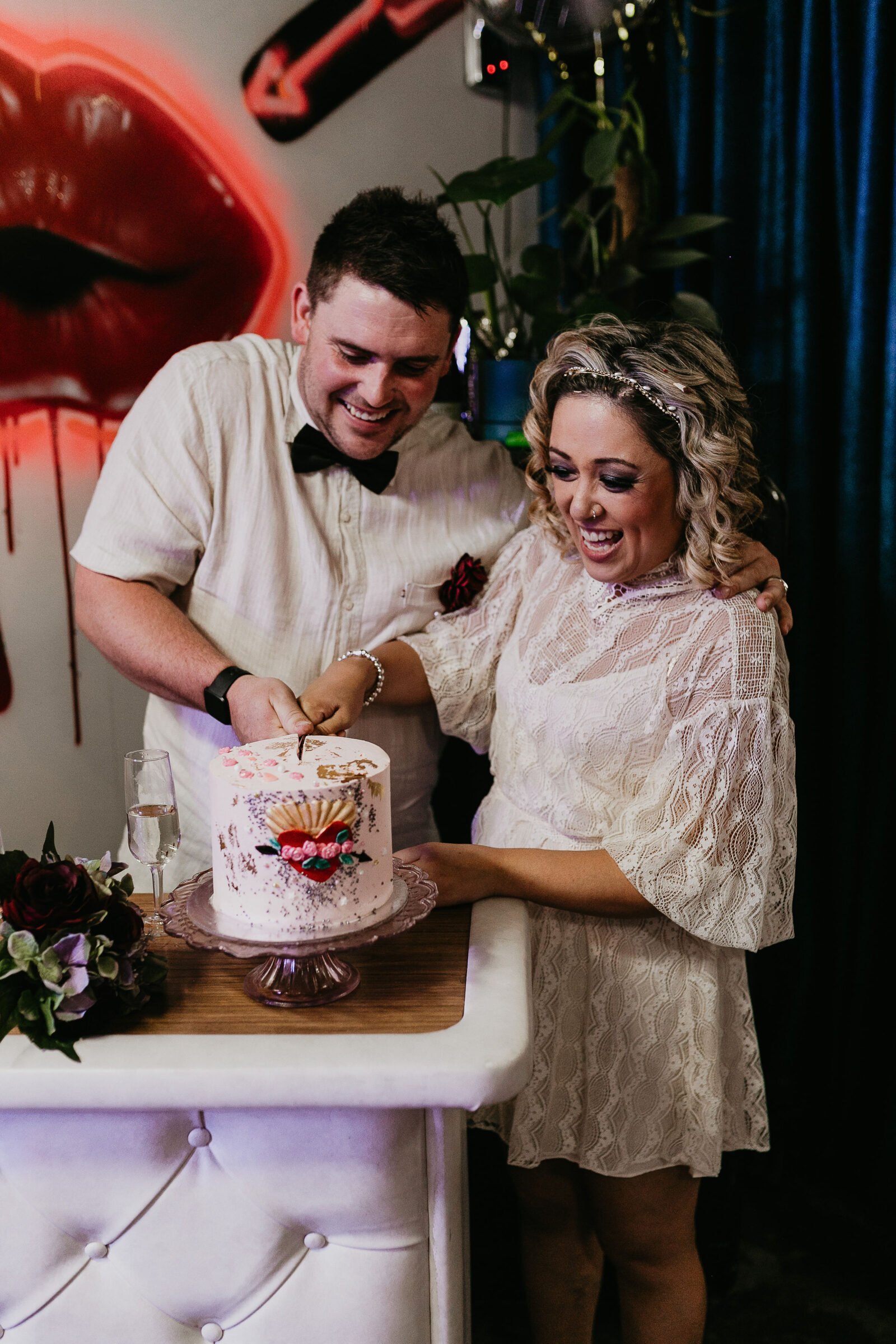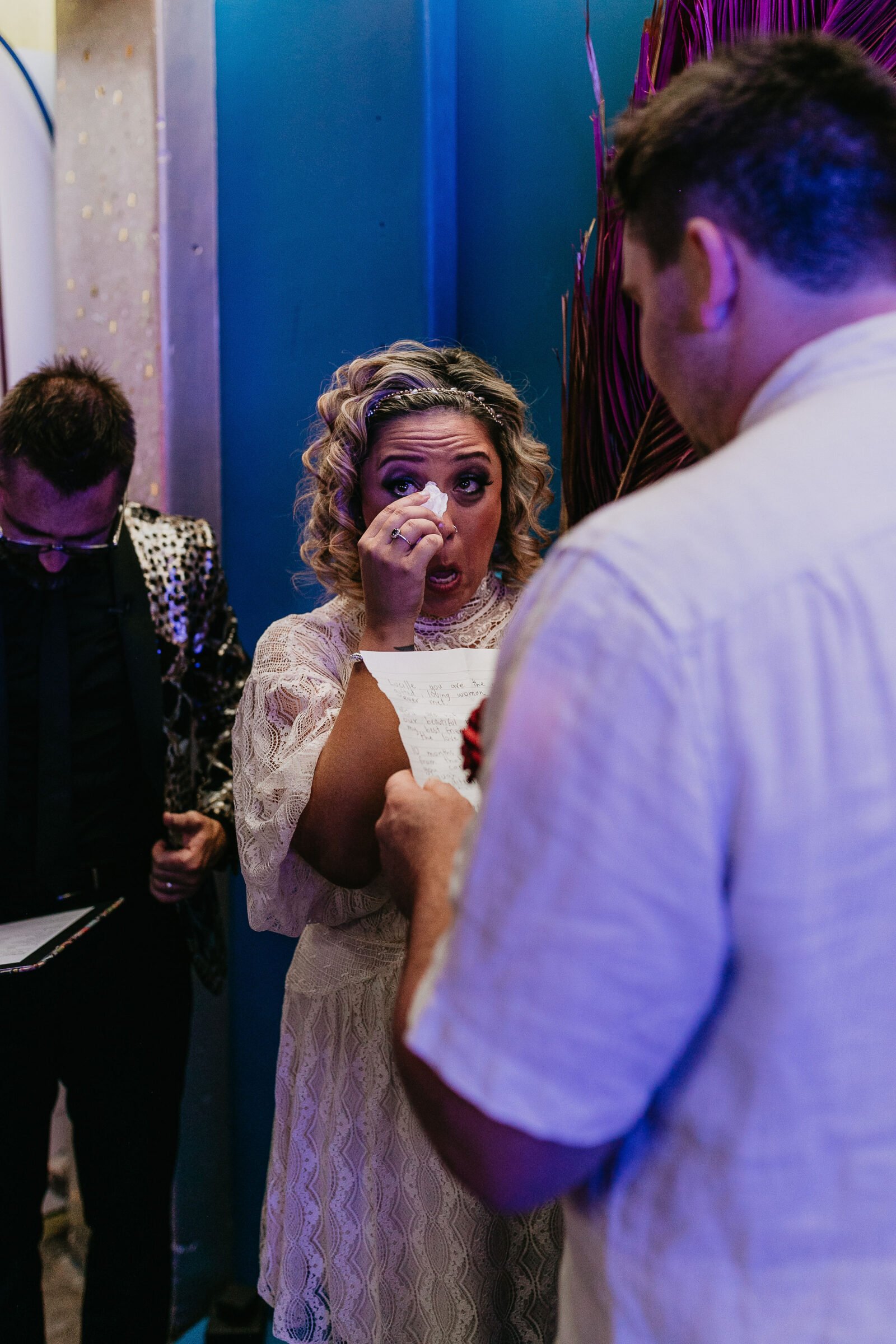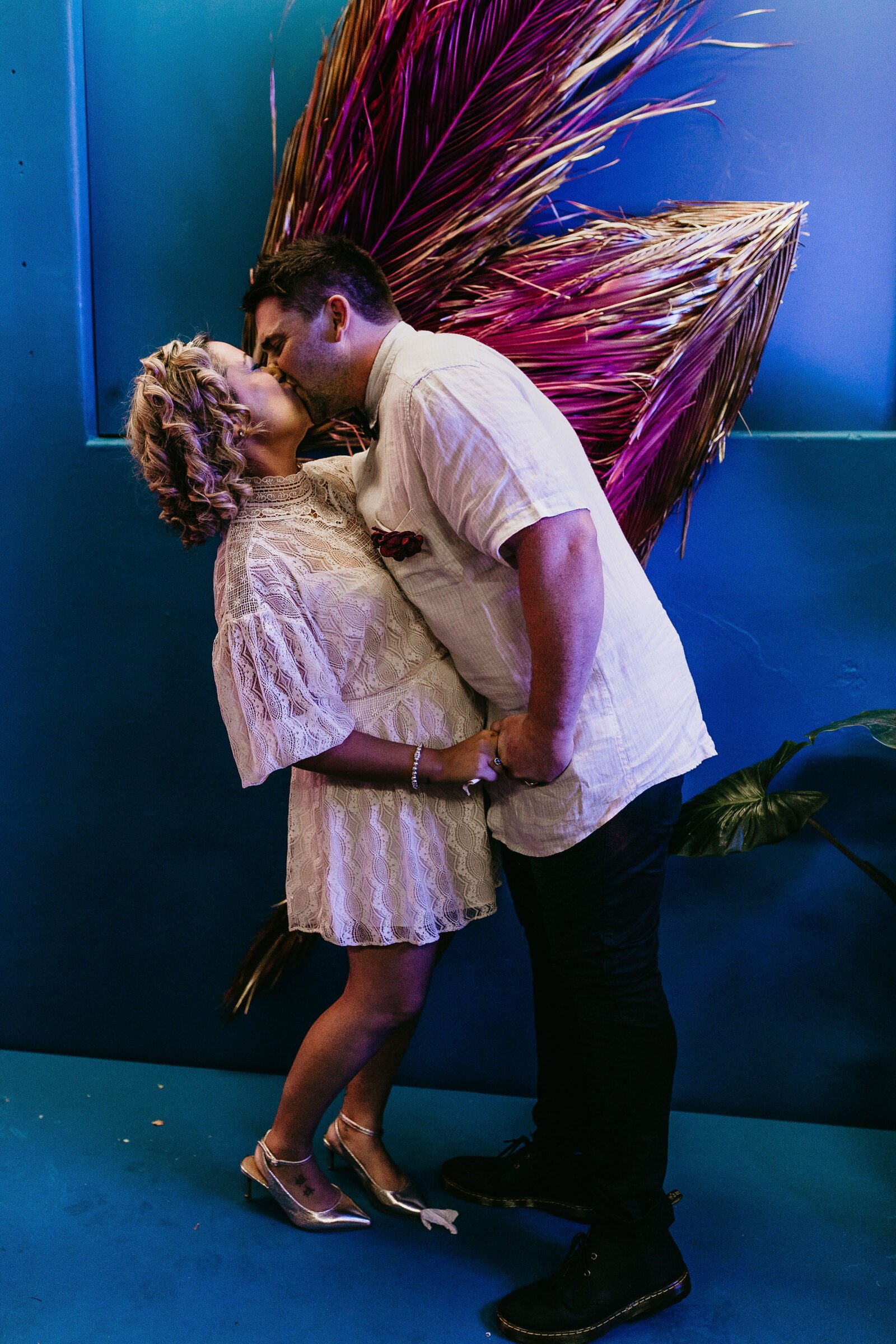 After six years together, hopeless romantic Billy proposed to Lu in a fairy light strewn gazebo and from the sounds of things, Lu was pretty stoked, as she tells us, “When we got underneath the gazebo there was a small table with a framed photo of our baby’s ultrasound and a lightbox next to it with the words “Will you marry daddy?” Billy then gave me the ring and I said yes!”. Opting for a Vegas registry style wedding, complete with an epic Photo Booth (Heres looking at you Heartbreak Hotel Photo Booth), the pair were channelling an urban retro vibe. Scroll down for some fab captures from the wonderful Miranda Stokkel…