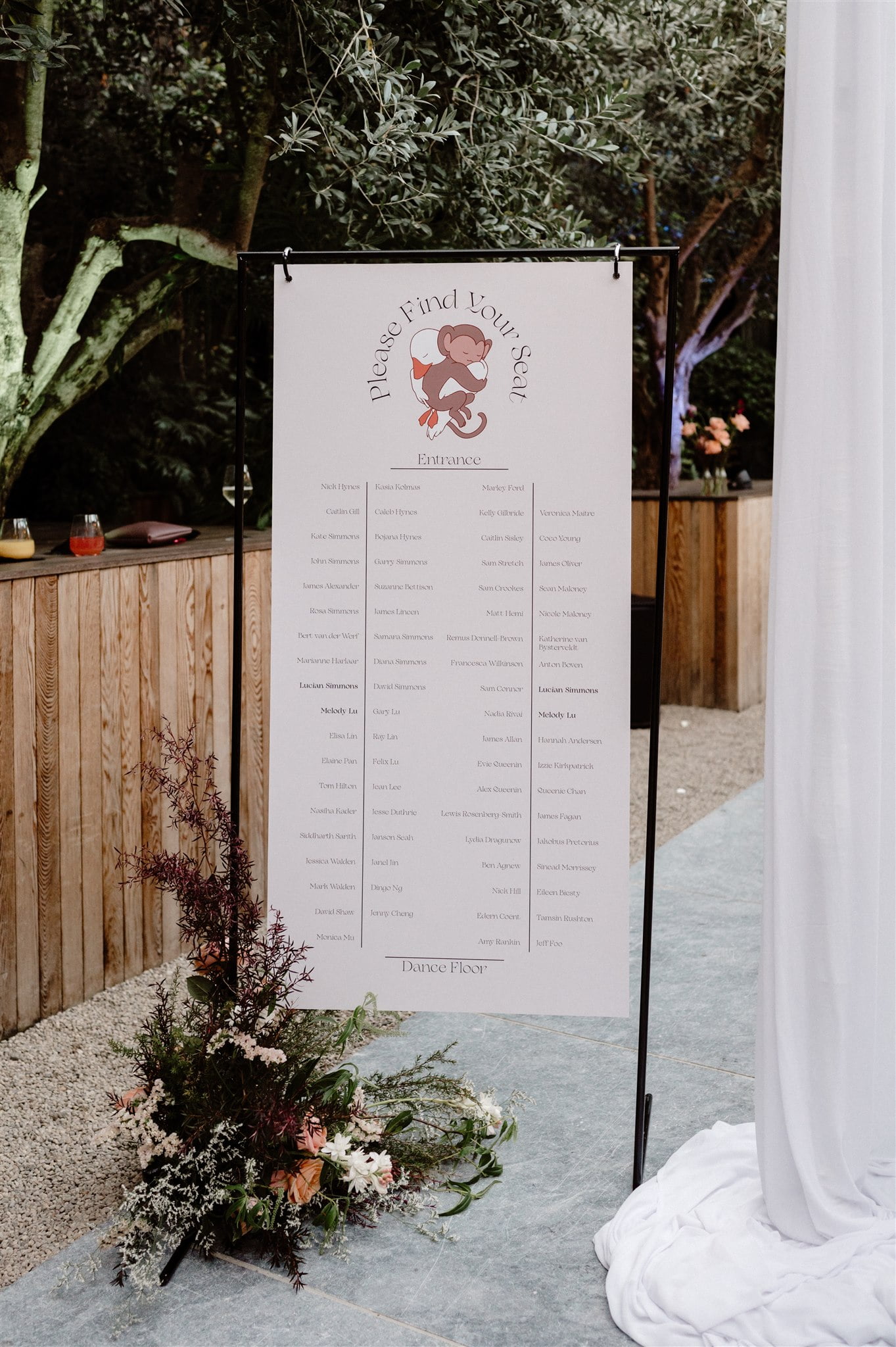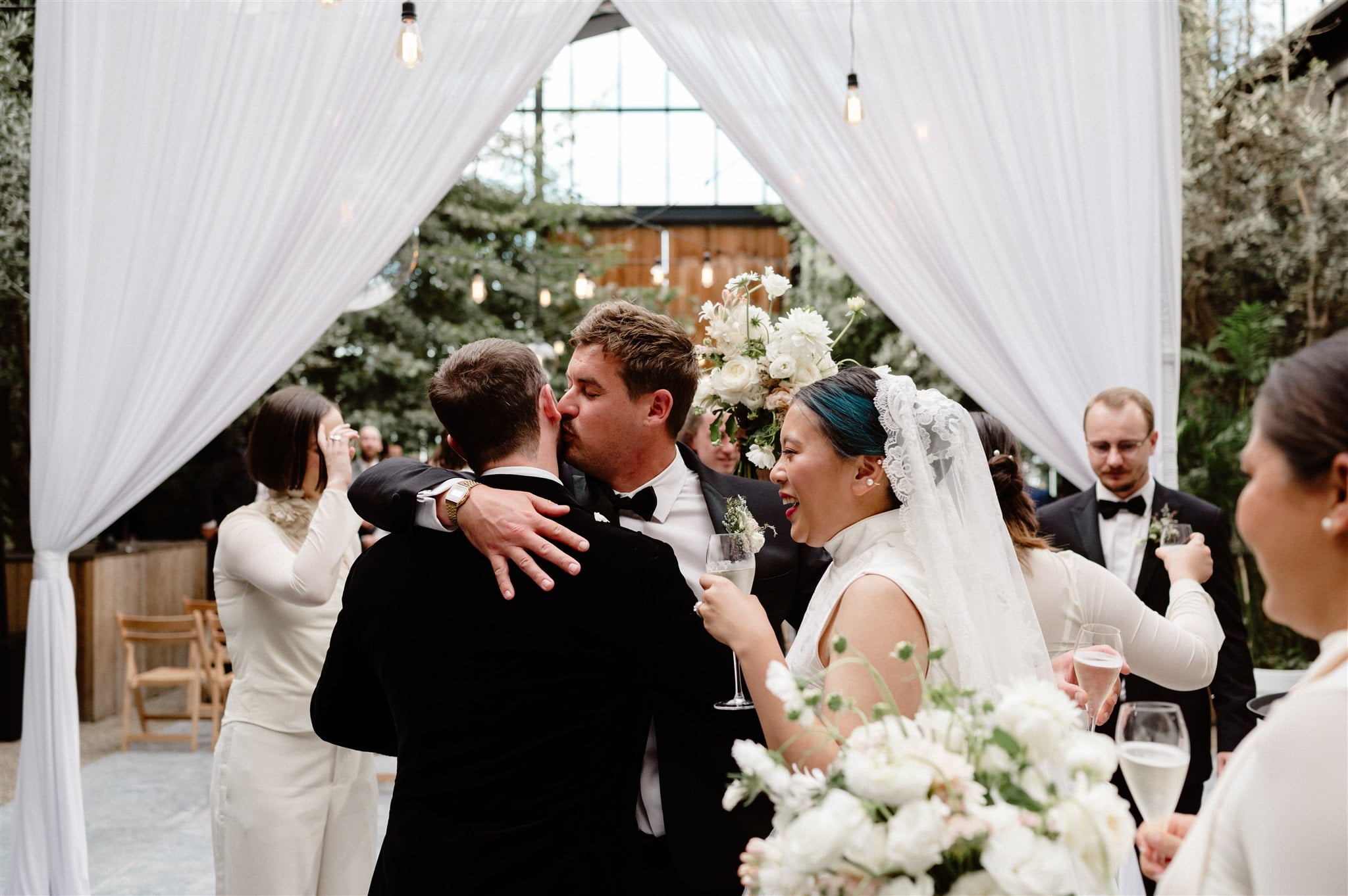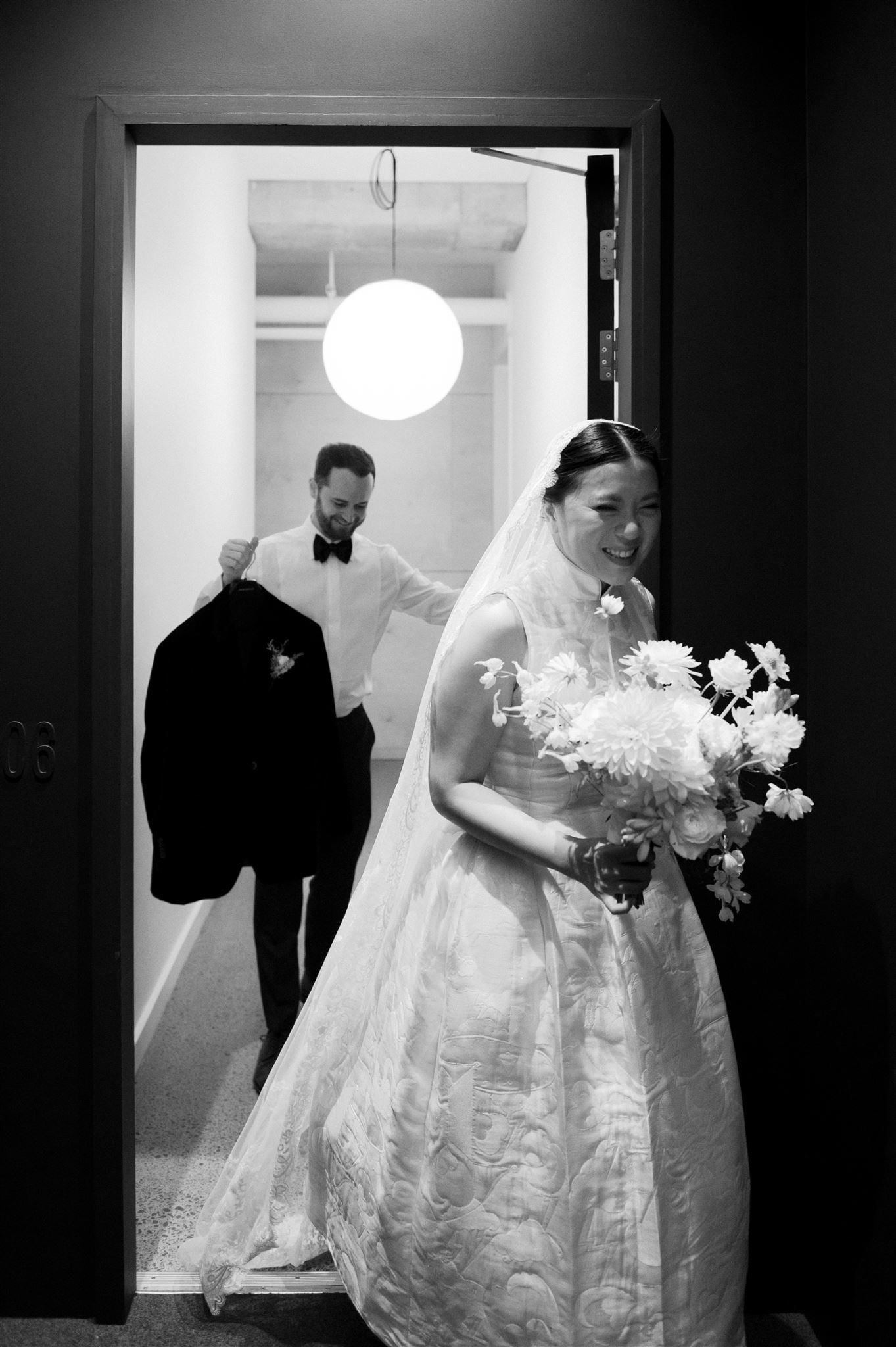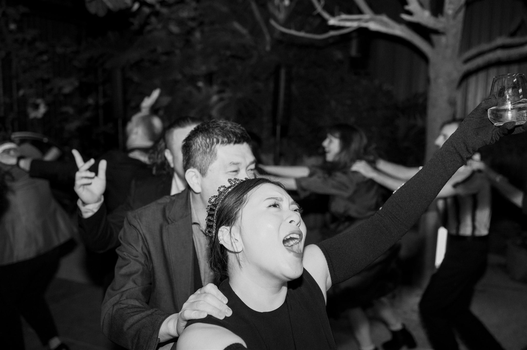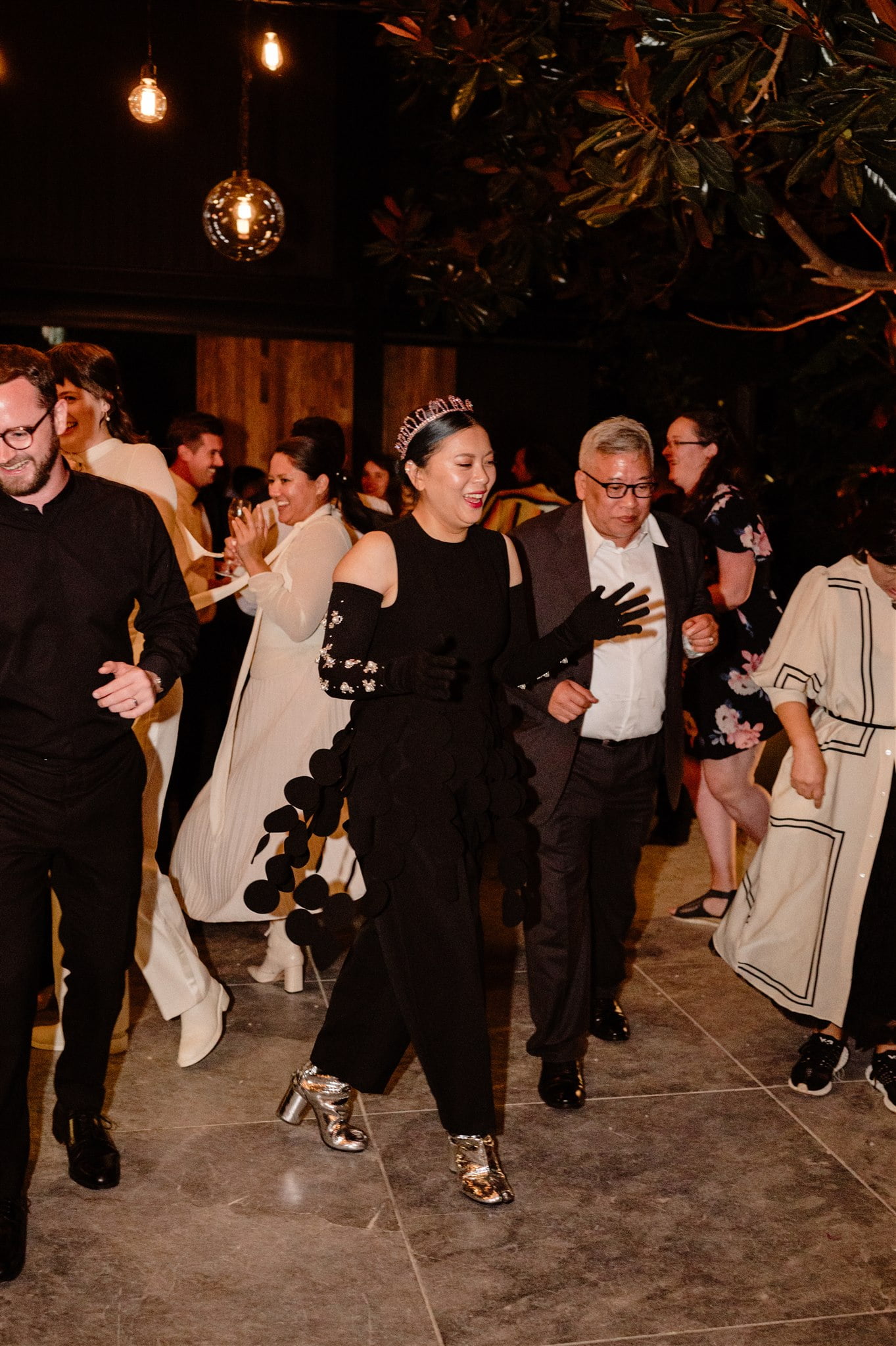 CONTRIBUTING VENDORS Photographer Kasia Kolmas Florist Kensal Stationery Design by Felix Lu (Melody’s brother) Ceremony & reception venue Glasshouse Food Trucks Toast with Tuki Cake Catroux Cake Topper Kensal Hire Items & signage Arkade Lighting Hire La Lumiere Entertainment DJ Sam Jones Celebrant Monica Mu Rings Hannah Cross Jewellery, Naveya and Sloane THE BRIDE Bridal gown designer Shiatzy Chen Reception outfit A.W.A.K.E Mode Veil Second hand Hair piece Simone Rocha Shoes Maison Margiela Accessories Hannah Cross Jewellery Hair Phillippa Hofman, Zoe Taylor Makeup Rae Sacha Fragrance Creed White Flowers Bridesmaid dresses Uniqlo, Zara THE GROOM Suit, shirt, tie & cufflinks Crane Brothers Black shirt PYE Shoes Joseph Cheaneys & Sons Watch Tissot Barber Christopher Huia Woods Groomsmen suits Frank Casey Suit hire