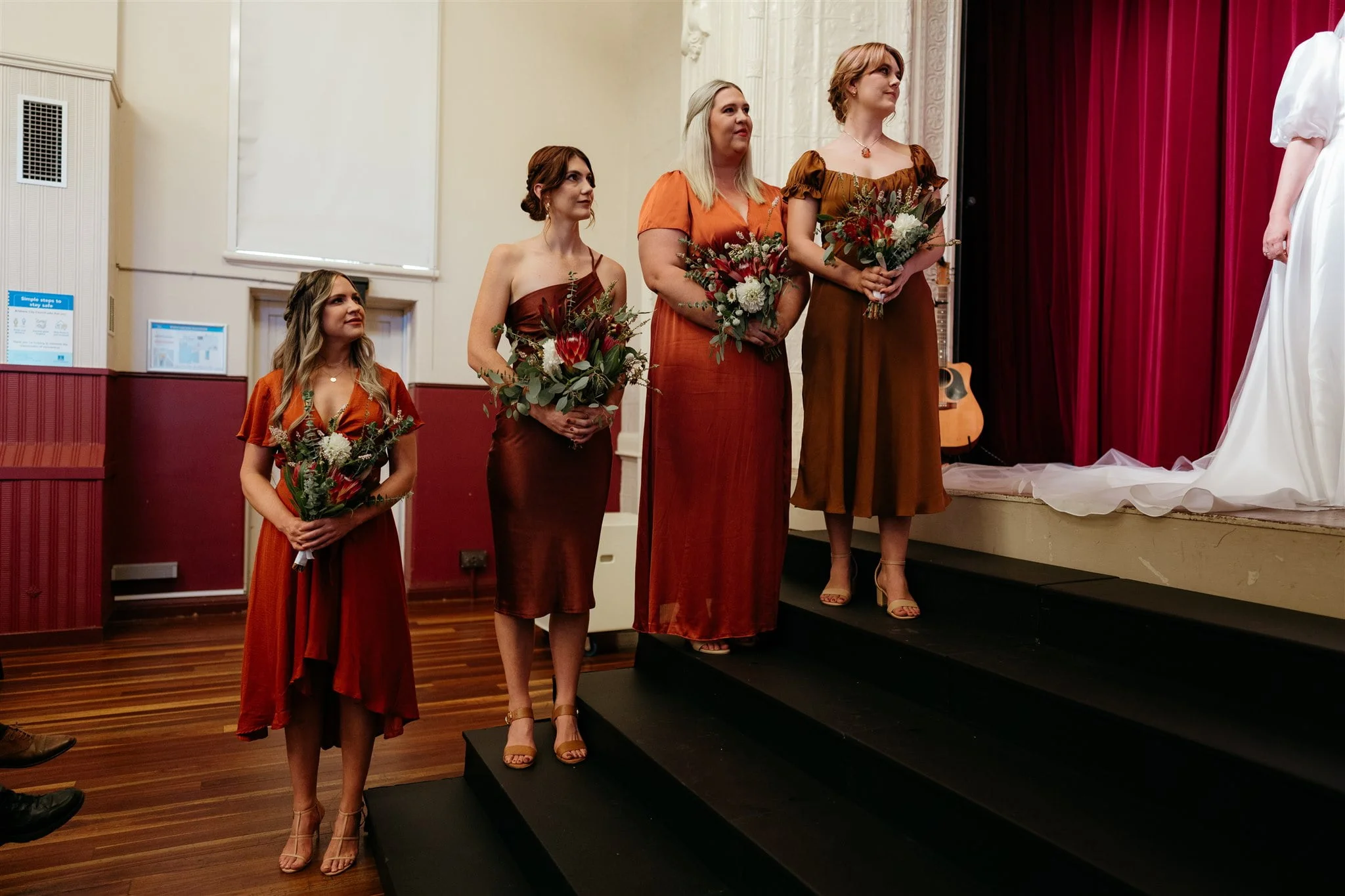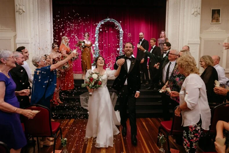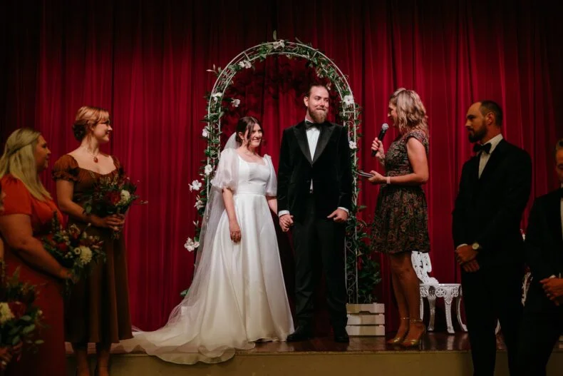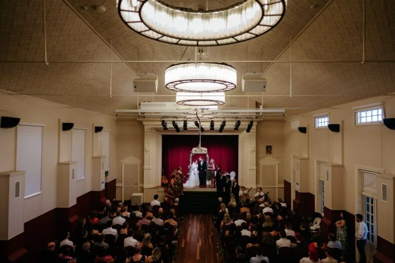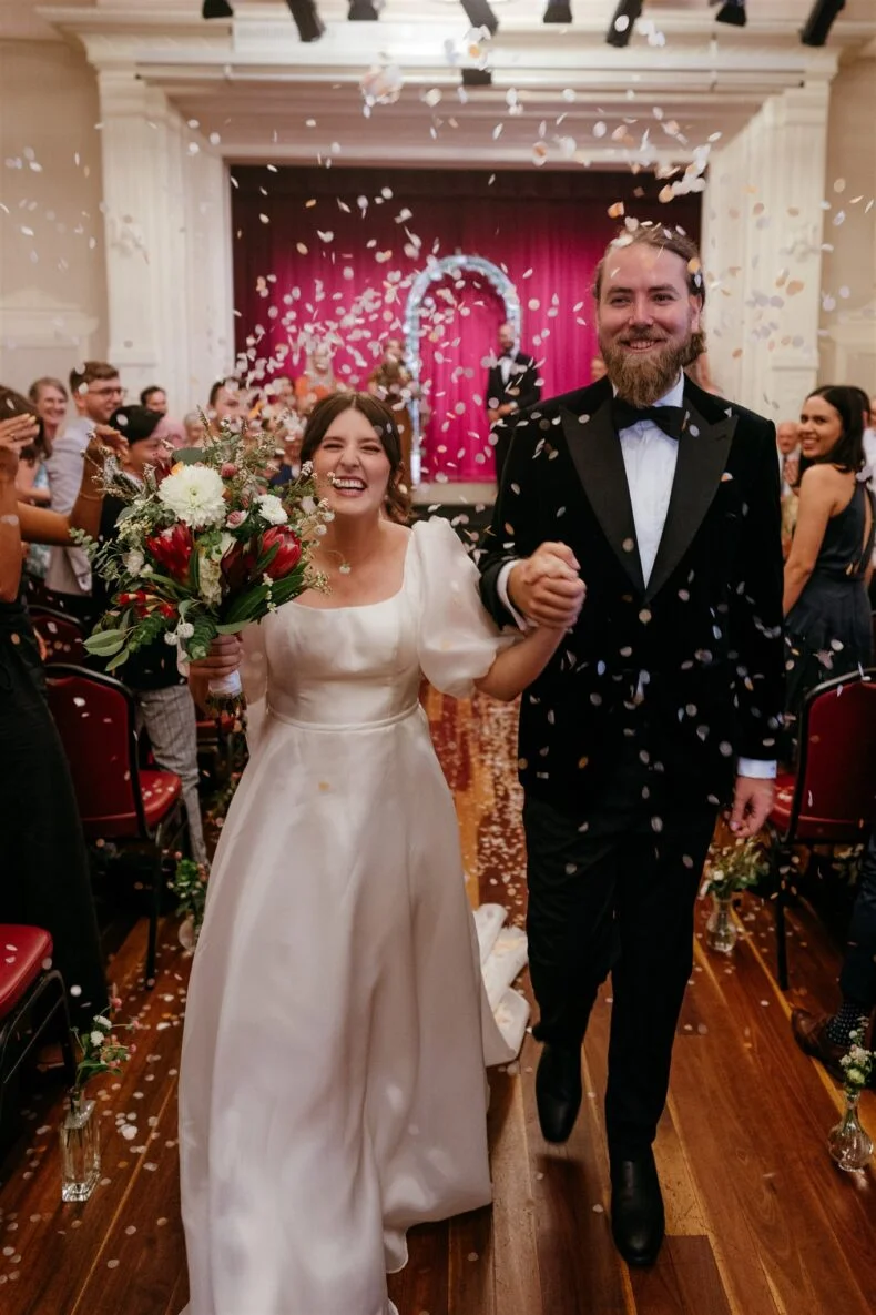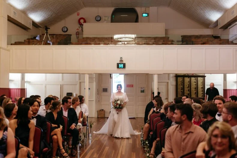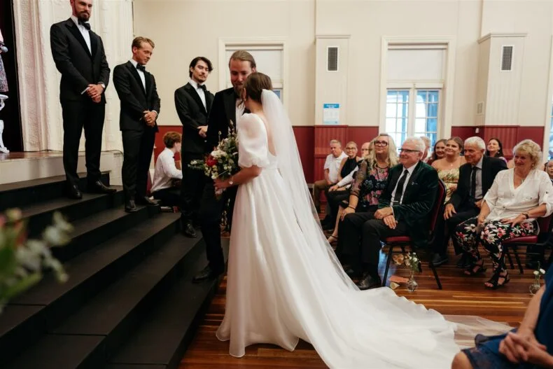 Married on their five-year anniversary at Sandgate Town Hall in Brisbane, Melita and Steele, frontman of Aussie band The Steele Syndicate, themed their wedding around joy! We LOVE that! “We are both music lovers and performers, so as the wedding planning continued phrases such as ‘night at the jazz club’ began to emerge,” the couple share. “At the end of the day, we were just aiming to plan an event which was both uniquely us and a great celebration – dancing to live music, eating good food and celebrating life and the start of a new chapter.”