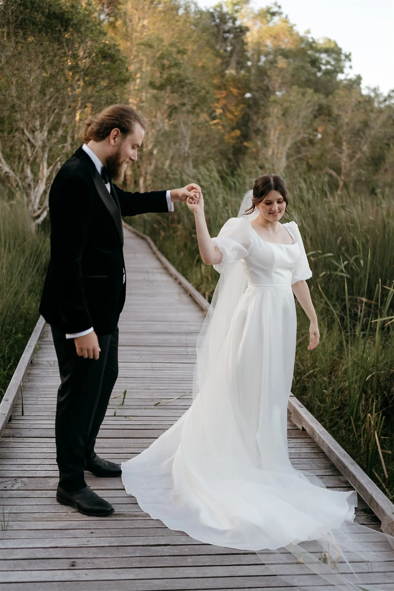 THE DRESS “My dress is quite classic, with an A-line falling skirt and fabulously puffy sleeves. I got it from Luv Bridal during my second fitting session, and knew it was perfect as soon as I put it on. All credit goes to my sister Bri who pulled it off the rack and knew it would look great on me when I had doubts! I loved the experience of trying on the dresses. I am not usually a shopping lover, but the excitement of having my mum, mother-in-law, sister and godmother there to rate each dress made it very fun. I also loved showing my Dad the pictures when I got home for a debrief.”