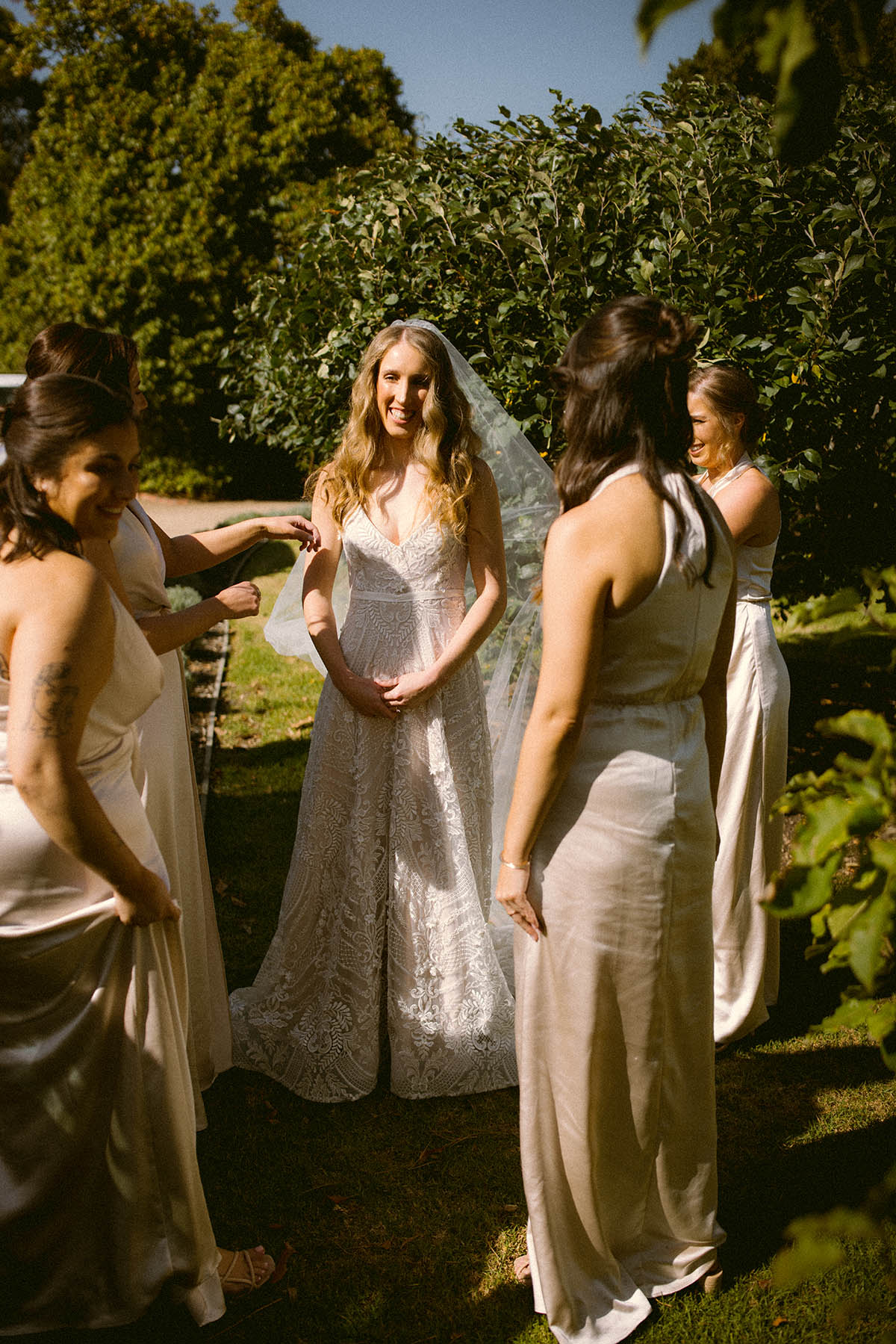 LITTLE LOL “There was a slight delay in me starting my walk down the aisle when my veil blew off. Lucky for us, our celebrant Shelley saved the day and put it back on, only for it to blow off again a few more times down the aisle and in the ceremony. It was a great ice breaker, everyone laughed it off and it made the moment feel relaxed.”