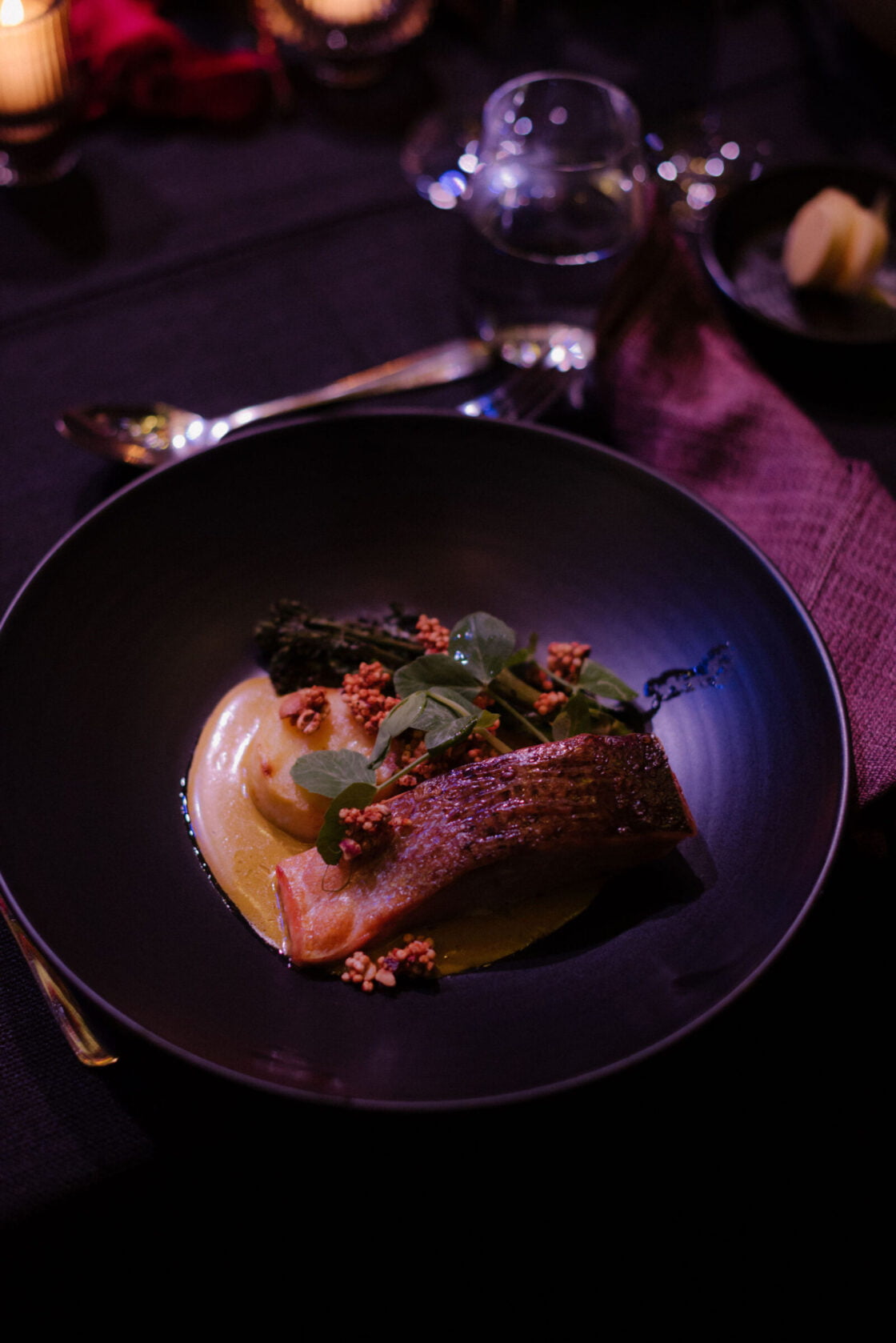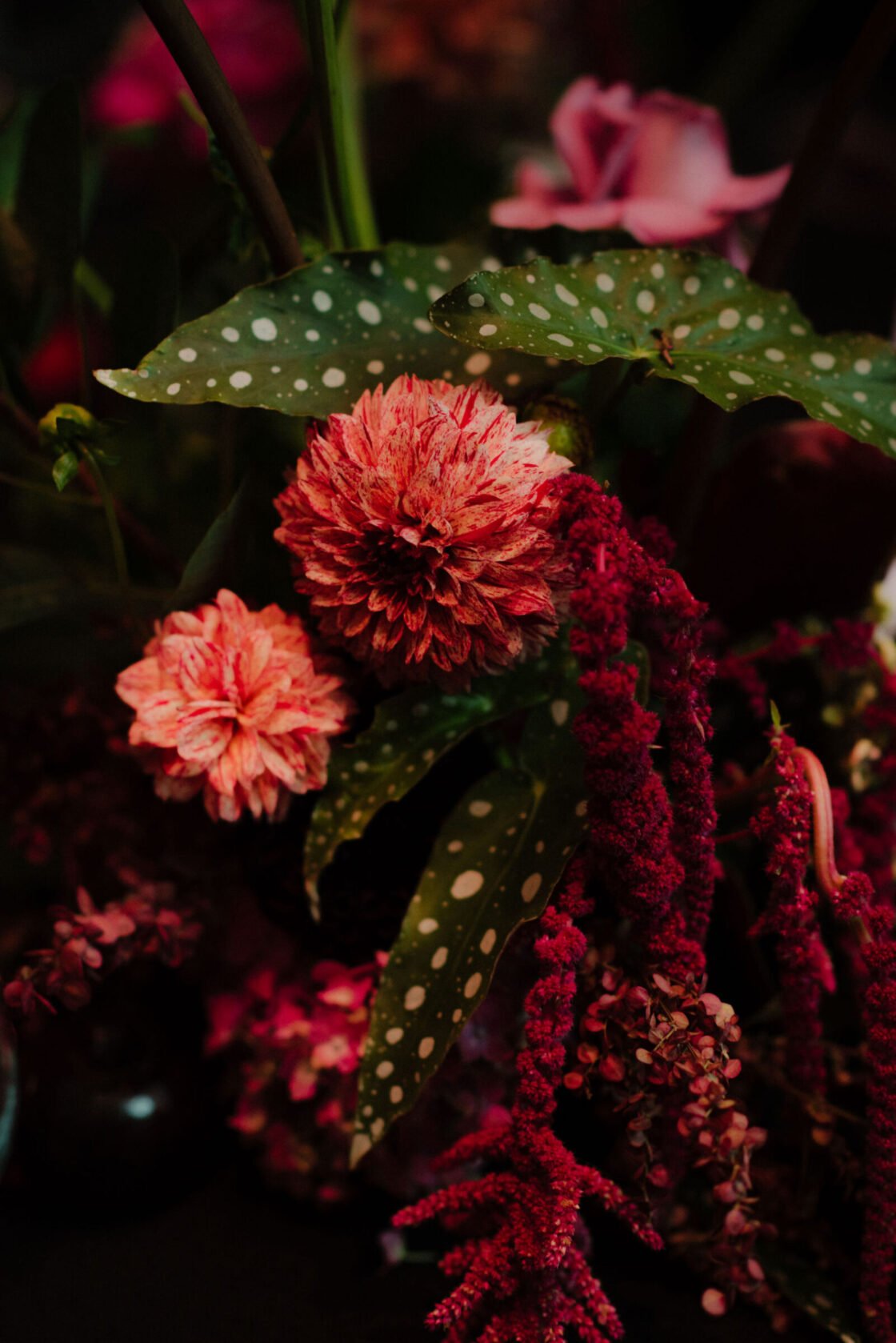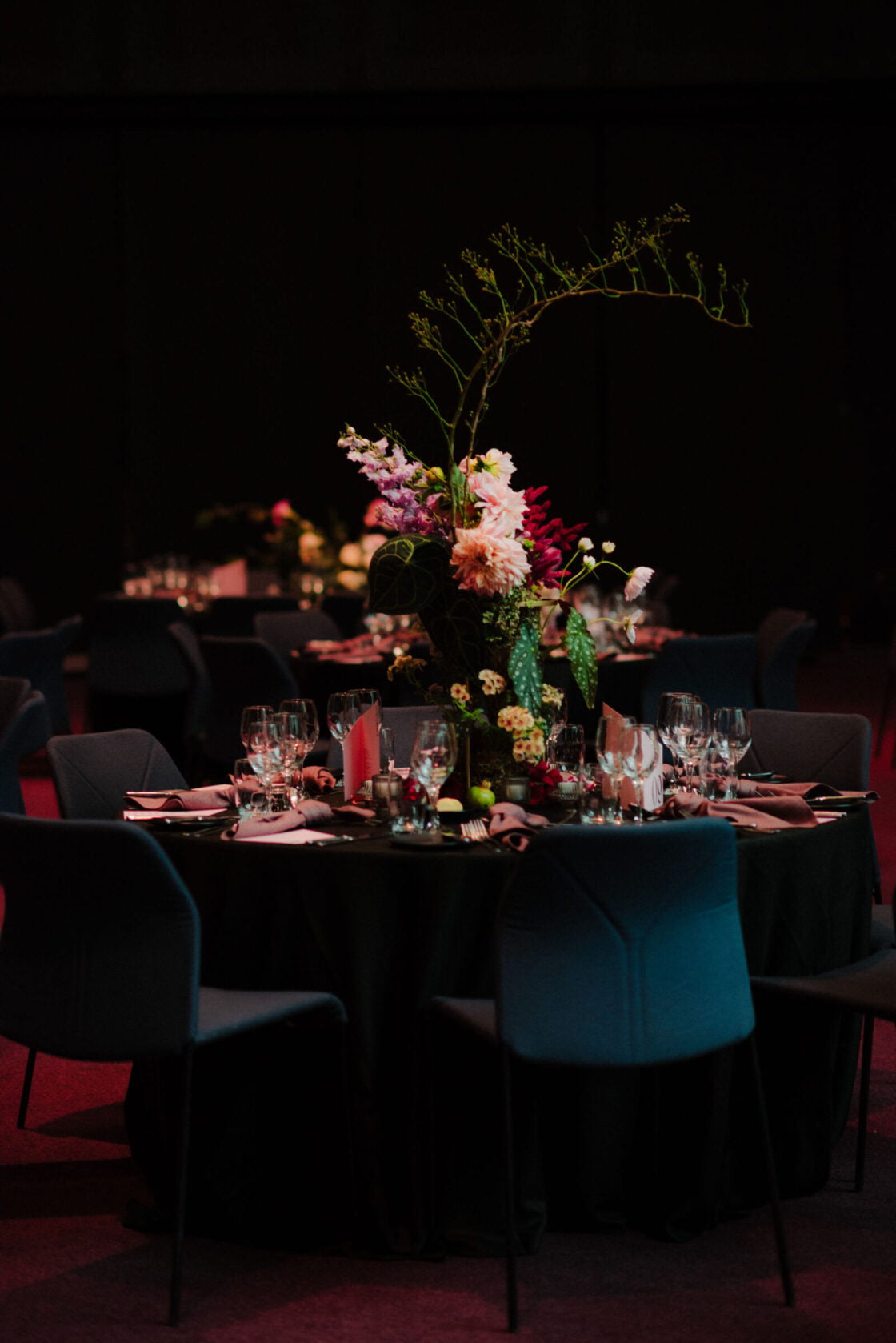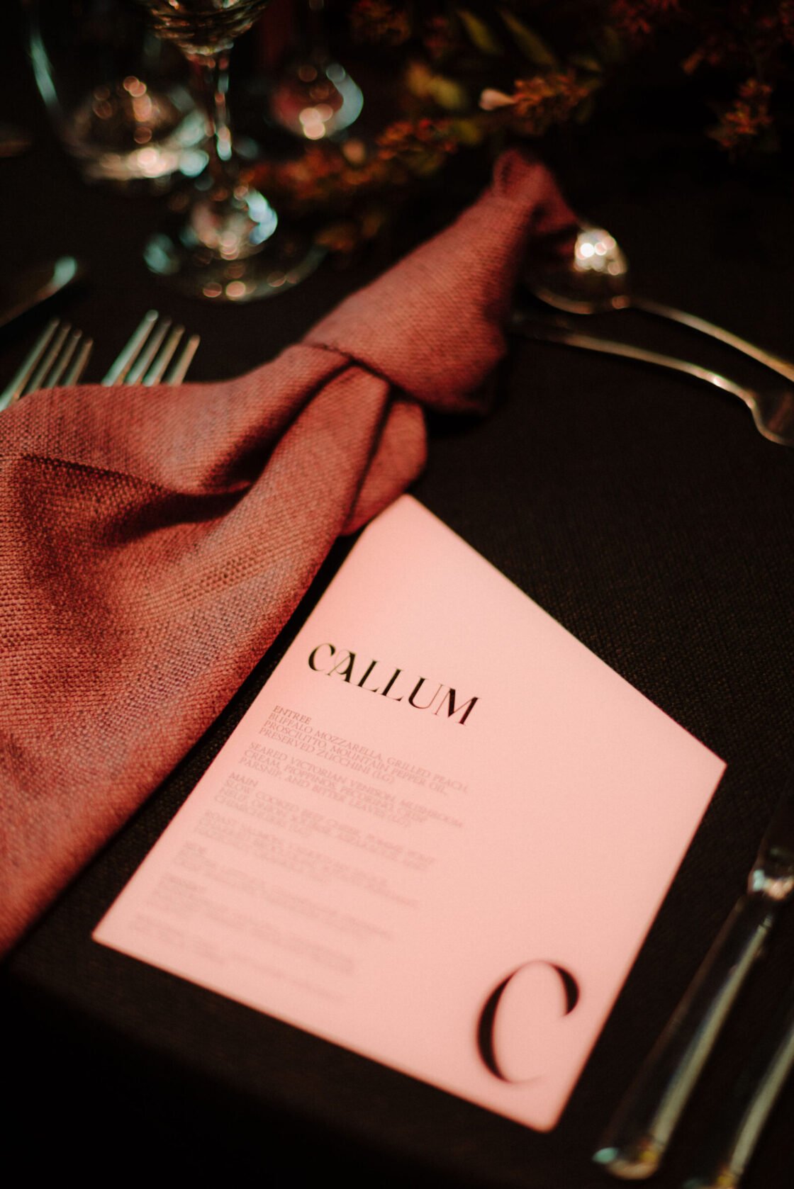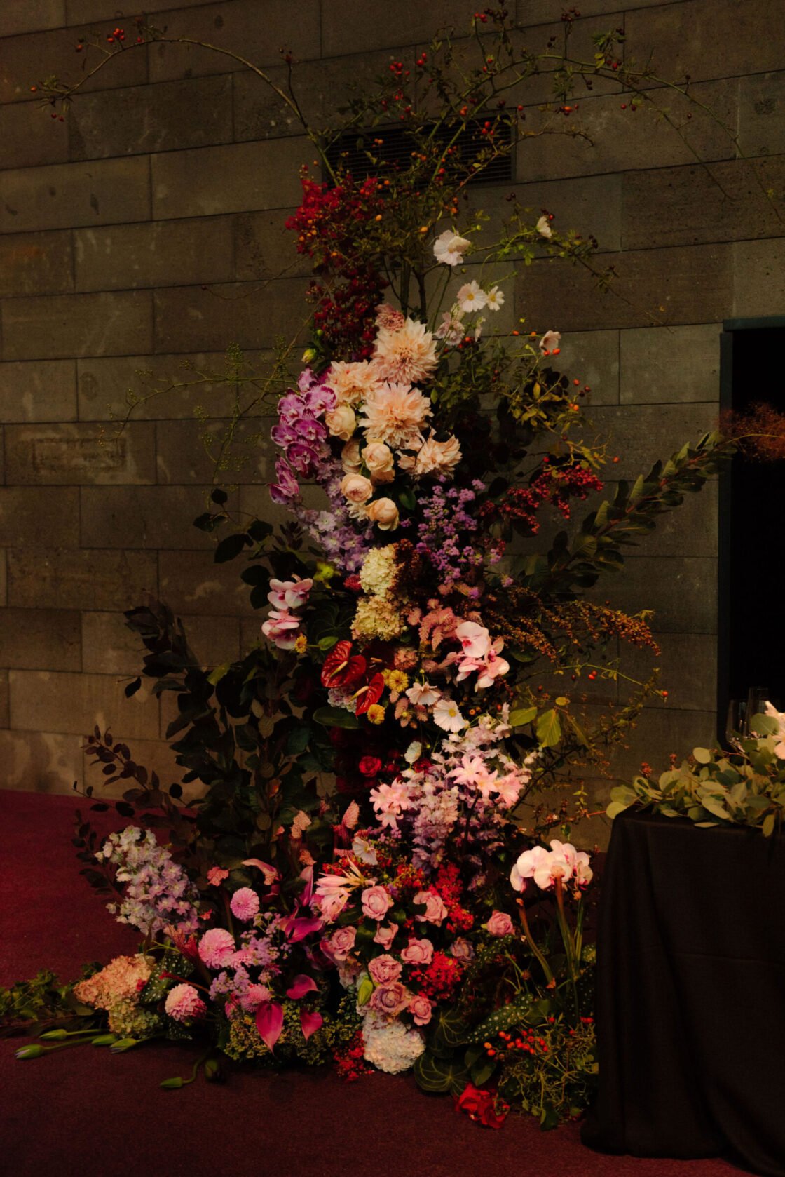 THE INSPO “The stained glass roof and the carpet of the Great Hall (NGV) – I wanted them to sing. Which is why we went with a romantic, moody theme with reference to Renaissance & Dutch still life paintings of Flower art. It was pretty overwhelming seeing the great hall for the first time (flowers, cake, table settings, place cards, napkins), this was something I was dreaming up for 18 months (and rescheduled three times). I didn’t have a stylist making decisions for me, I didn’t have a showroom to see what the table layout would look like, it was all in my head and seeing it come together was incredible.”