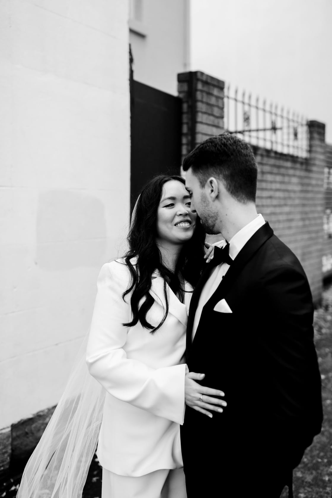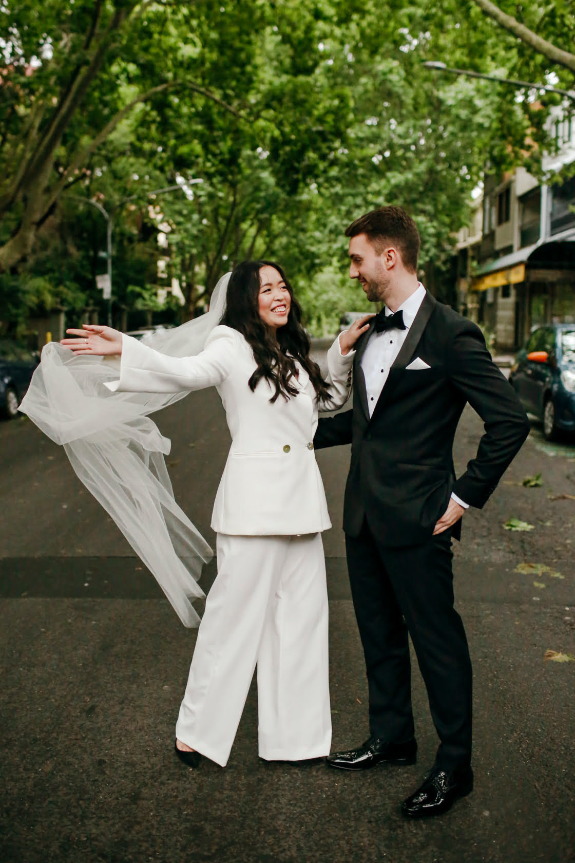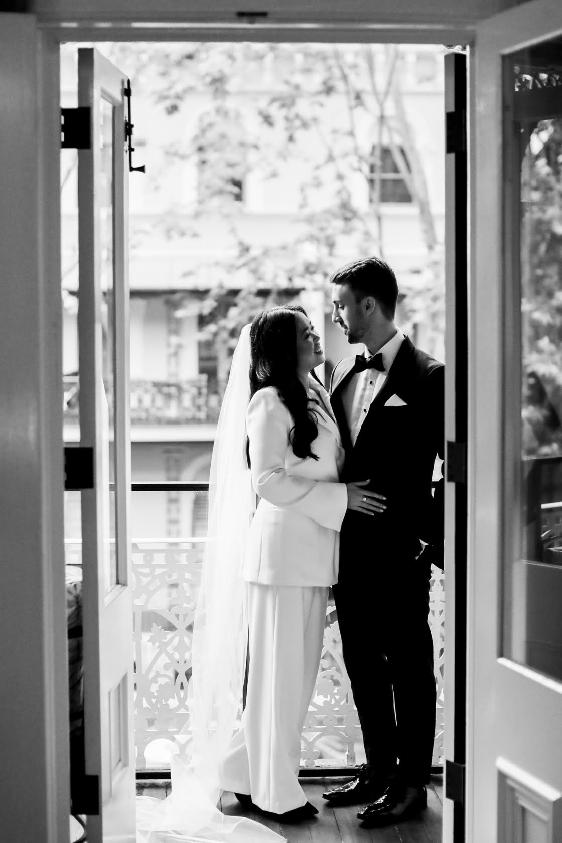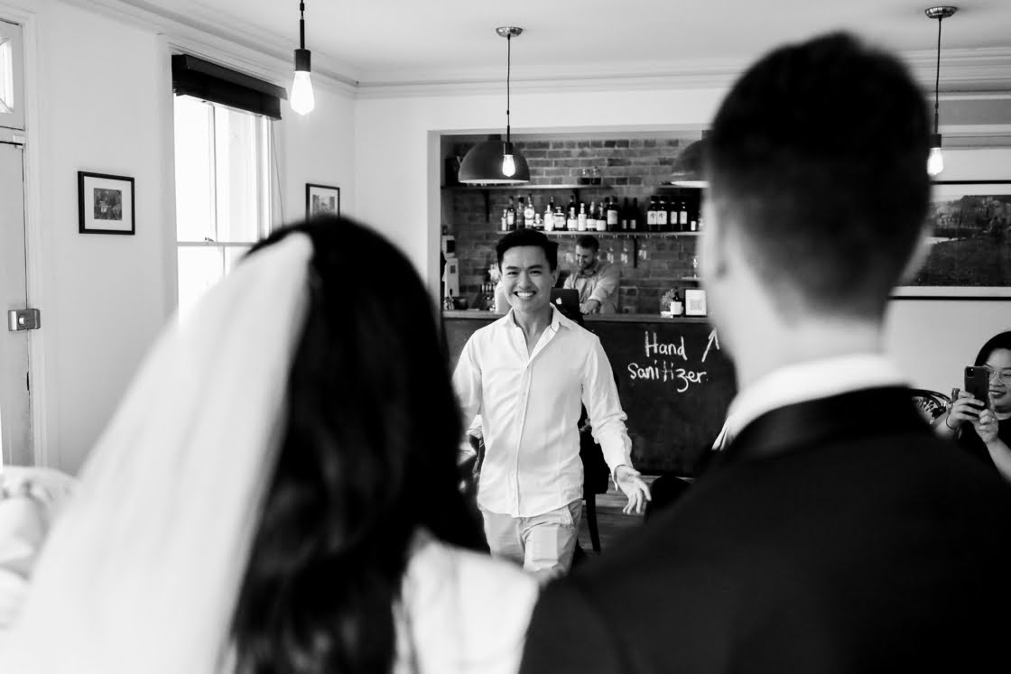 THE DRESS “Inspired by Bianca Jaggar’s Yves Saint Laurent bridal suit, four days before the wedding, Nic found Karen Willis Holmes’ Elopement Collection had a white suit and called up the head office asking for a miracle. Jazz from KWH found one suit left in the correct size, and Susan altered it last minute. KWH ladies are absolute lifesavers- they made Nic feel comfortable in her body – we cannot thank them enough. Nic fully encourages any bride with anti-bridal tendencies to consider a chic suit and get down to Karen Willis Holmes. Jamie bought his suit – a classic black tuxedo – from M.J. Bale after visiting a few other vendors with his groomsmen.”