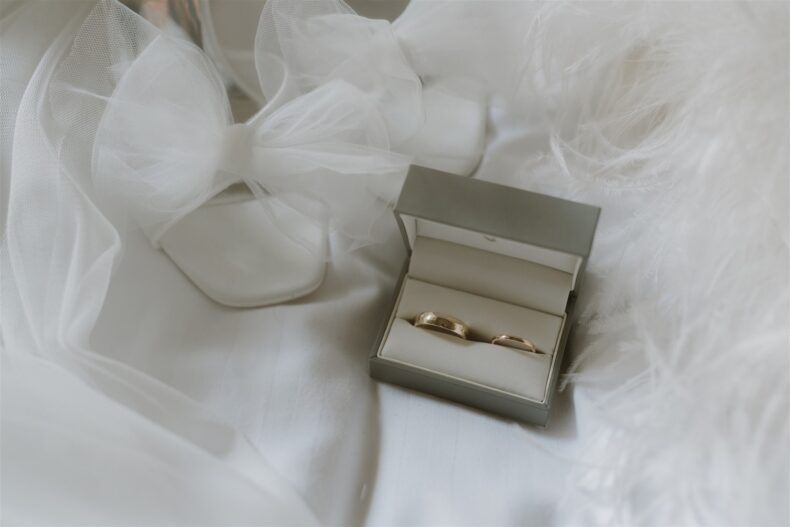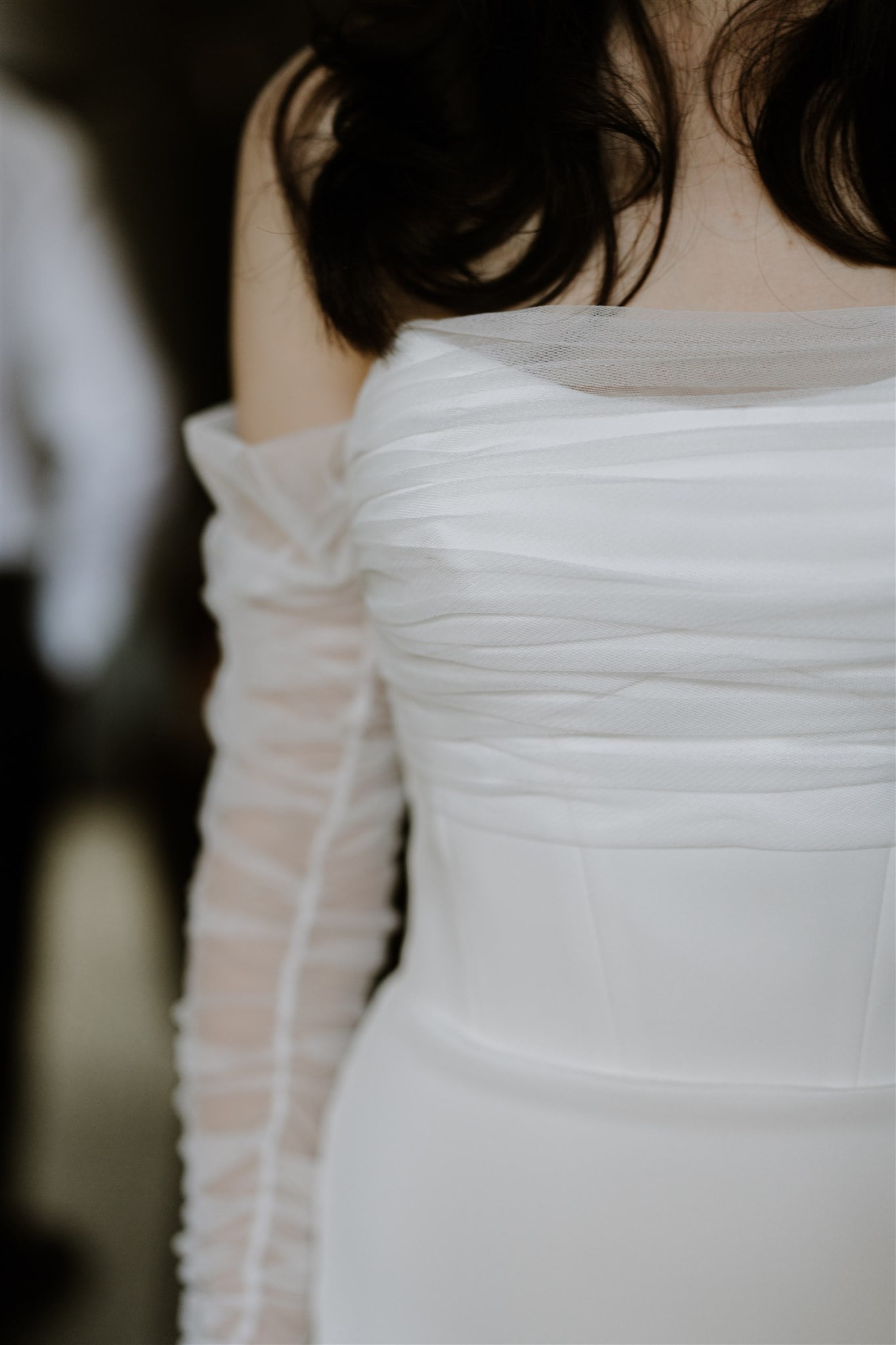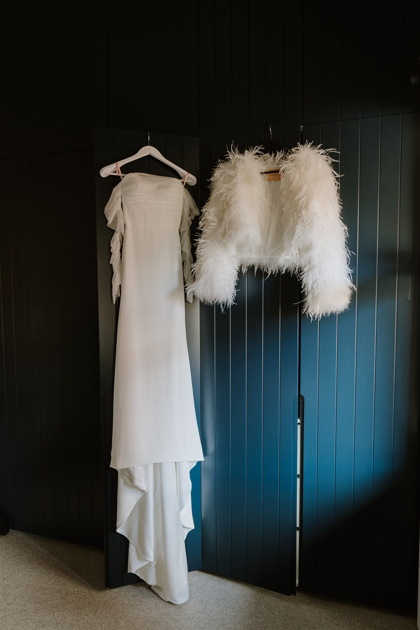 THE DRESS “My mum and I booked a consult at Kyha to begin the process of looking for a dress. However, as soon as I tried the Chosen by Kyha dress on, I knew it was the one for me and that I didn’t need to look anywhere else. The dress itself morphed into something even more elegant after the tailoring process with Tamara from My Private Tailor. After dinner I got changed into a pair of glam crepe flares from Karen Millen and a feather jacket from Bubish Luxe to take me from reception to after party.