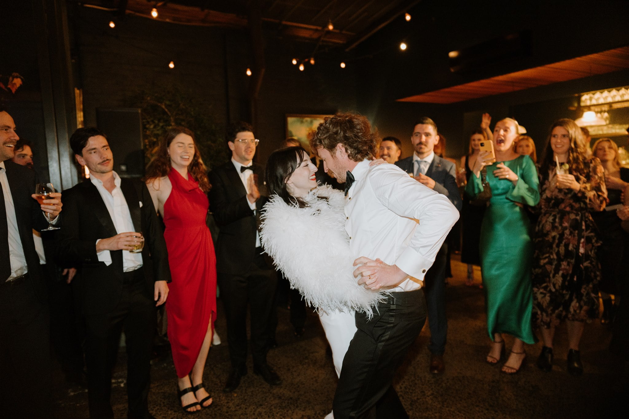 CONTRIBUTING VENDORS Photographer Elsa Campbell Event Planner & Stylist Bow Creative Florist Salt Flower Stationery & signage By Chloe Joy Ceremony & reception venue Rupert on Rupert Cake Katielous Cakes Hire items Table Threads, The Small Things Co, Rupert on Rupert, Bow Creative Lighting Hire DJ Warehouse Hire Entertainment Hello Seani Celebrant Precious Celebrations Rings Raphael Jewellers Transport Oxford Street Garage Recovery party venue Killing Time Bar THE BRIDE Ceremony dress & veil Chosen by Kyha Shoes Badgley Mischka Reception top I Love Gia Pants Karen Millen Jacket Bubish Luxe Hair Teagan Cousins Makeup Cara Jade Makeup Bridesmen suits P Johnson Bridesmen gifts Pro Tooling THE GROOM Suit, shirt, cufflinks & groomsmen suits P Johnson Tie M.J. Bale Shoes Loake