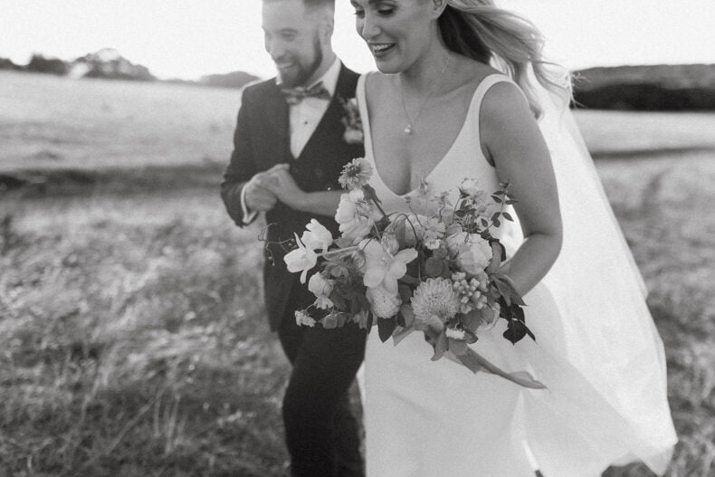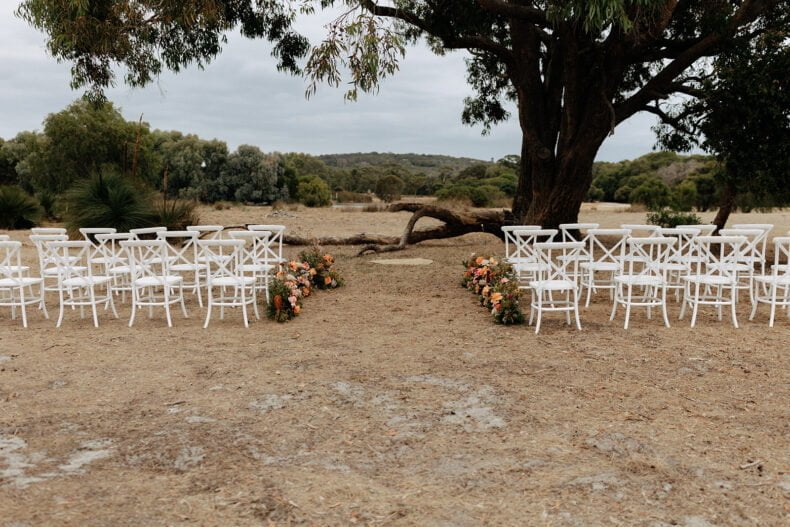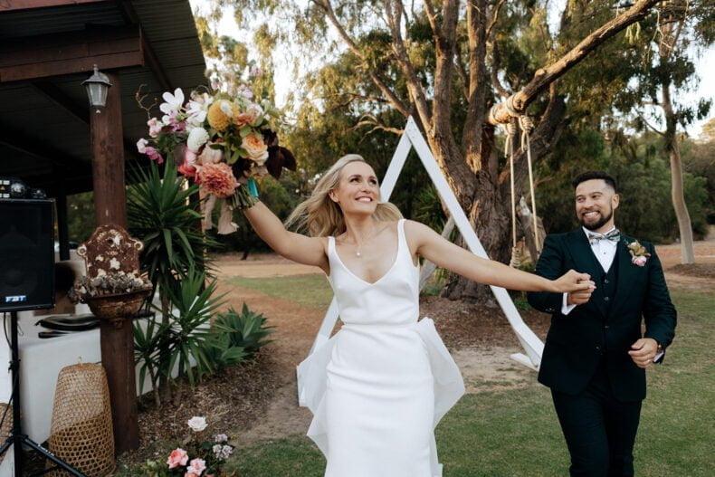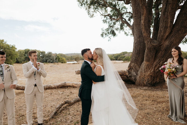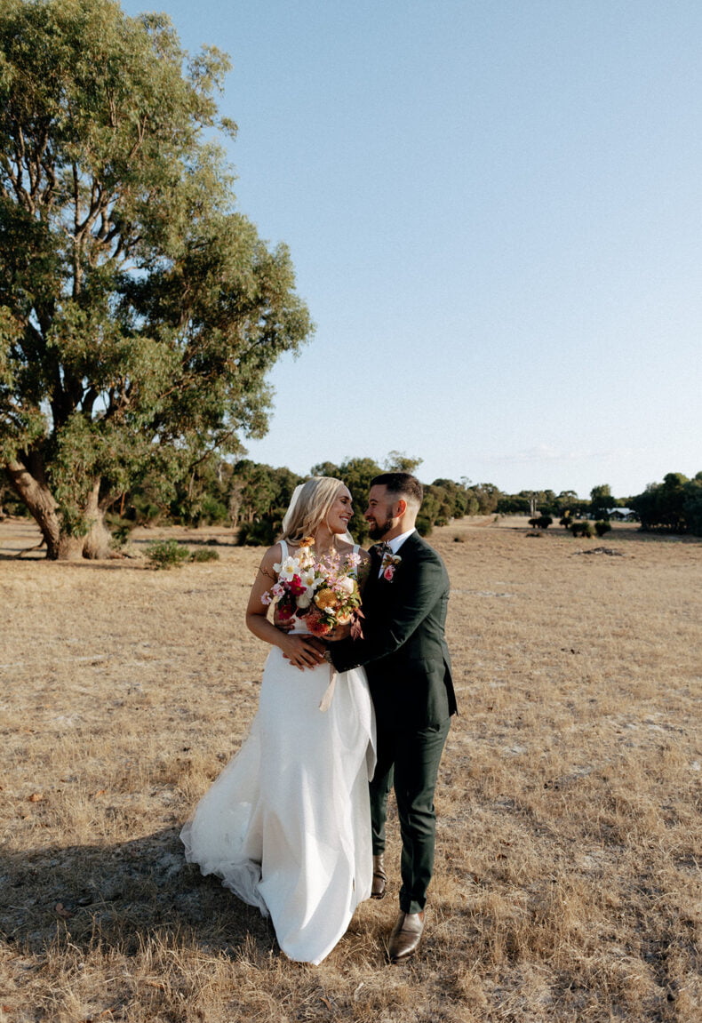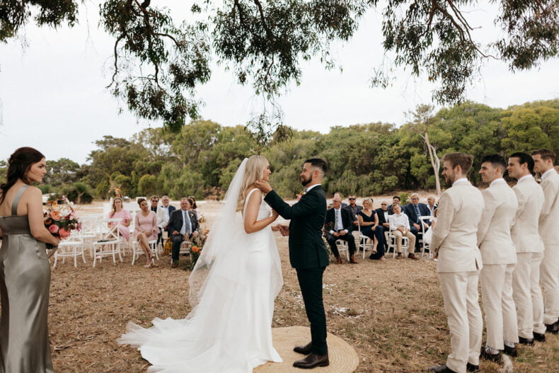 Engaged on their 11-year anniversary, Sarah and James’ Margaret River wedding was inspired by an intimate garden party, “where the overall vibe was one of warmth and connection,” says the bride. “Emma MacAulay, our photographer, said it best when she said ‘the small, intimate wedding that just felt like a big hug’.” LOVE it! The couple not only had the good sense to enlist the wonderful Emma for their day of days, but they also killed it in the fashion stakes. Sarah rocked the Karen Willis Holmes Shelby gown, while James opted for a green Theodore suit, with a bow tie from our pals at Peggy and Finn. Twas’ a magic celebration all round, scroll on down to see for yourself…