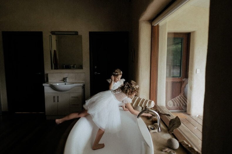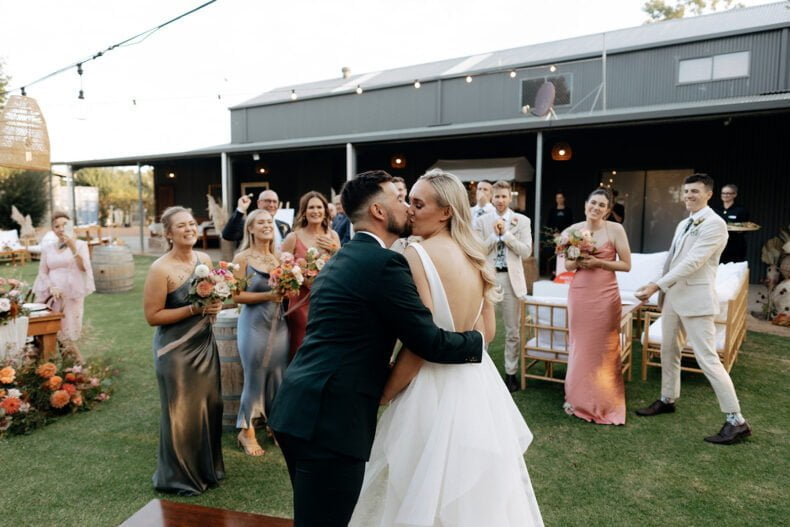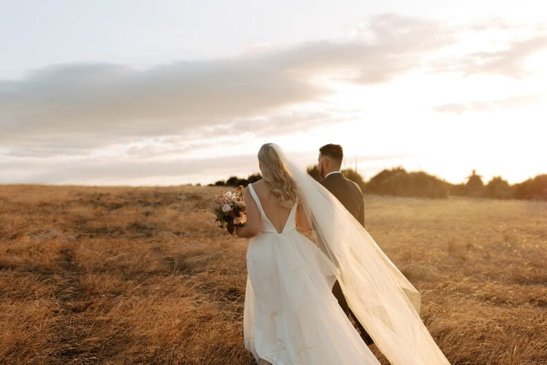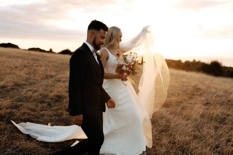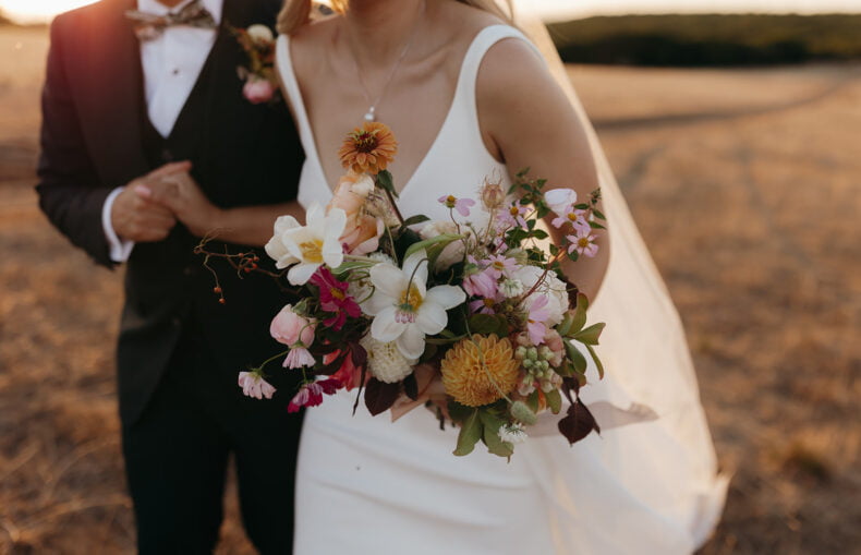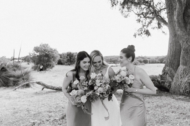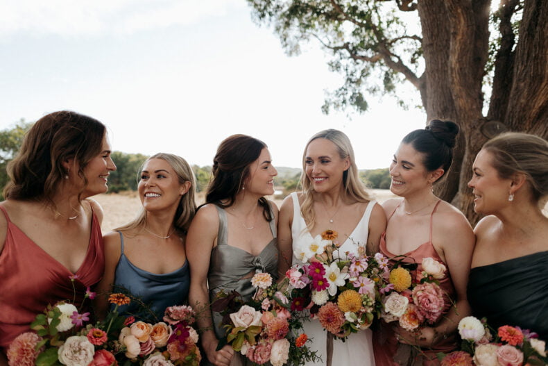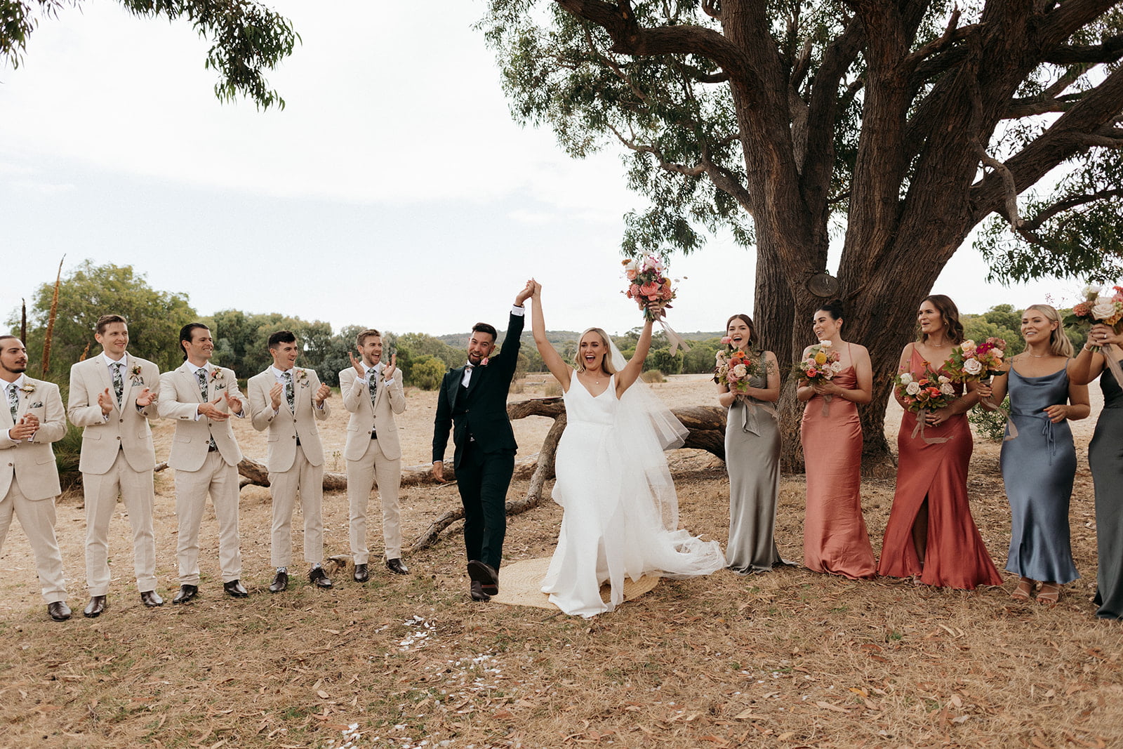 Engaged on their 11-year anniversary, Sarah and James’ Margaret River wedding was inspired by an intimate garden party, “where the overall vibe was one of warmth and connection,” says the bride. “Emma MacAulay, our photographer, said it best when she said ‘the small, intimate wedding that just felt like a big hug’.” LOVE it! The couple not only had the good sense to enlist the wonderful Emma for their day of days, but they also killed it in the fashion stakes. Sarah rocked the Karen Willis Holmes Shelby gown, while James opted for a green Theodore suit, with a bow tie from our pals at Peggy and Finn. Twas’ a magic celebration all round, scroll on down to see for yourself…
