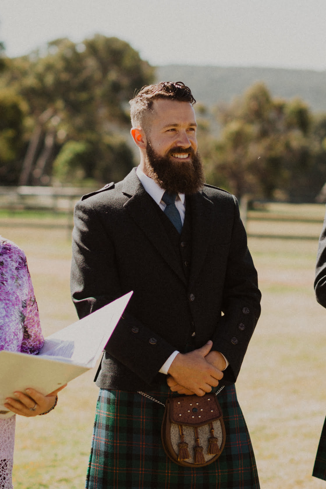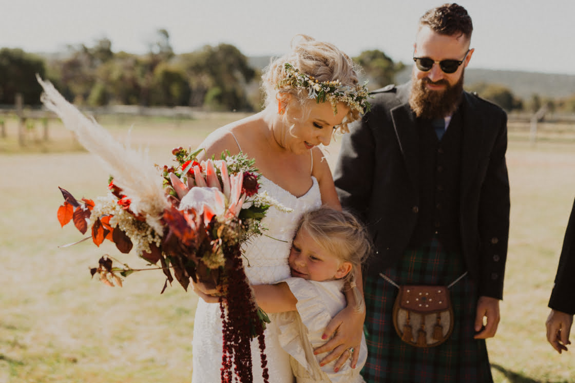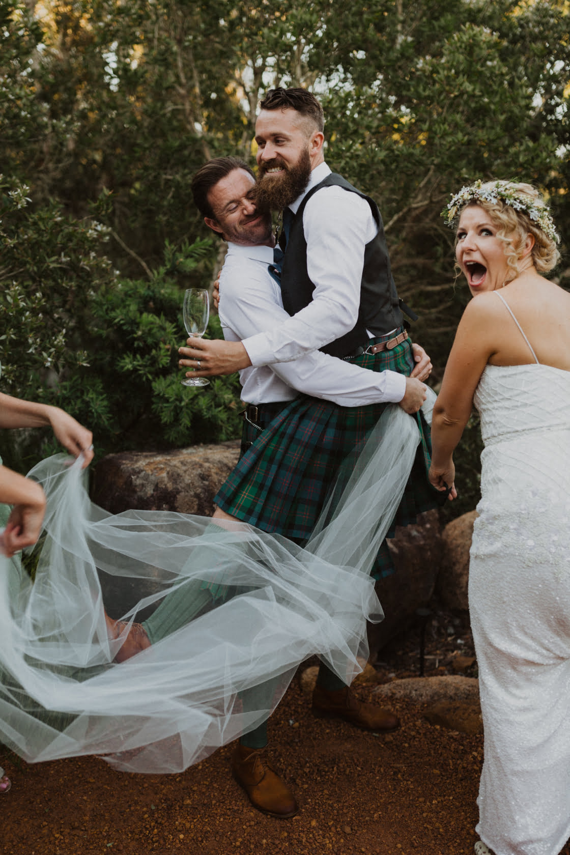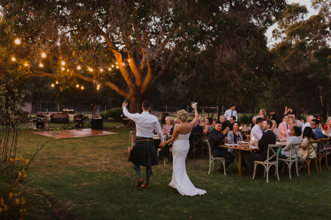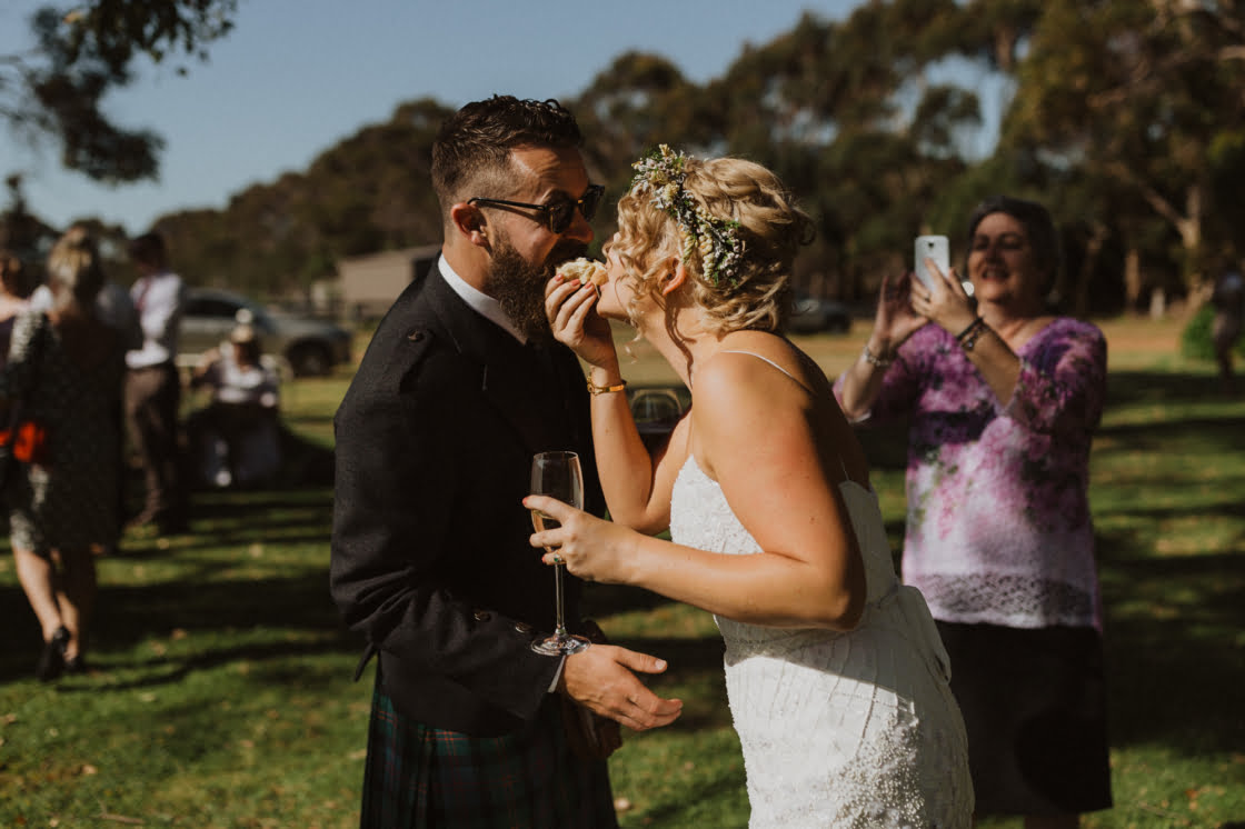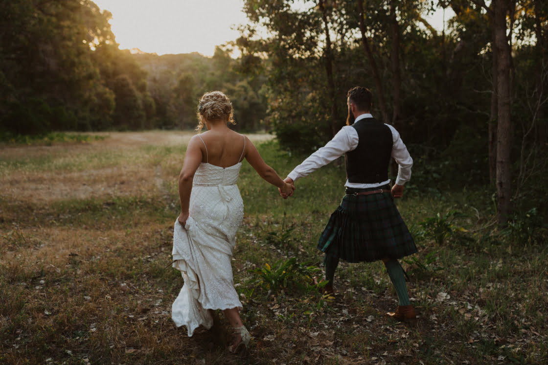 When Sarah and Sam decided to tie the knot they knew that incorporating their Scottish heritage throughout was a must. Think bagpipes, kilts and one very handsome cavoodle (complete with tartan cravat). Monty, the couple’s doggo, even underwent successful graded exposure training to bagpipes, not barking once throughout the ceremony. What a legend! Scroll down for some pretty freaking fabulous golden hour portraits, a bride decked out in Karen Willis Holmes and the cake to rule all cakes. Paris Hawken’s snaps are something spesh…