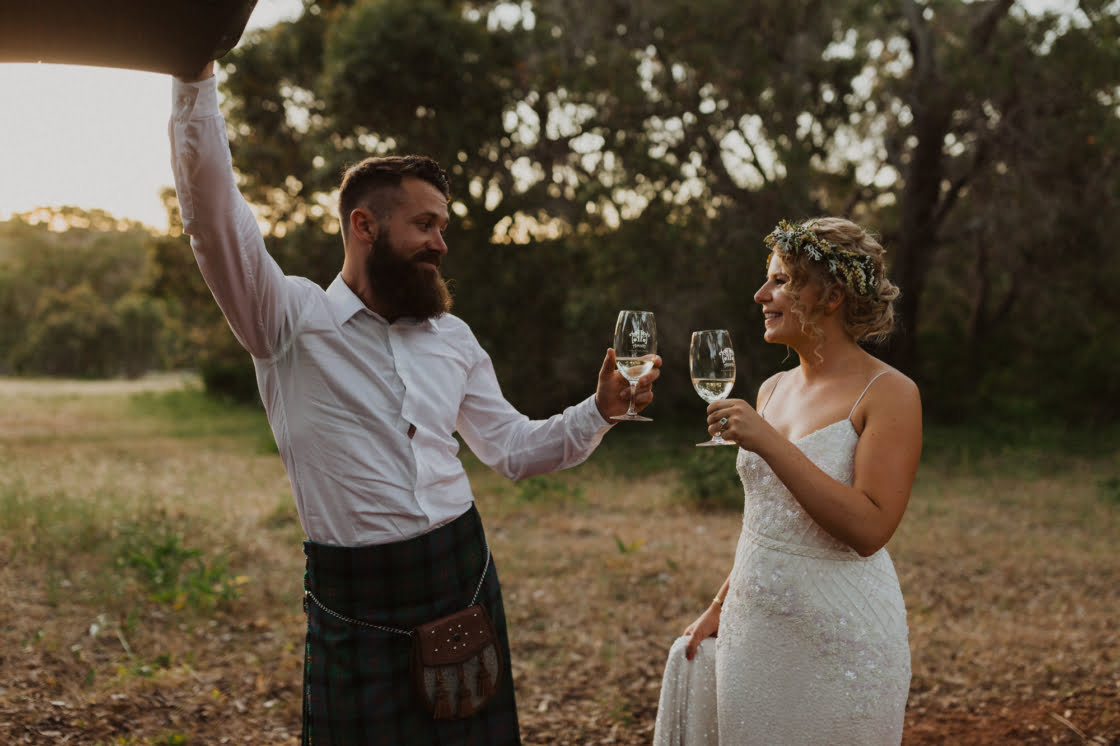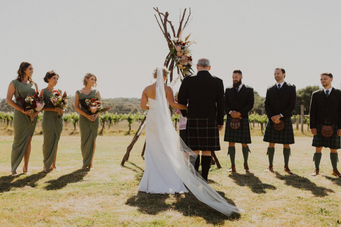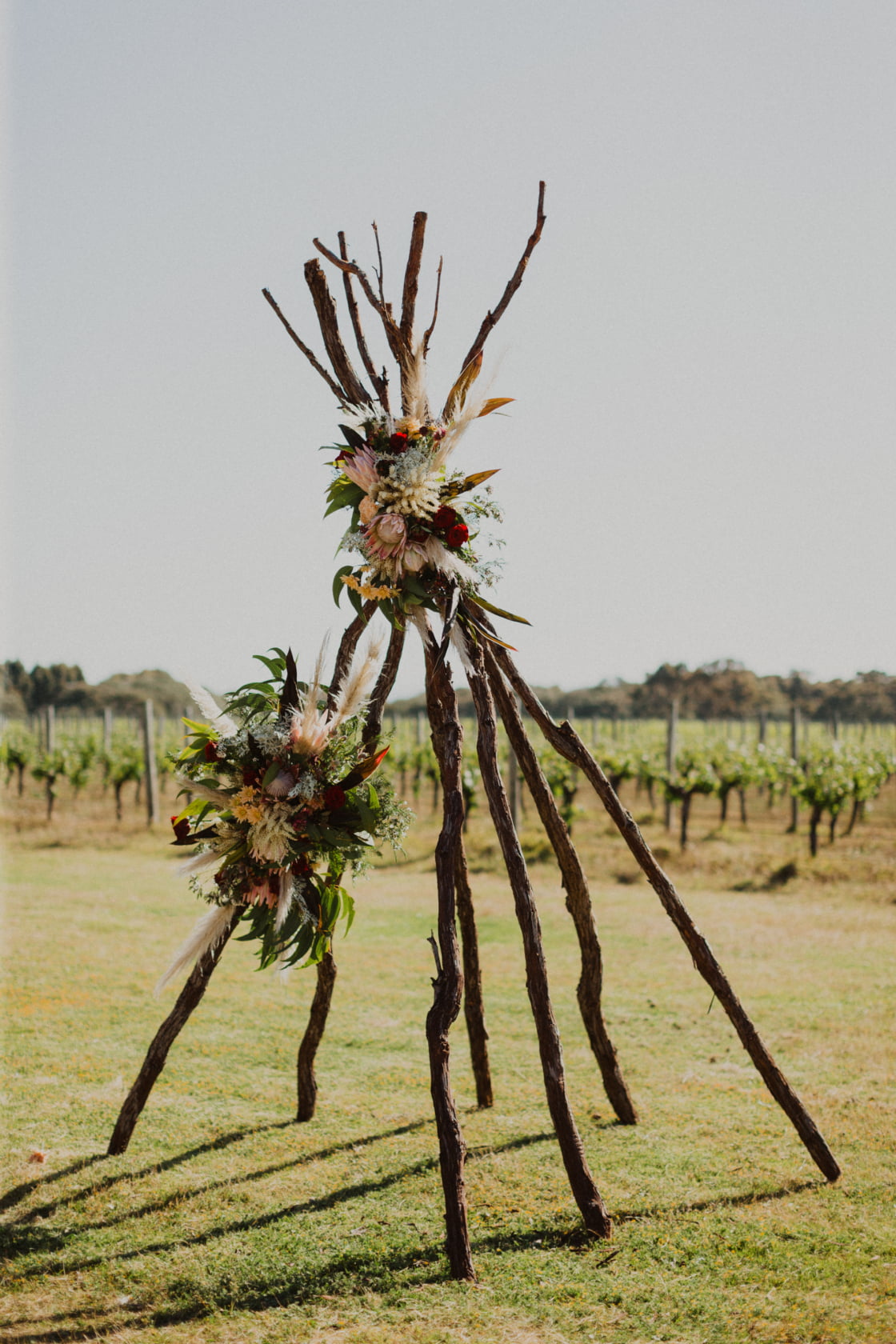 FAVOURITE DETAILS “We got really lucky with the weather as there were storms the weekend before, however, Margaret River really put on a show. The ceremony was outside backed by vines and our homemade tepee arbour adorned with Australian natives.”