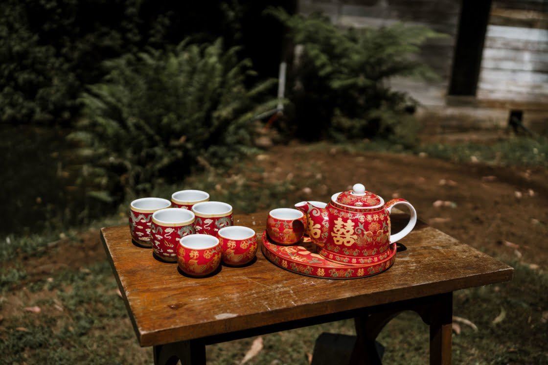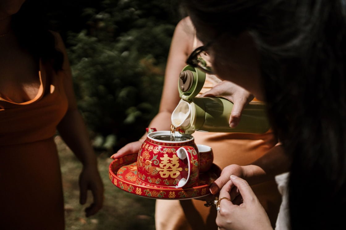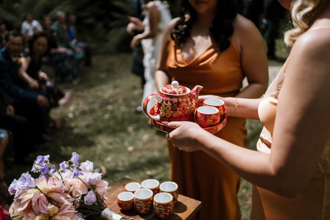 TAKE ON TRADITION “It was really important for us to incorporate a tea ceremony, which is an Asian tradition where the bride and groom serve tea to their parents and other family members to show respect and gratitude for all the years of love and care. In return, the couple receives well wishes in the form of gold jewellery or a red packet filled with money, which symbolises the union of the two families. We chose to do a more relaxed style tea ceremony which was incorporated into the main ceremony for all our guests to witness.”